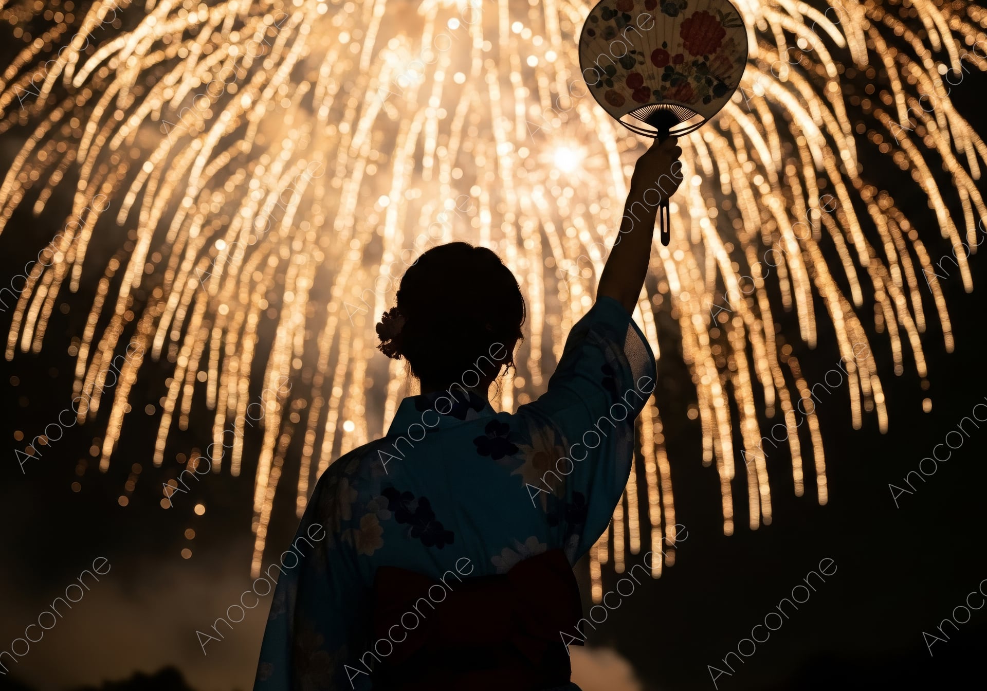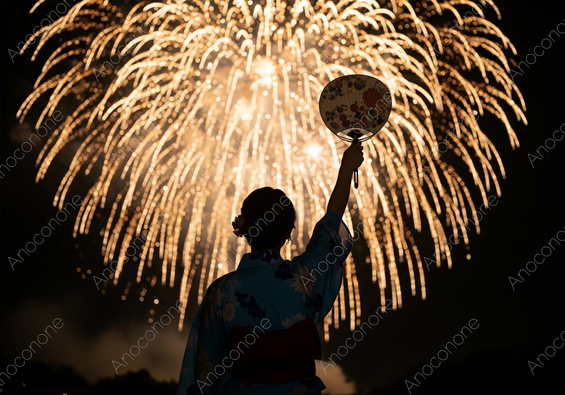 画像素材:夜空を埋め尽くすほどダイナミックに打ち上がった黄金色のしだれ柳花火を背景に、浴衣を着た女性が後ろ姿で佇む幻想的なカットです。女性は右手に花柄があしらわれた風情ある団扇を高く掲げ、まるで見事な大輪の花火を讃えているかのような印象を与えます。淡い水色地に花模様が描かれた浴衣は、夜の闇の中でも上品に浮かび上がり、赤色の帯が後ろ姿のアクセントとして美しく映えています。頭上から降り注ぐような光の筋は非常に繊細で、夏の夜の熱気と静寂が共存する特別な瞬間を鮮明に切り取っています。被写体がシルエットのように見える構図は、見る者の想像力を掻き立て、情緒豊かな物語を感じさせます。夏の観光キャンペーンやイベント告知、季節のグリーティングカードなどに最適な一枚です。
