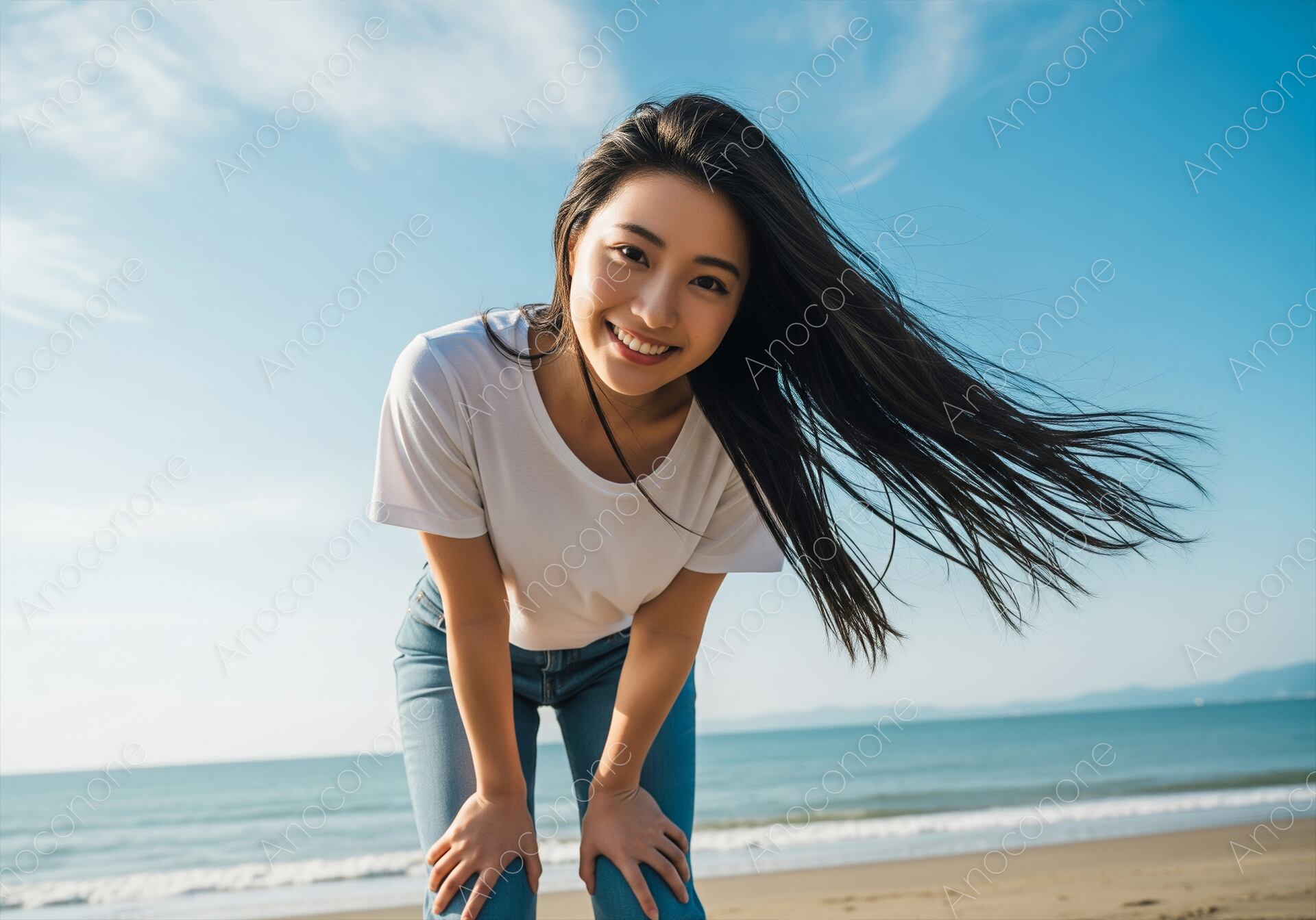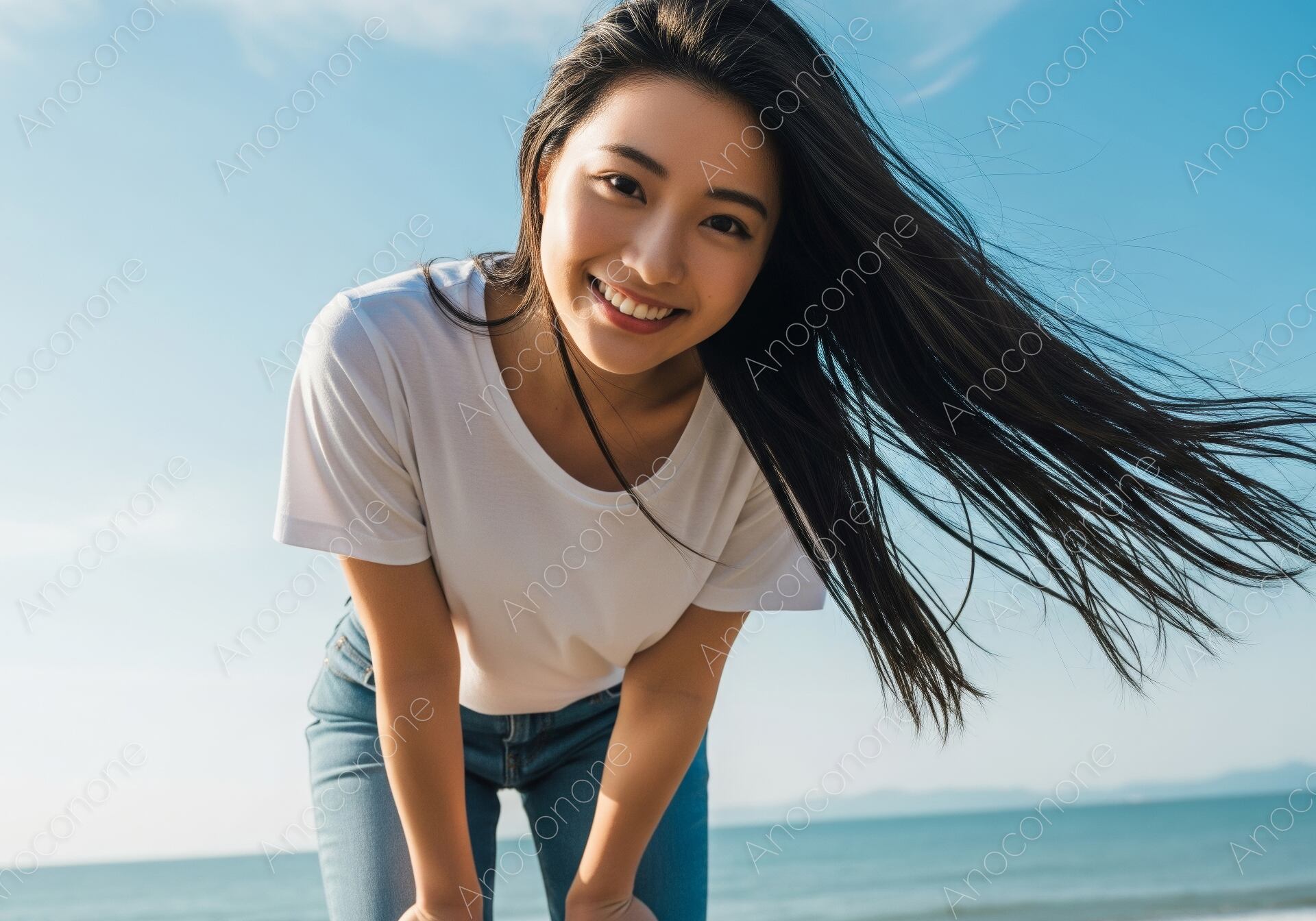画像素材:澄み渡る青空と穏やかな水平線が広がる開放的なビーチで、カメラに向かって親しみやすい笑顔を向ける女性のポートレートです。白いTシャツとデニムというシンプルで清潔感のある装いが、飾らない自然体な魅力を最大限に引き立てています。少し前かがみになりながらこちらを覗き込むようなポーズが、見る人に明るく活動的な印象を与え、潮風にさらさらとなびく長い黒髪が波打ち際の空気感をリアルに演出しています。太陽の光をいっぱいに浴びた健康的な肌の質感や、澄んだ空の色とのコントラストが美しく、透明感あふれる高品質なビジュアルに仕上がりました。余計な装飾を削ぎ落としたナチュラルな構図は、非常に汎用性が高く、様々なメディアに馴染みます。夏の観光プロモーションやライフスタイル雑誌、爽やかさを強調したいWeb広告のメイン素材に最適な一枚です。