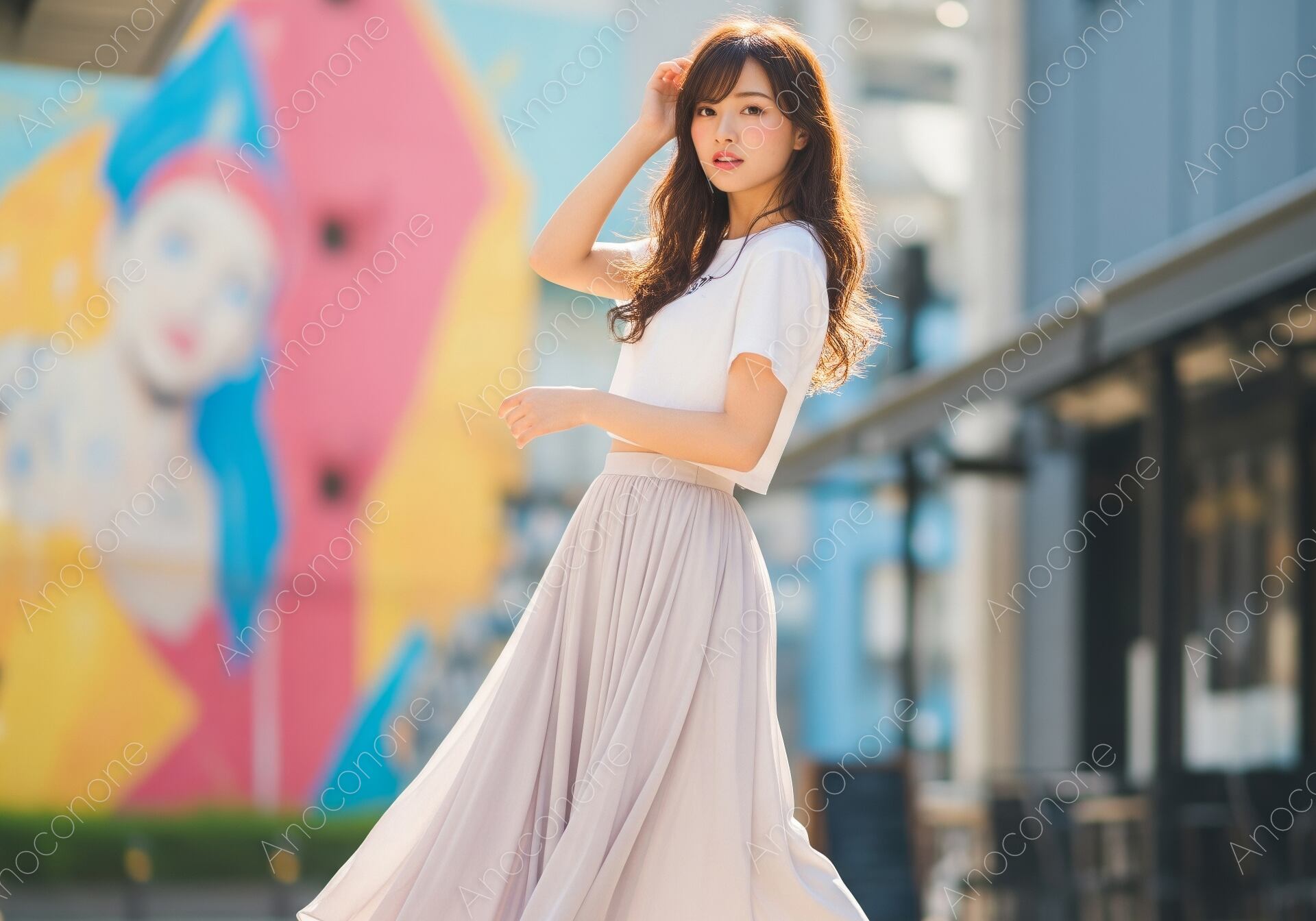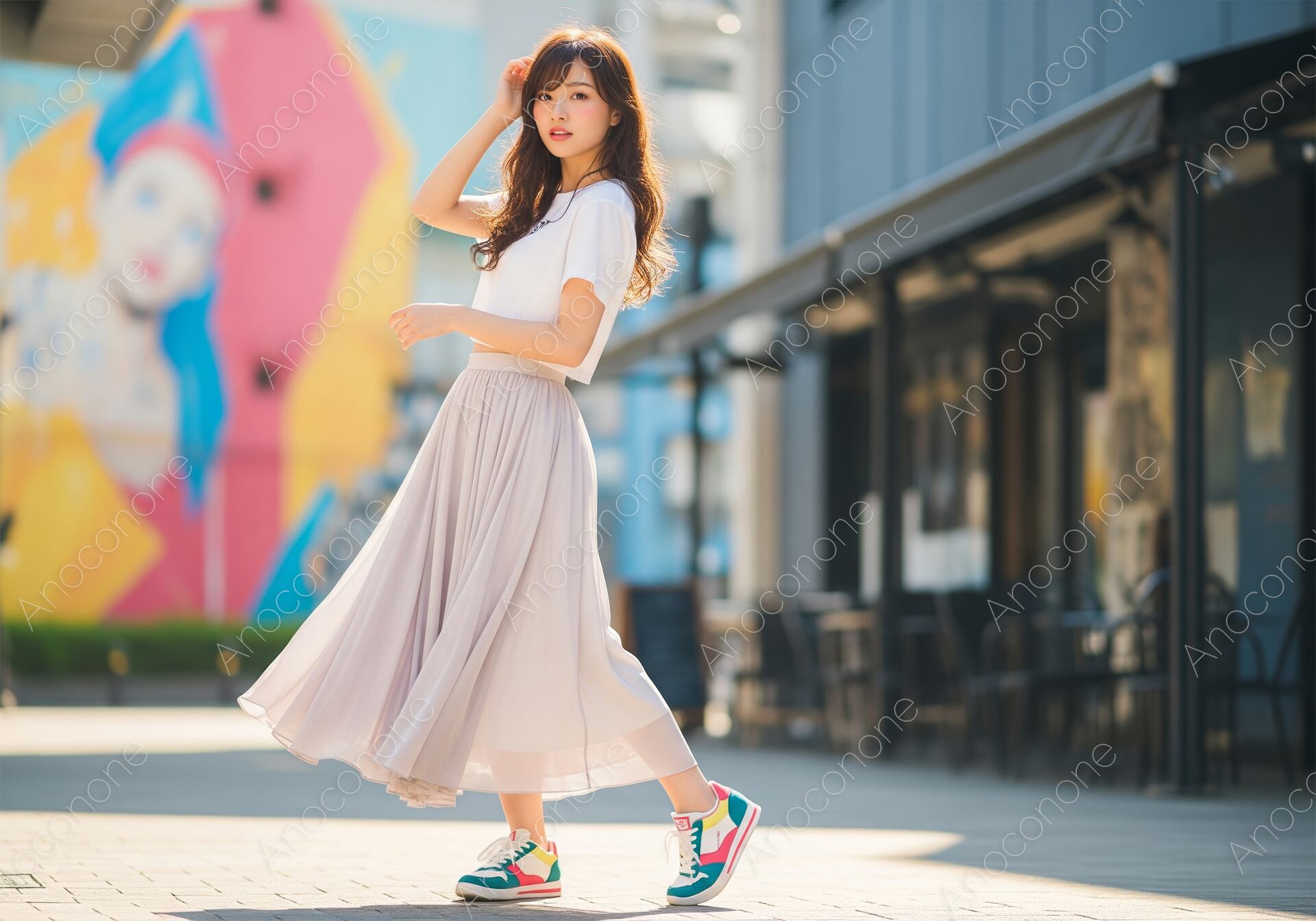 画像素材:明るい日差しが降り注ぐ洗練された街並みを背景に、白い半袖のトップスと淡いベージュのロングフレアスカートを身にまとった女性が、軽やかな足取りで歩む瞬間を捉えたポートレートです。女性の動きに合わせてふんわりと広がるスカートの裾が、都会的で自由な空気感を演出しています。足元にはカラフルでスポーティーなスニーカーを合わせることで、エレガントさの中にアクティブな要素を取り入れた現代的なファッションスタイルを表現しました。背景にはカラフルなウォールアートやモダンな建物が美しくボケて写り込み、被写体の透明感を引き立てています。風に揺れる髪をさりげなく整える仕草も非常に魅力的で、日常の何気ないシーンをファッショナブルに切り取った一枚です。夏のライフスタイル提案やファッションカタログ、街歩きの特集記事に最適な素材です。