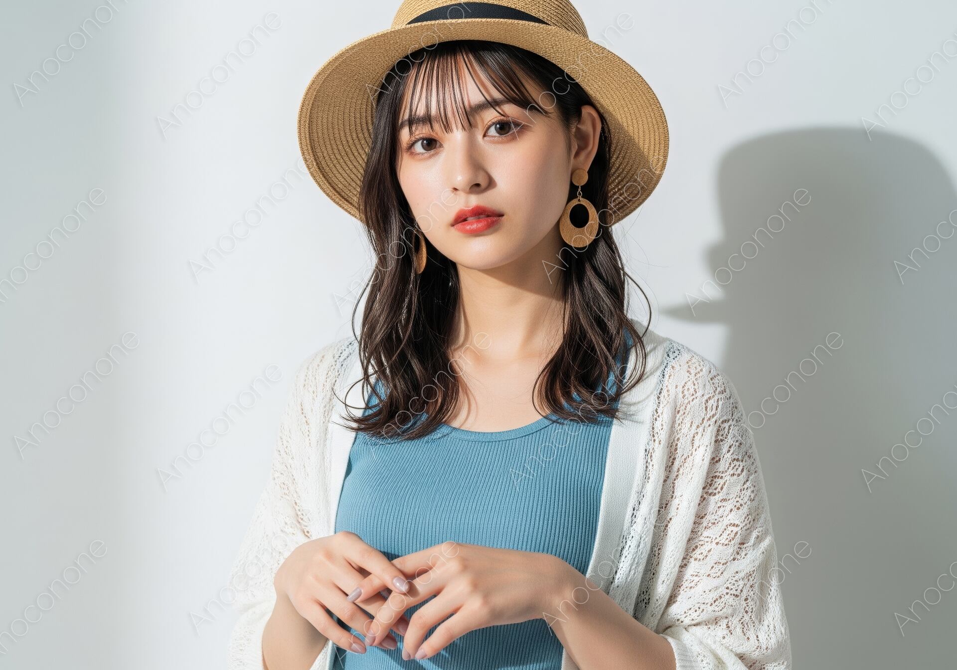 画像素材:夏の日差しを感じさせる明るい光の中で、麦わら帽子を被った女性がこちらを静かに見つめる、清潔感溢れるファッションポートレートです。女性は爽やかなブルーのタンクトップに、繊細な透け感が美しい白のレースカーディガンを羽織り、ボトムスにはカジュアルなデニムを合わせた、大人の夏のリラックススタイルを体現しています。耳元で存在感を放つ大ぶりのウッド調ピアスが、シンプルなコーディネートにナチュラルなアクセントを添えています。壁に映し出された帽子と彼女のシルエットが、空間に奥行きとアーティスティックな雰囲気を与えており、洗練された印象を際立たせています。落ち着いた表情の中にも凛とした美しさがあり、見る人を惹きつける魅力を持った一枚です。アパレルの宣伝や美容系コンテンツ、ライフスタイル雑誌のアイキャッチなどに幅広くお使いいただけます。