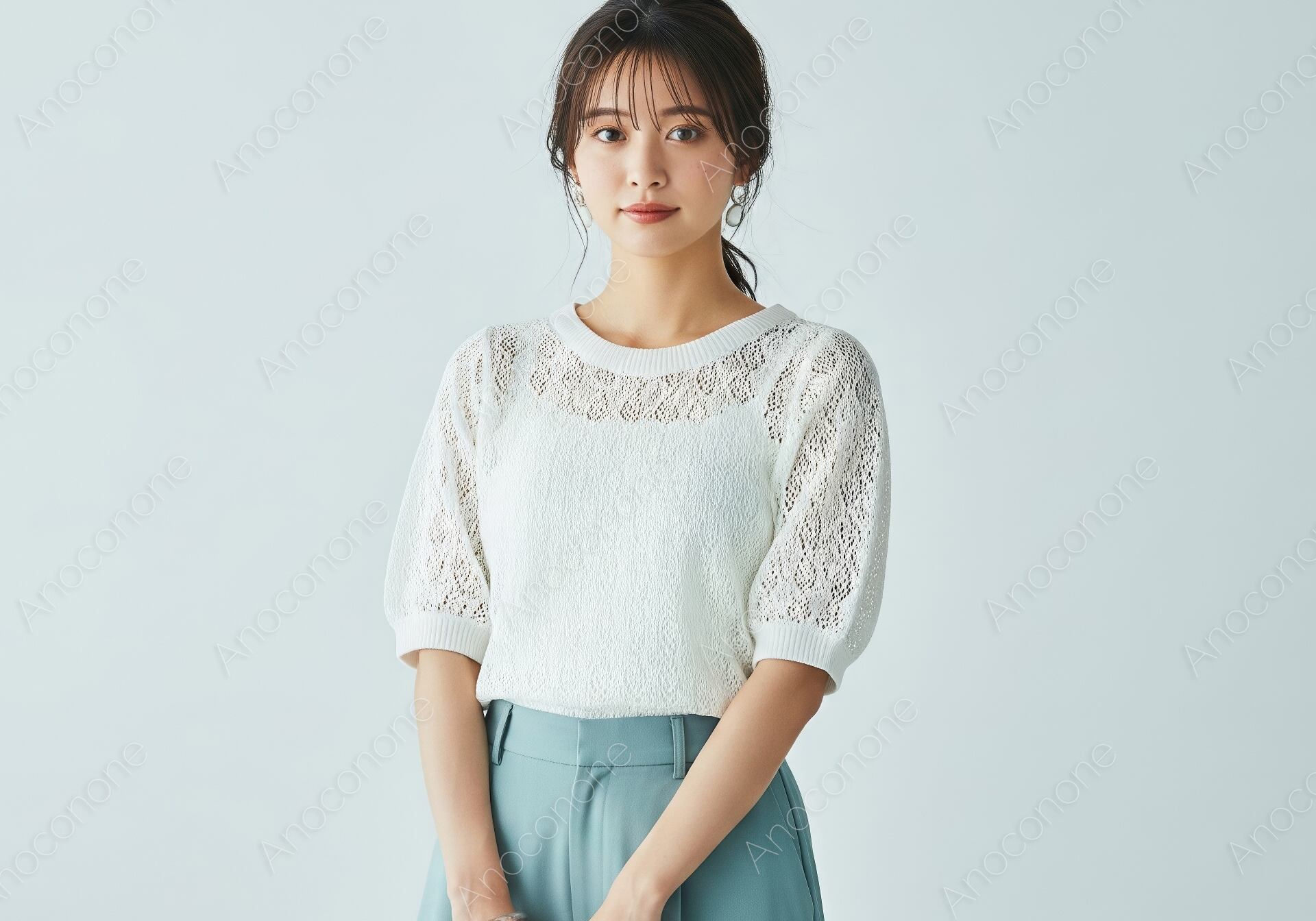 画像素材:清涼感のある明るいグレーの背景をバックに、繊細な編み目の白いレースニットを身に纏った女性が、優しく微笑みながら佇む上品なポートレートです。トップスのレースから透ける肌の質感が、夏らしい軽やかさと大人の女性らしいエレガントさを同時に演出しています。ボトムスには落ち着いたトーンのブルーのワイドパンツを合わせ、手元には季節感あふれるカゴバッグを持つことで、洗練された都会的なオフィスカジュアルや休日のお出かけスタイルを表現しました。髪を後ろでスッキリとまとめ、シンプルなシルバーのブレスレットを添えることで、清潔感のある美しさがより一層際立っています。全体的に淡く柔らかな色調で統一されており、見る人に安心感と爽やかな印象を与える構図となっています。アパレルブランドの宣伝や、美容・ライフスタイル関連のWEBサイトのメインビジュアルに最適な素材です。