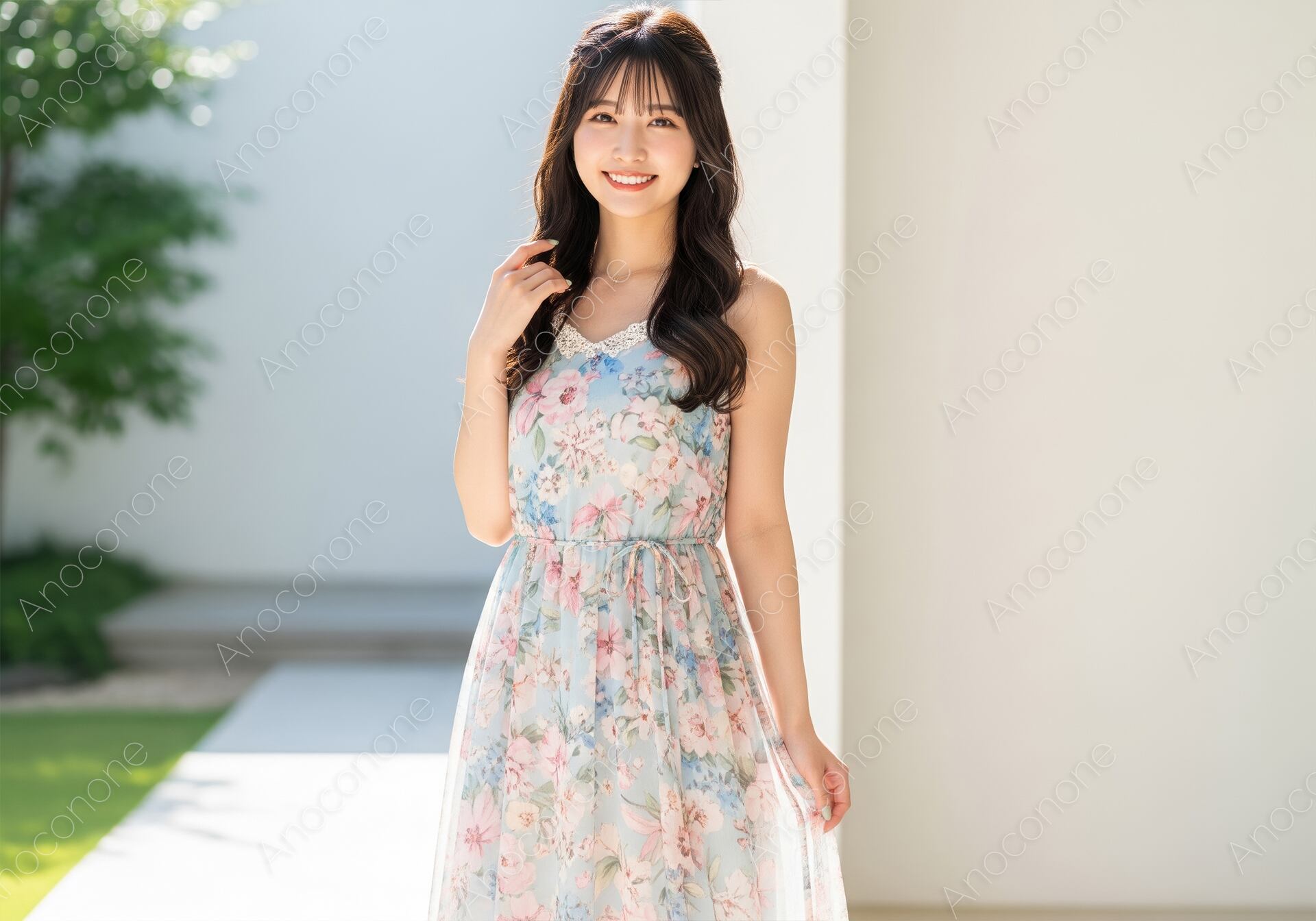 画像素材:明るい日差しが差し込む屋外で、淡い色合いの花柄ワンピースを着用した女性が優しく微笑んでいるカットです。シフォン素材の軽やかな衣装が涼しげな印象を与え、背景の緑と白い壁が被写体の透明感を引き立てています。髪型は上品なハーフアップに整えられており、落ち着いた大人の可愛らしさを表現しています。自然なライティングが肌の質感をきれいに見せ、清潔感のある雰囲気が特徴です。構図は人物を中心に配置しつつ、周囲の空間も取り入れることで開放感を演出しました。ファッション誌の特集や、美容関連のウェブサイト、季節感を出したい広告デザインの素材として活用しやすい一枚です。