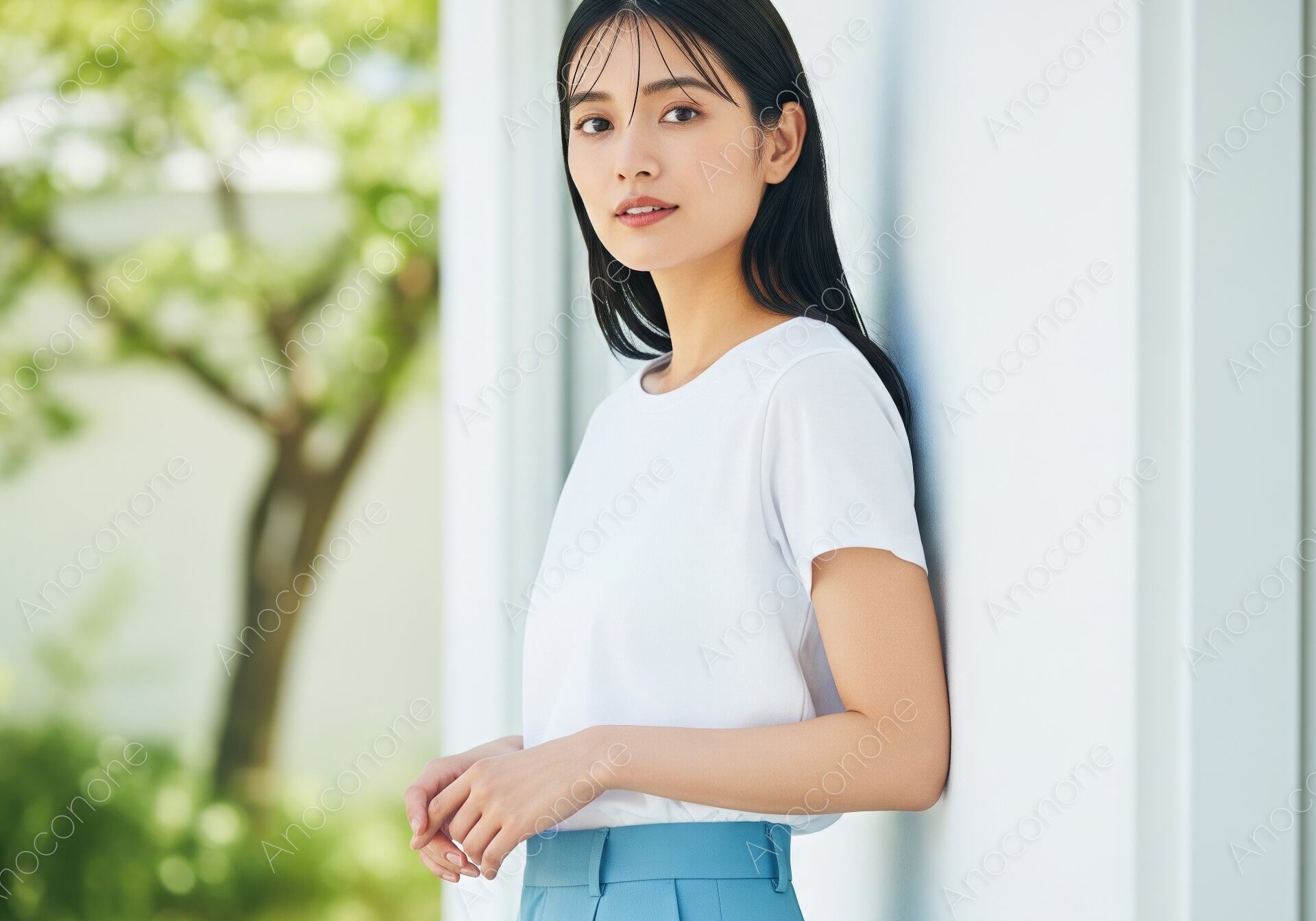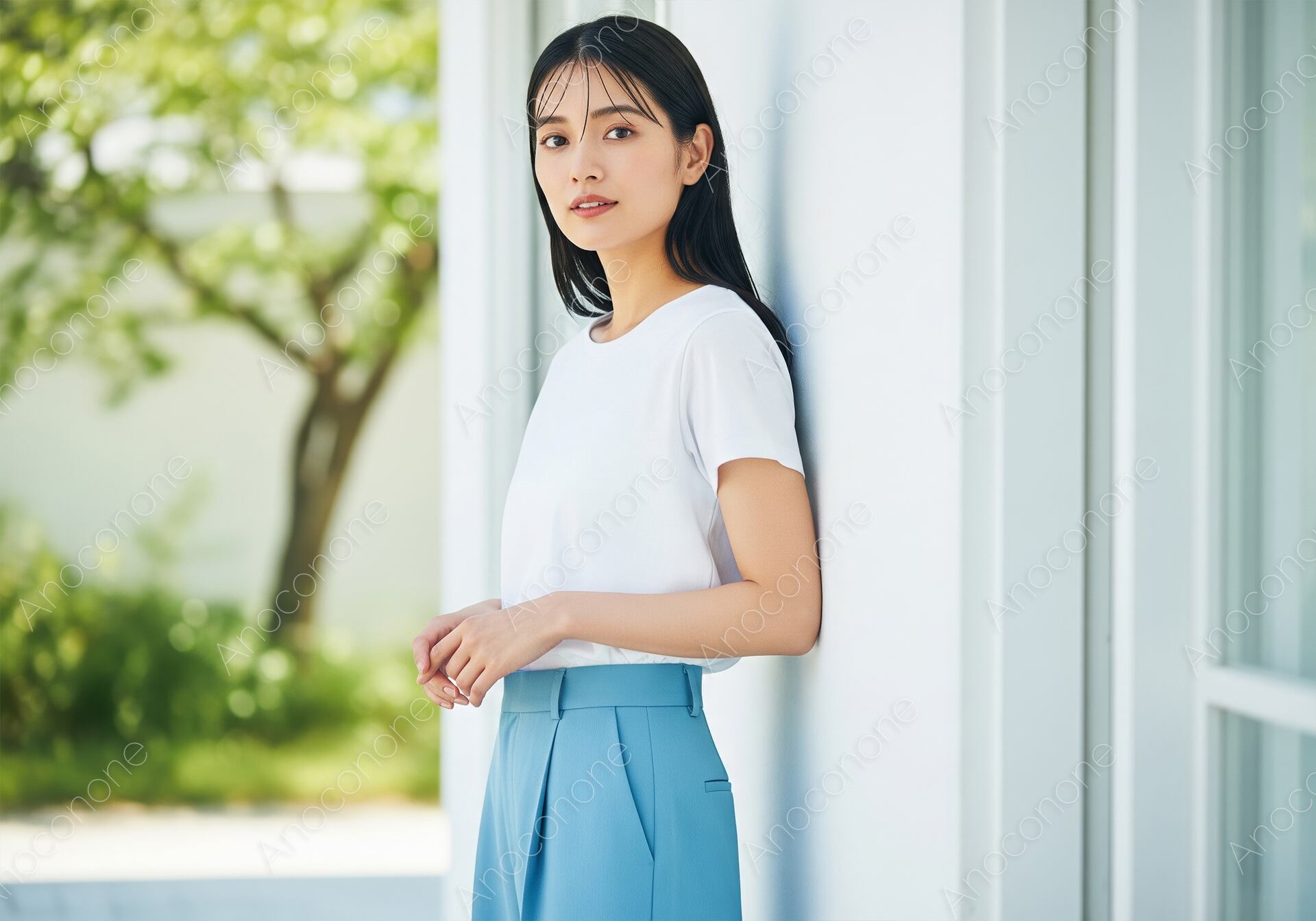 画像素材:清潔感のある白いTシャツに、鮮やかなブルーのワイドパンツを合わせた、シンプルで洗練された装いの女性が白い壁に寄り添う姿を捉えた一枚です。無駄を削ぎ落としたミニマルなファッションが、被写体の持つ自然な美しさと凛とした佇まいを引き立てています。背景には窓越しに柔らかな新緑が広がり、室内外の光が調和することで、画面全体に涼やかで開放的な空気が流れています。落ち着いた表情と自然なポージングは、現代的で自立した大人の女性の日常を表現しており、見る人に安心感と清潔な印象を与えます。衣服のシワ感や肌の質感も細やかに描写されており、高品質なビジュアル素材として機能します。アパレルブランドのカタログや、ライフスタイルを提案するブログ、夏の爽やかなイメージを強調したい広告デザインに最適な素材です。