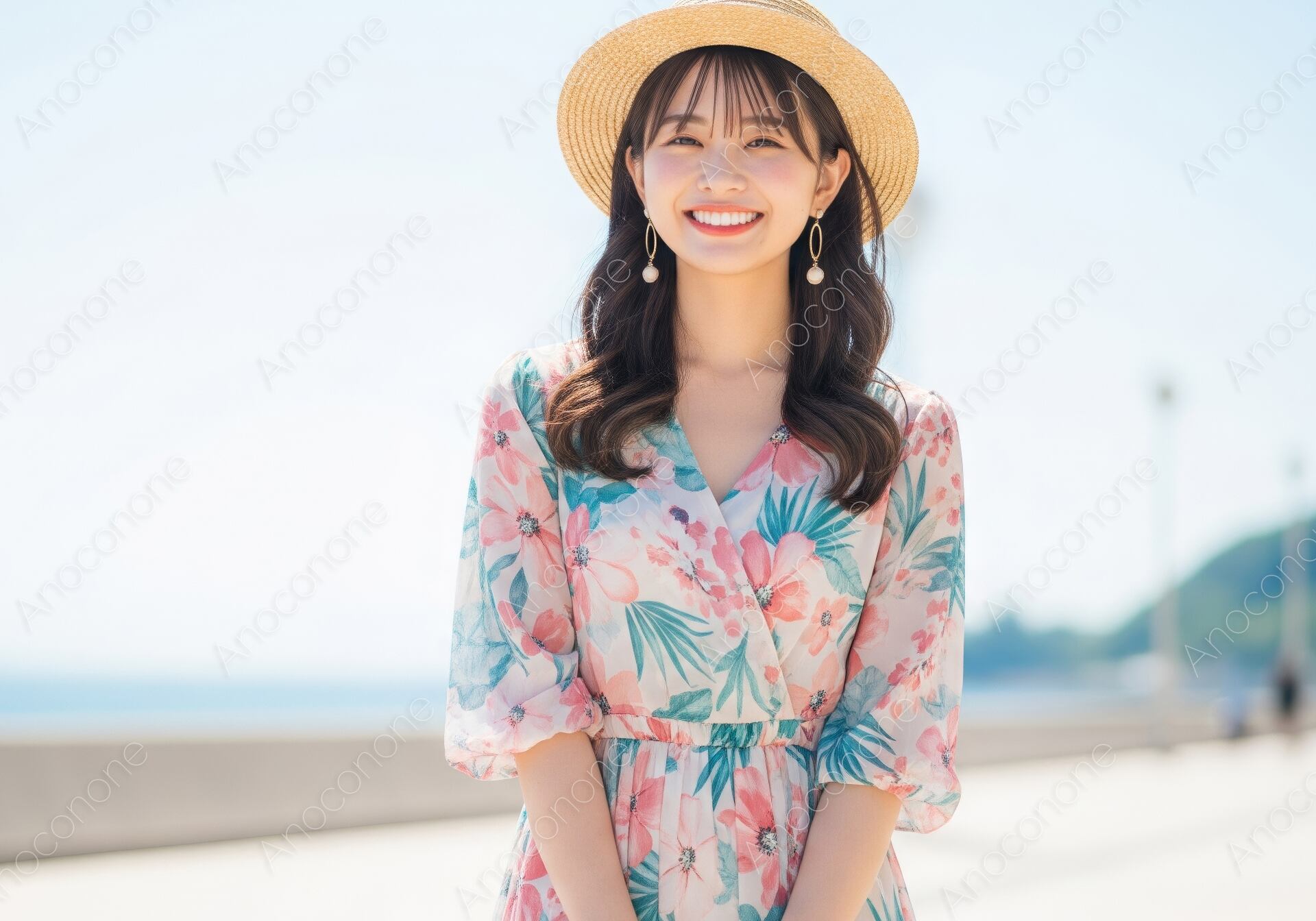 画像素材:抜けるような青空の下、海辺の遊歩道で華やかな花柄のワンピースを身に纏った女性が、満面の笑みを浮かべている瞬間を捉えた一枚です。季節感溢れる麦わら帽子と、耳元で揺れるパールのピアスがアクセントとなり、上品で清涼感のあるリゾートスタイルを演出しています。淡いピンクとブルーの花柄が、背景の明るい光と調和し、画面全体に多幸感と開放感を与えています。柔らかなウェーブヘアが風を感じさせ、自然体で健康的な美しさが際立つ構成となっています。人物を中央に配置しながらも、背景の奥行きを活かすことで、夏の旅先でのワンシーンのような物語性を感じさせます。旅行パンフレットの表紙や、夏のキャンペーン広告、SNSでのライフスタイル発信など、ポジティブなイメージを訴求したい場面に最適な素材です。