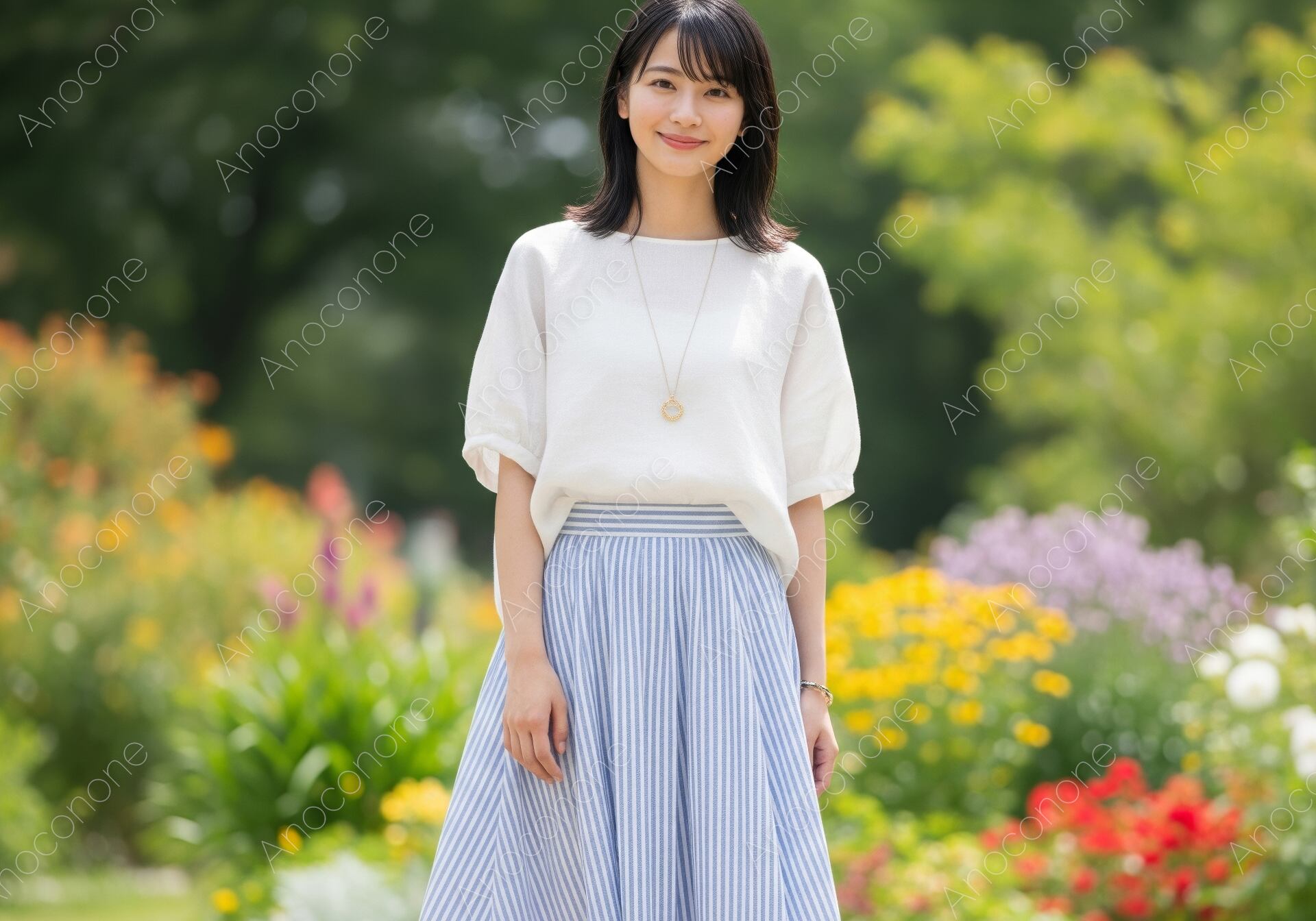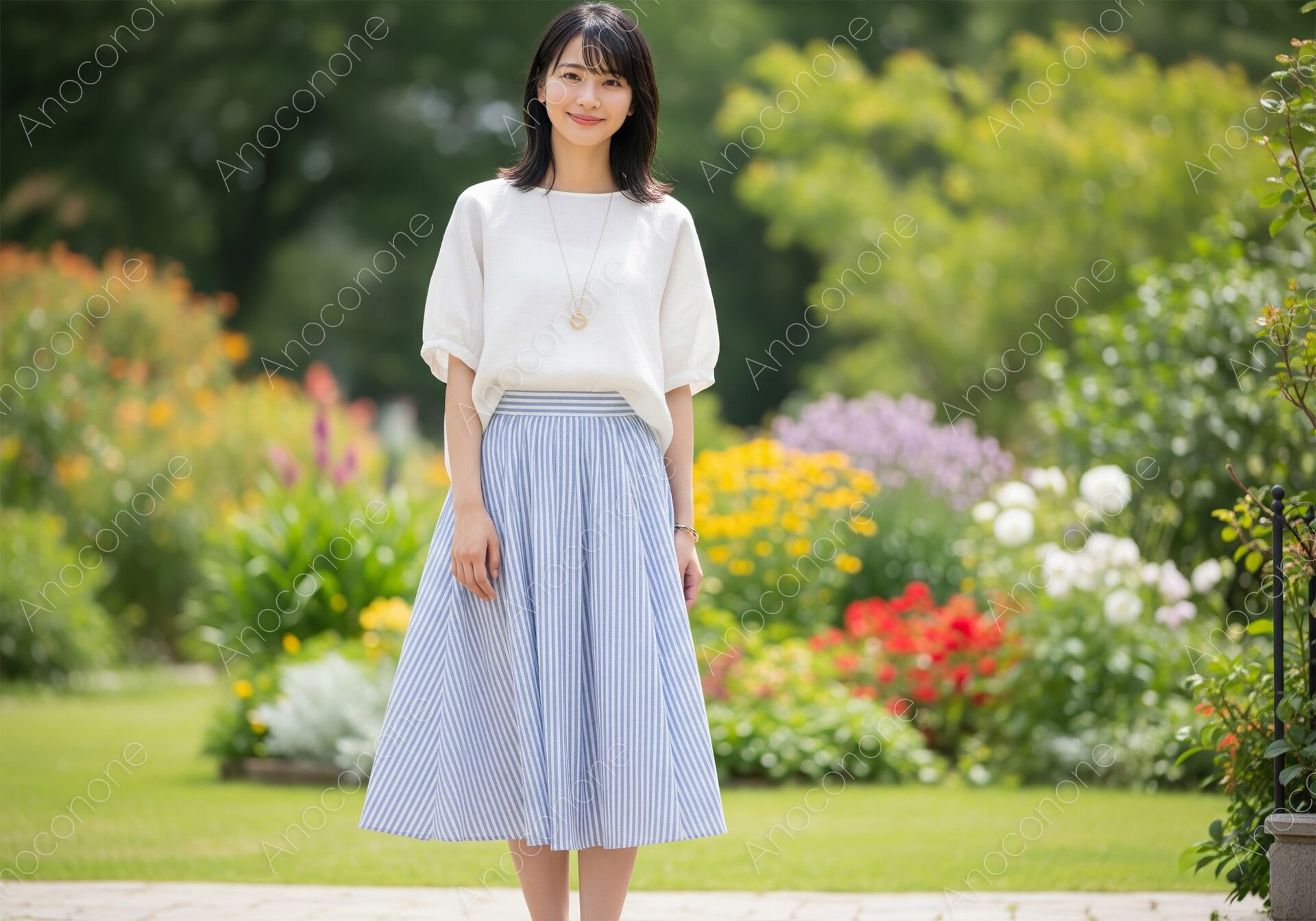 画像素材:手入れの行き届いた色とりどりの花々が咲き誇る庭園で、白いパフスリーブのブラウスにブルーのストライプ柄スカートを合わせた女性が、穏やかな微笑みを浮かべて立っているカットです。上下ともにゆったりとしたシルエットの衣装が、夏の風を通すような涼しげな印象を与え、背景の豊かな緑や花の色と見事に調和しています。胸元に光るシンプルなペンダントがアクセントとなり、上品で落ち着いた大人のカジュアルスタイルを完成させています。柔らかな自然光が全身を包み込み、肌の質感や衣服のドレープを美しく表現しており、清潔感に満ちた雰囲気が漂います。構図は人物の全身を捉えつつ、周囲の広々としたガーデンの景観を活かすことで、開放的で心地よい季節感を演出しました。旅行雑誌のライフスタイル特集や、夏のファッションカタログ、お出かけをテーマにした広告ビジュアルに最適な素材です。