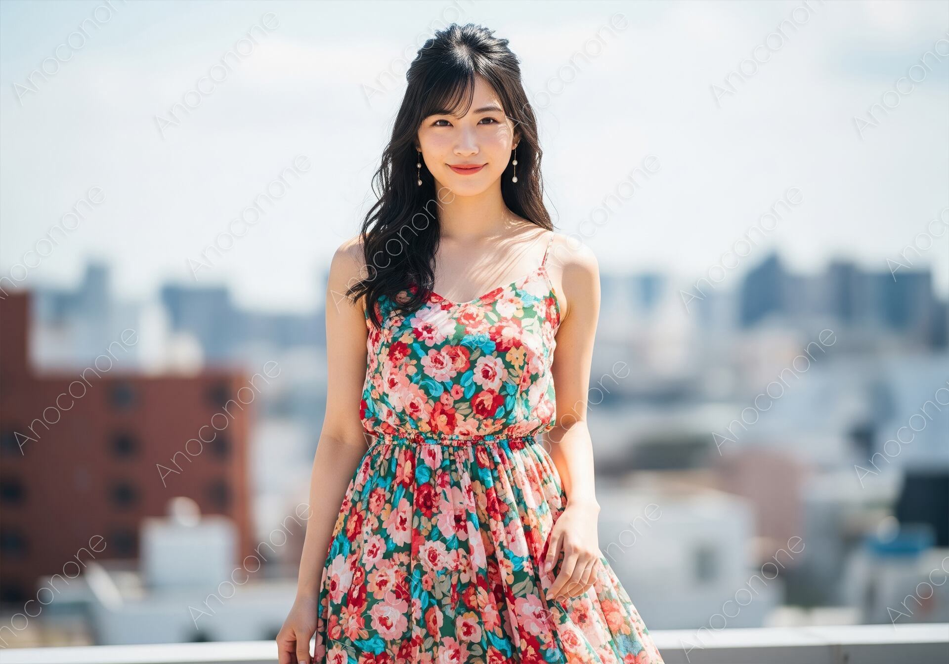 画像素材:都会の街並みを見渡す開放的な屋上で、赤やオレンジの大きな花が描かれた鮮やかなワンピースを纏った女性が、優しく微笑んでいるカットです。強い日差しを浴びて輝くハーフアップの髪と、耳元で揺れる繊細なピアスが、上品で華やかな大人の夏スタイルを演出しています。背景には都市のビル群が柔らかくぼかして描写されており、被写体の存在感とファッションの色彩をより一層引き立てる構成となっています。風を感じさせる軽やかな衣装の質感と、都会的なロケーションが絶妙に調和し、洗練された休日のひとときを感じさせます。自然なライティングが肌のトーンを明るく見せ、全体として健康的でポジティブな印象を与える仕上がりです。アパレルの夏コレクション広告や、都会派のライフスタイル提案、旅行・レジャー関連のウェブコンテンツに最適な素材です。