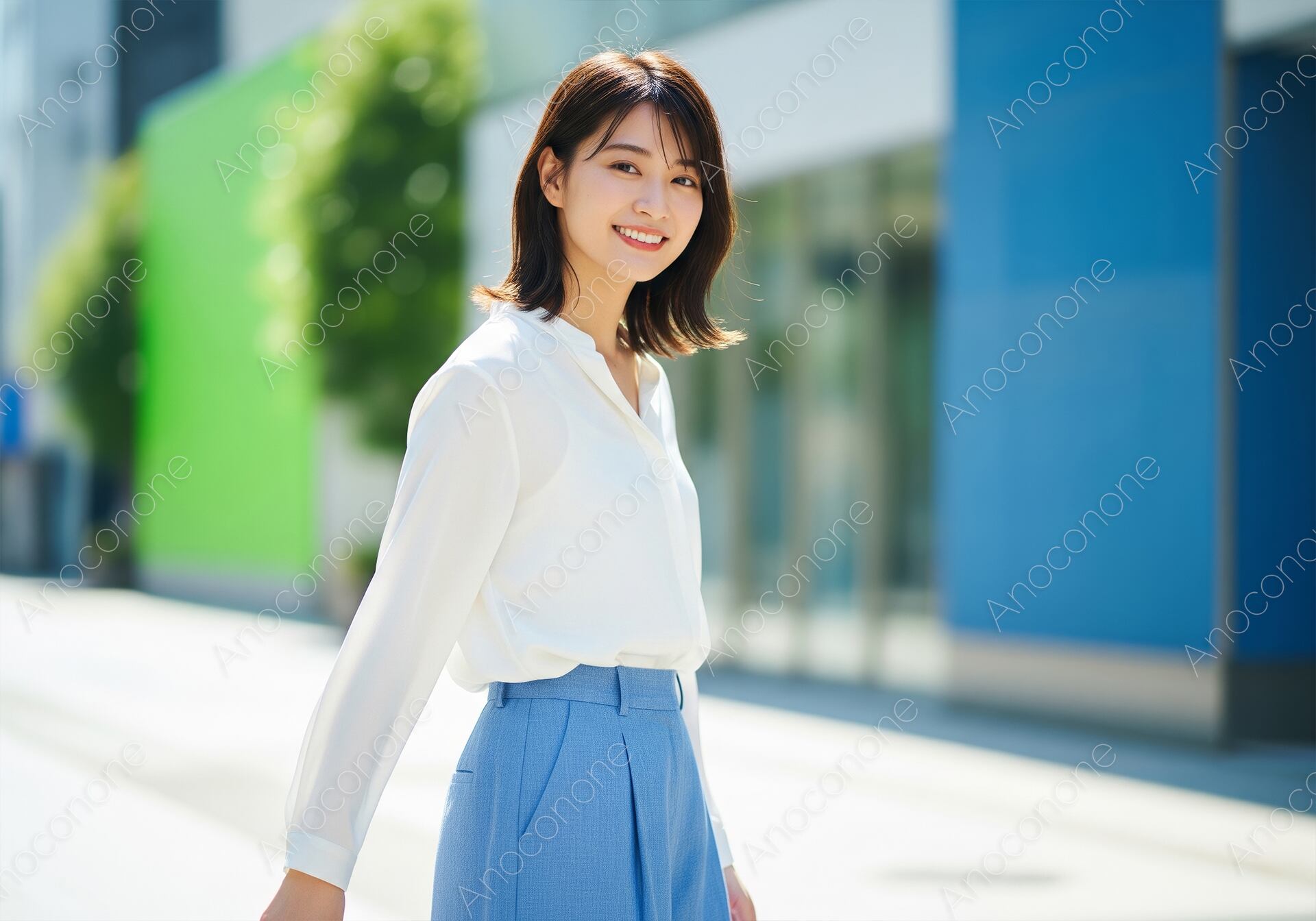 画像素材:夏の日差しが照りつける都会の街角で、清潔感のある白いブラウスに鮮やかなブルーのパンツを合わせた女性が、軽やかな足取りで歩む瞬間を捉えた一枚です。風になびくような外ハネのボブヘアと、屈託のない笑顔が、見る人に健康的でポジティブな印象を与えます。背景には近代的なビルや緑が程よくぼかされており、都会的な洗練された雰囲気と季節感のある開放的な空気が見事に調和しています。自然なライティングが白いシャツの質感を柔らかく際立たせ、全体の色彩を明るく整えることで、爽やかで活動的な大人の女性像を演出しました。構図に動きがあるため、日常のワンシーンを切り取ったような臨場感があり、視覚的な訴求力も高い仕上がりとなっています。働く女性のオンオフをテーマにした特集や、夏の通勤ファッションの提案、都市生活を彩るライフスタイル広告のメインビジュアルとして幅広く活用できる素材です。