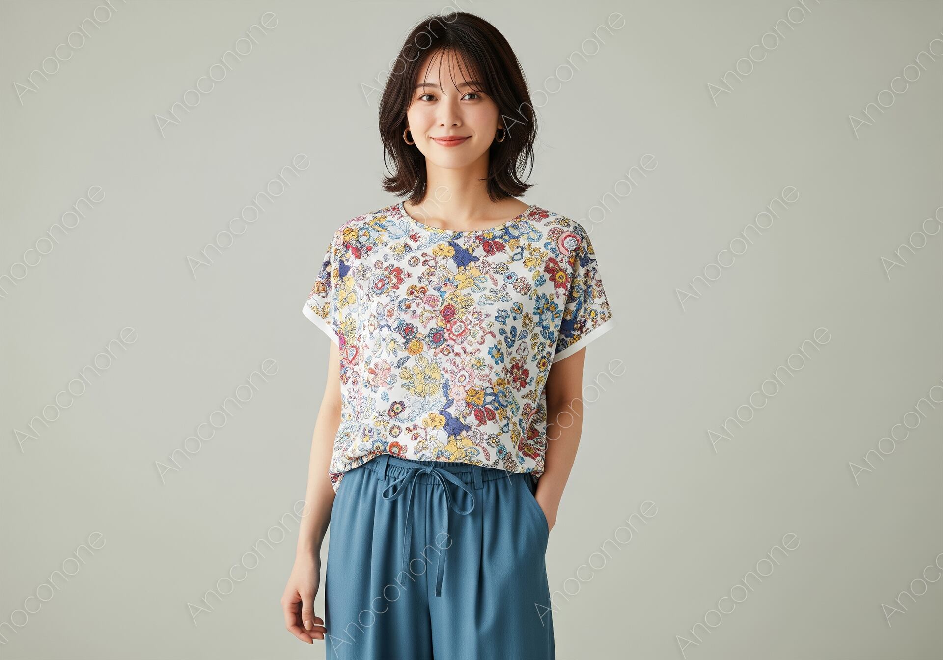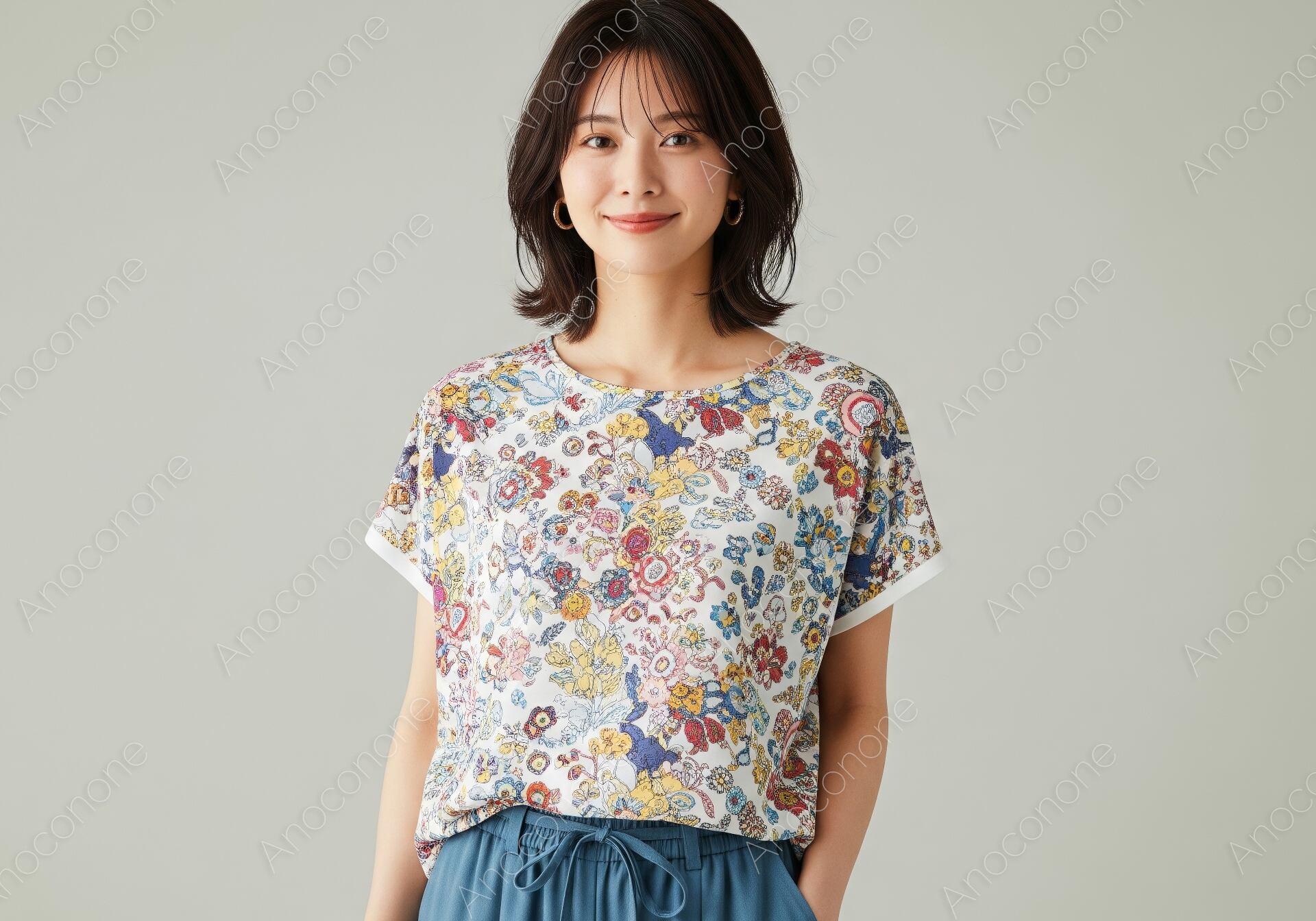画像素材:細やかな花々が描かれた多彩なボタニカル柄のカットソーに、落ち着いたブルーのワイドパンツを合わせた、リラックス感のある夏の装いの女性です。トップスの華やかなプリントが、シンプルな背景の中で際立ち、見る人に明るく快活な印象を与えます。パンツのウエスト部分はドローストリング仕様になっており、大人のカジュアルスタイルに程よい抜け感を演出しています。肩のラインをきれいに見せるフレンチスリーブと、軽快な印象を与える外ハネのボブヘアが絶妙に調和し、清潔感溢れる佇まいを引き立てています。耳元に光る控えめなゴールドのピアスが、全体の色調に上品なアクセントを添えており、細部までこだわりが感じられる構成です。ライティングは柔らかく均一で、衣服の柔らかな質感や肌のトーンを自然に描写しており、素材の良さをストレートに伝えます。夏の日常着の提案や、ライフスタイル全般を扱うウェブメディア、広告デザインのメインビジュアルとして非常に汎用性の高い一枚です。