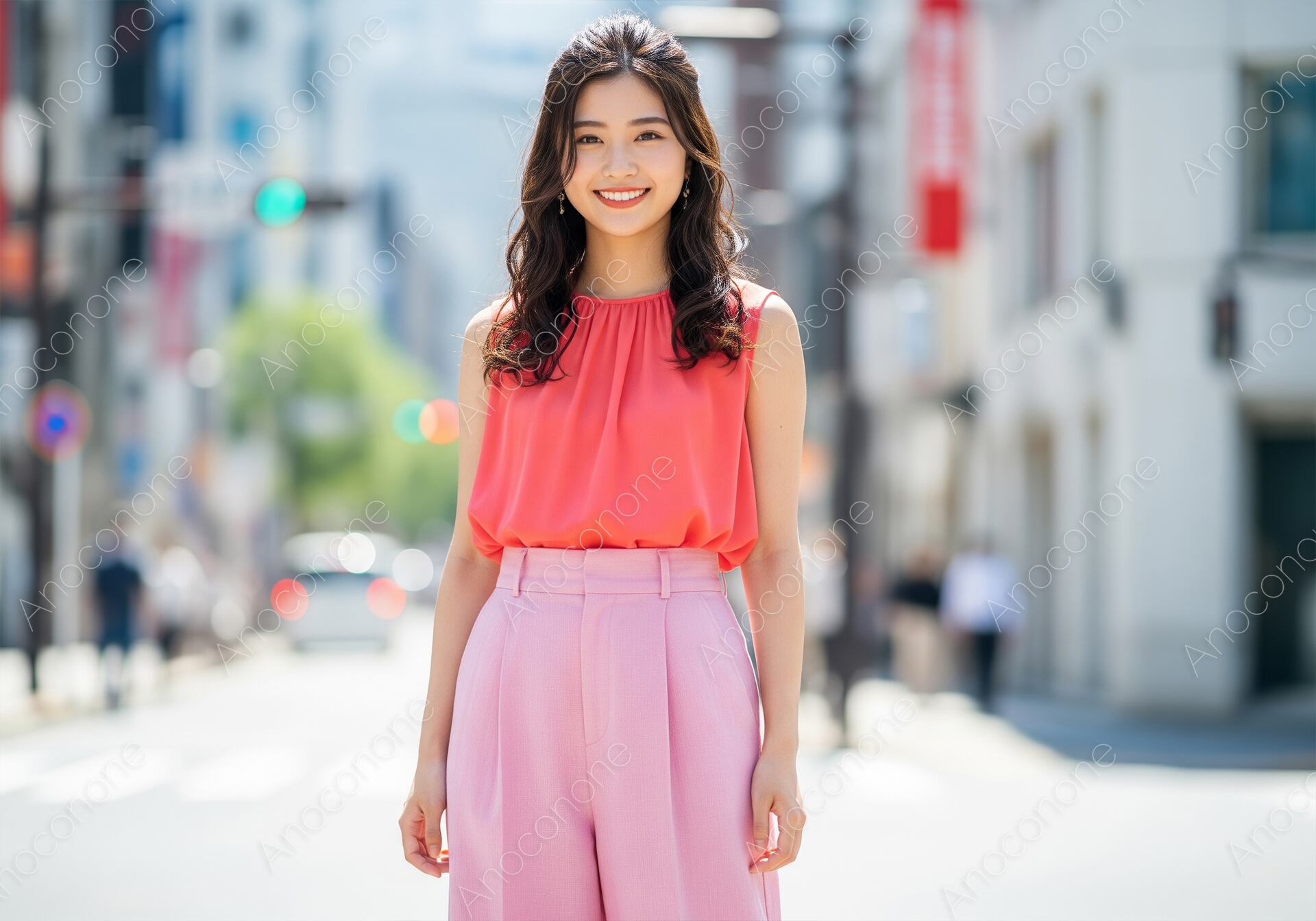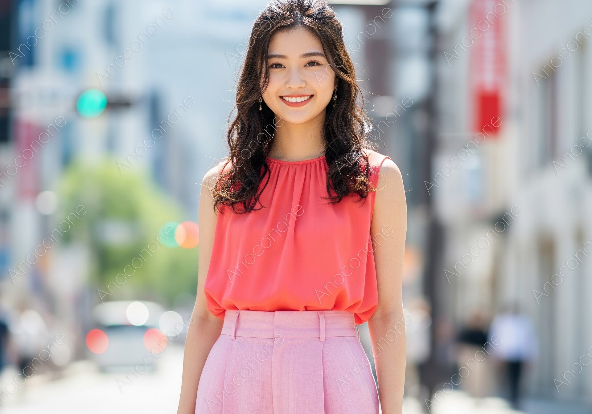 画像素材:夏の日差しが降り注ぐ都会の街角で、鮮やかなコーラルピンクのブラウスに淡いピンクのパンツを合わせた女性が、晴れやかな笑顔を見せているカットです。トップスの首元に施されたシャーリングが柔らかな立体感を生み出し、同系色でまとめたコーディネートが都会的で洗練された印象を与えます。背景にはオフィス街の風景が程よくぼかして描写されており、被写体のハツラツとした表情と華やかな色彩をより一層引き立てる構成となっています。丁寧に整えられたハーフアップのウェーブヘアが、上品さと軽やかさを演出し、街歩きの楽しさを感じさせます。自然なライティングが肌のトーンを明るく健康的に見せ、全体としてポジティブでエネルギッシュな雰囲気が漂う仕上がりです。働く女性のオンオフをテーマにした特集や、夏の都市観光プロモーション、明るいイメージを強調したい広告ビジュアルに最適な一枚です。