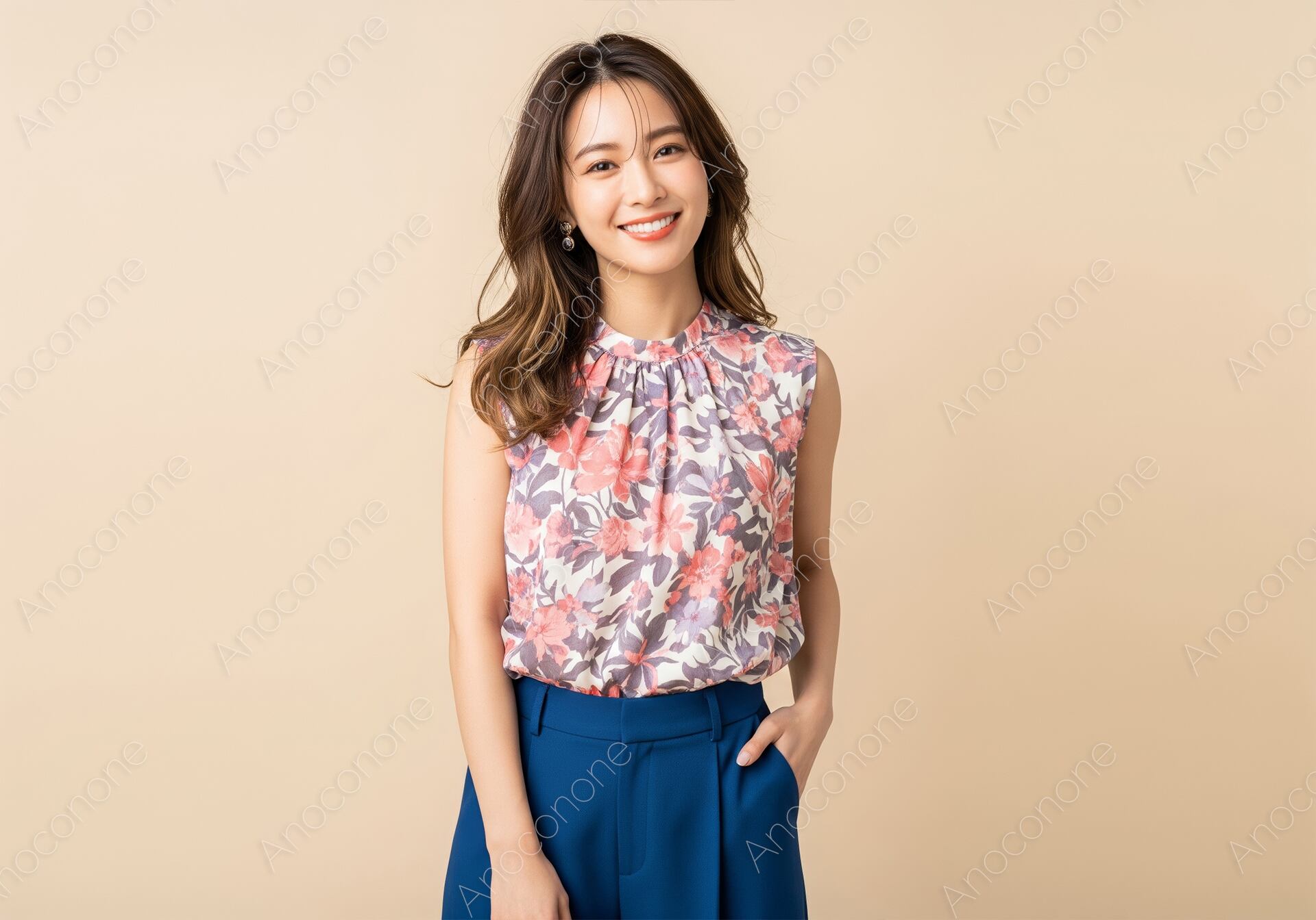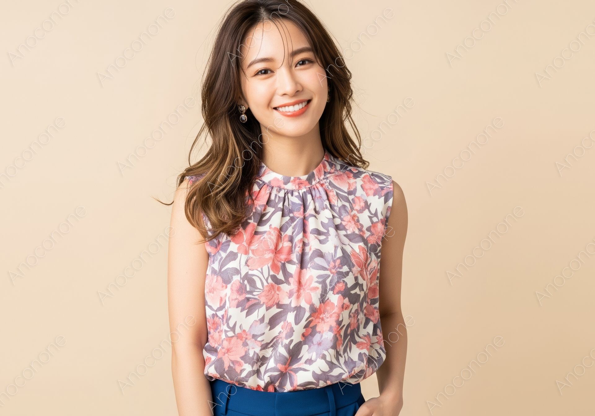 画像素材:ベージュの背景に、赤や紫の落ち着いたトーンで描かれた花柄のノースリーブブラウスと、鮮やかなブルーのパンツを合わせた女性が微笑むポートレートです。ブラウスの首元に寄せられたギャザーが柔らかなドレープを生み出し、顔周りに華やかさと上品な印象を添えています。軽く巻かれたブラウン系のロングヘアが、大人の余裕を感じさせるエレガントな雰囲気を演出しており、耳元で控えめに輝くピアスが全体の完成度を高めています。パンツの深い青色がコーディネートを引き締め、清潔感と都会的な洗練さを同時に表現しています。ライティングは全体を優しく包み込むように調整されており、衣服の細かな質感や肌の健康的なトーンをきれいに描写した構成です。落ち着いた表情と洗練されたポージングは、信頼感のある大人の女性像を映し出しています。アパレルブランドの夏物特集や、ライフスタイルを提案するカタログ、働く女性をターゲットにした広告ビジュアルとして幅広く活用できる一枚です。