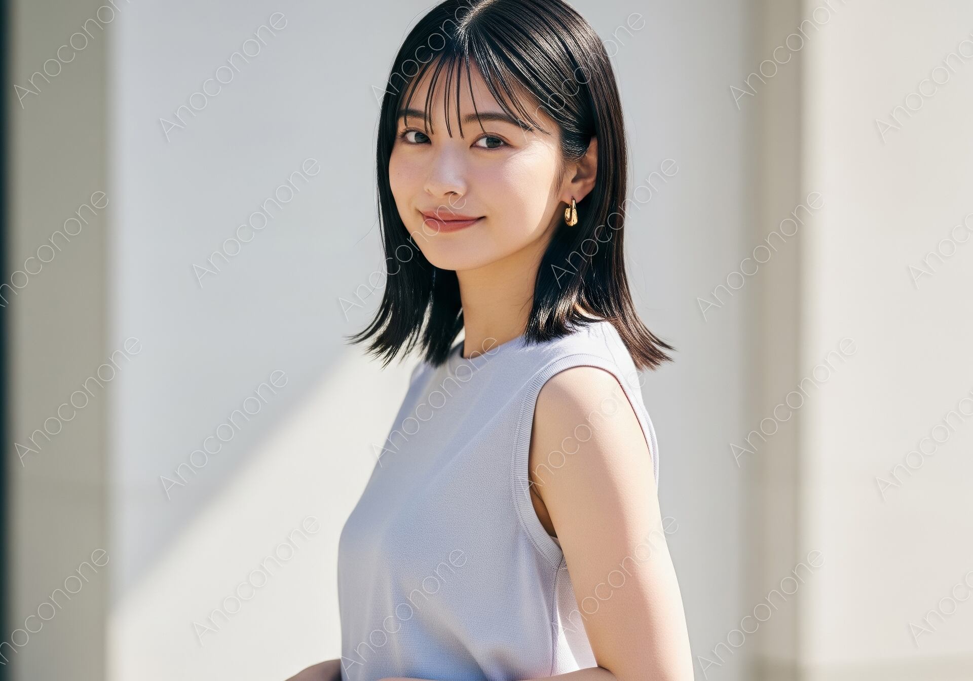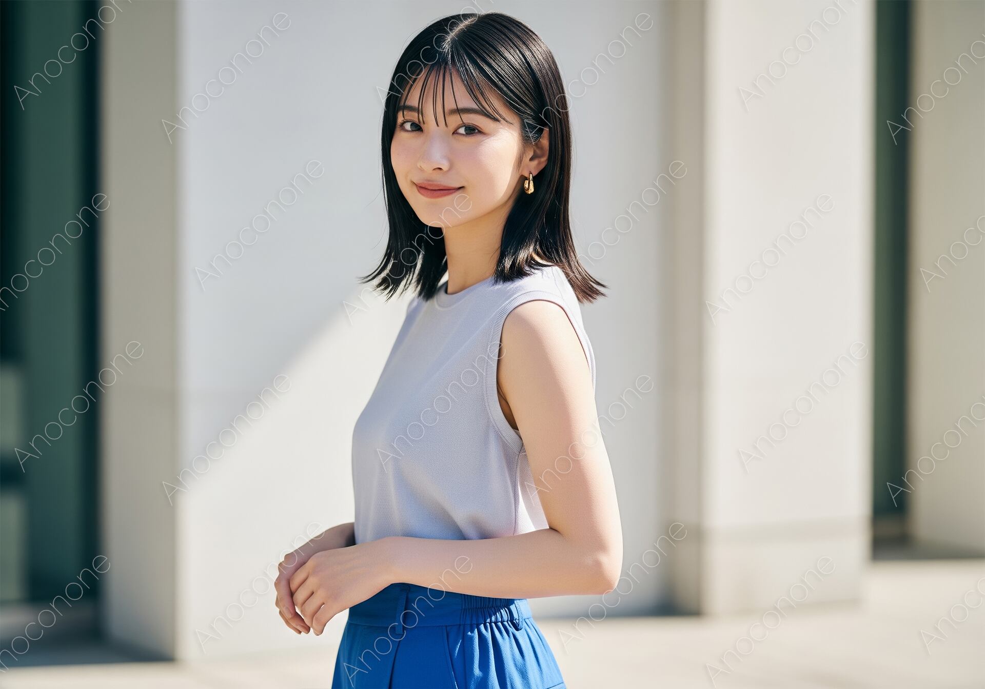 画像素材:明るい日差しが降り注ぐ屋外の白い壁を背景に、淡いグレーのサマーニットと鮮やかなブルーのパンツを合わせた女性が、穏やかな表情で佇むカットです。袖のないノースリーブのデザインが、夏らしい清涼感と健康的で引き締まった印象を与えます。シンプルながらも洗練されたコーディネートは、都会的な大人の女性の日常を美しく表現しており、見る人に清潔感と知的な雰囲気を感じさせます。耳元でさりげなく輝くゴールドのピアスが、顔周りに華やかなアクセントを添え、全体の完成度を高めています。自然光を巧みに活かしたライティングにより、肌の滑らかな質感や髪の艶が丁寧に描写されており、被写体の持つ自然な美しさが際立ちます。構図は人物の魅力を中心に据えつつ、背景の余白を活かすことで、開放感のある爽やかなビジュアルに仕上がりました。夏のオフィススタイルや、大人のカジュアルファッションをテーマにした広告、ライフスタイルメディアのアイキャッチとして非常に汎用性の高い素材です。