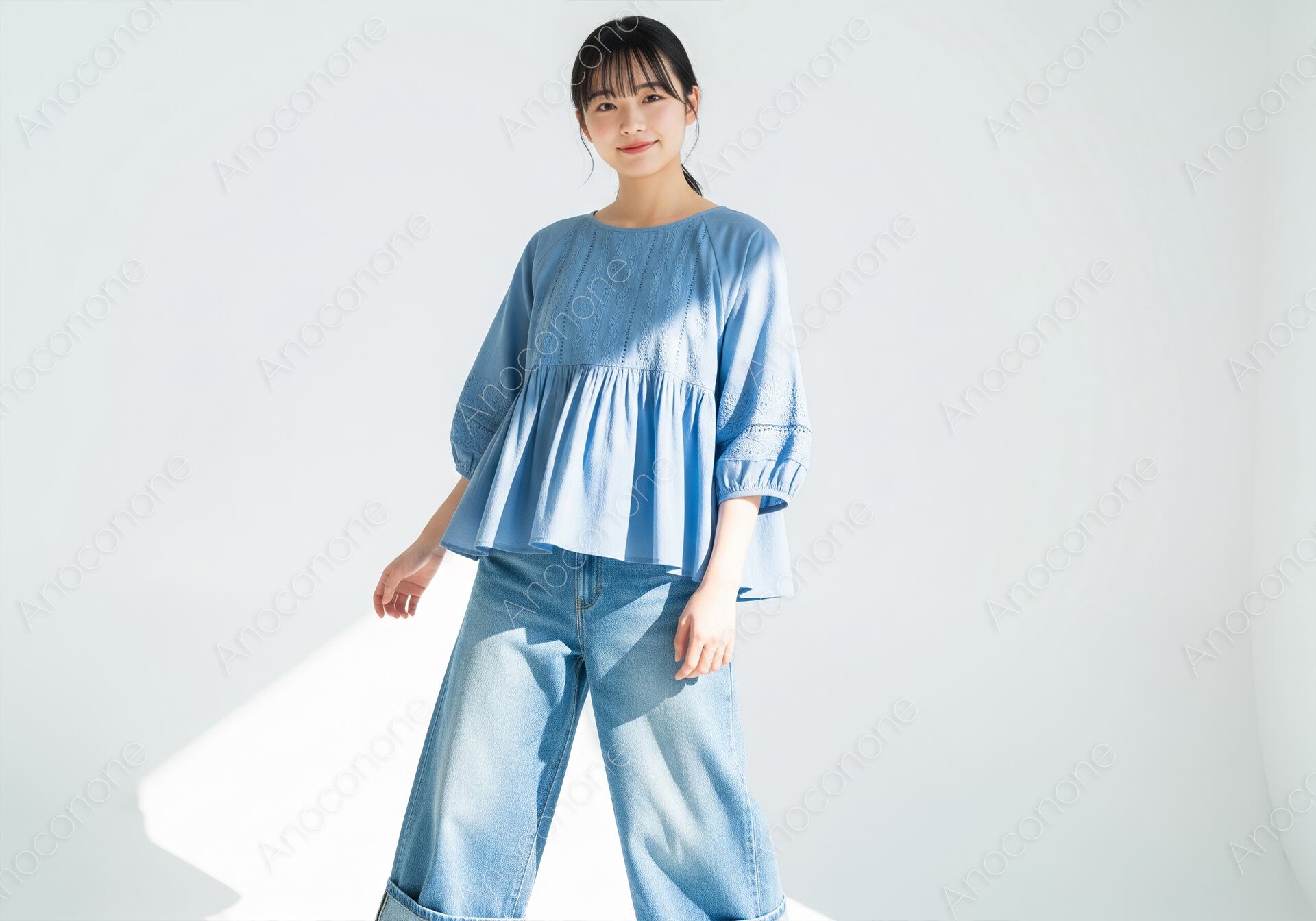 画像素材:白を基調とした明るい室内で、涼やかなブルーのティアードブラウスにワイドデニムを合わせた、ナチュラルで清潔感のある装いの女性です。ブラウスの胸元や袖口に施された繊細な刺繍と、ふんわりとしたパフスリーブが、シンプルなコーディネートに女性らしい甘さと立体感を添えています。すっきりとまとめられたポニーテールが、顔周りを明るく見せ、健康的で若々しい印象を引き立てています。窓から差し込む柔らかな自然光が、衣服の柔らかなコットン素材の質感や、肌の透明感を美しく描写しており、全体として穏やかで心地よい雰囲気が漂います。過度な装飾を排したミニマルなロケーションが、被写体の持つ自然体な魅力を際立たせる構成です。夏のデイリーファッションの提案や、ライフスタイル全般を扱うウェブメディア、親しみやすさを重視した広告ビジュアルに最適な一枚です。