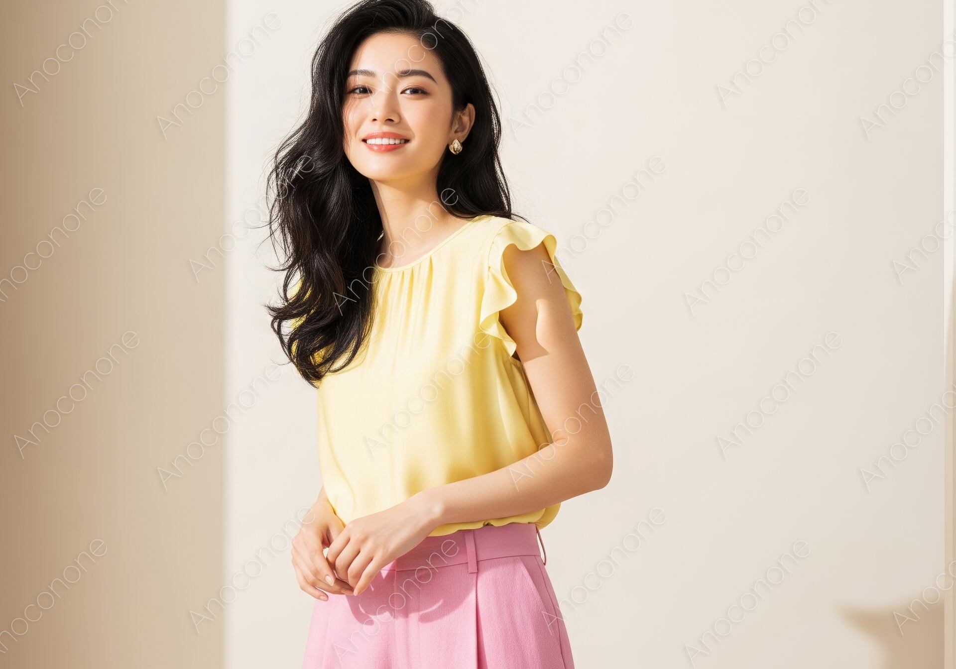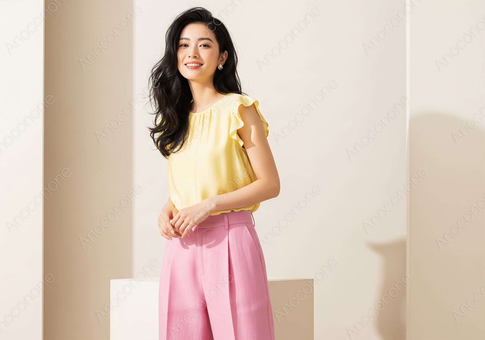 画像素材:淡いイエローのブラウスと、華やかなピンクのワイドパンツを合わせた、上品で多幸感溢れる装いの女性を捉えた一枚です。トップスの袖口に施された控えめなフリルが、シンプルなコーディネートに柔らかな動きと女性らしいエレガンスを添えています。光沢感のある滑らかな生地が、スタジオに差し込む柔らかな光を反射し、洗練された大人の余裕を感じさせます。豊かに流れる艶やかな黒髪のウェーブヘアと、耳元で上品に輝くピアスが、都会的な美しさをより一層引き立てています。背景のミニマルな空間に落ちる影が、構図に立体感と奥行きを与え、被写体の存在感を鮮明に際立たせています。落ち着いた微笑みを浮かべる佇まいは、清潔感と品格を兼ね備え、見る人にポジティブな印象を与えます。働く女性のオンタイムをイメージしたファッション特集や、夏のライフスタイルを提案するカタログ、高品質なビジュアルを求めるウェブサイトのメイン画像として最適な素材です。