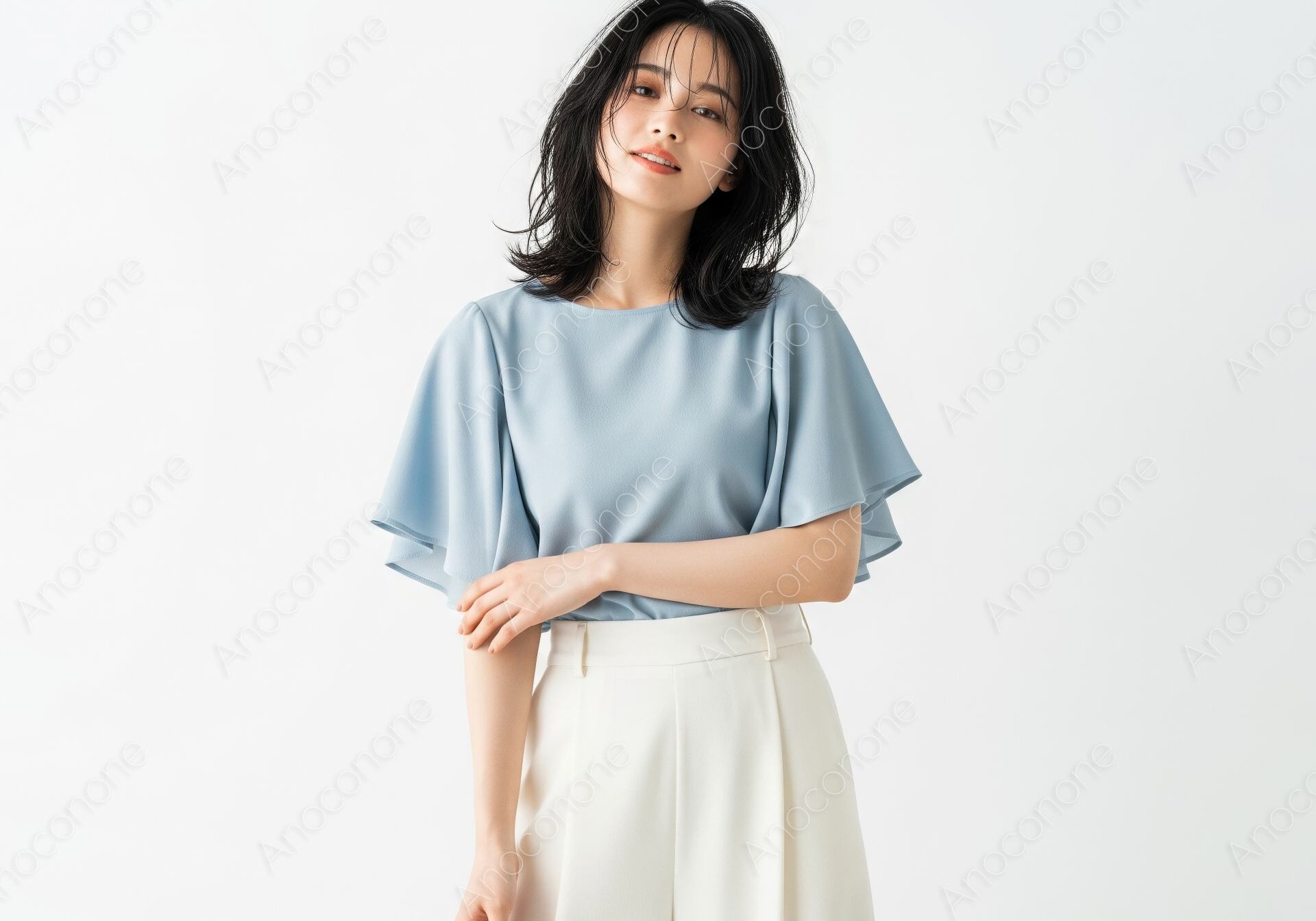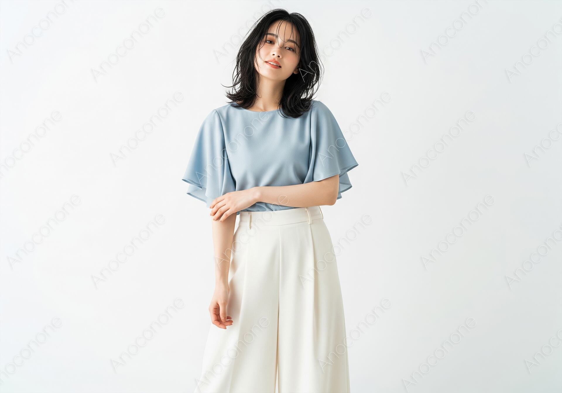 画像素材:清潔感あふれる白を背景に、涼しげなライトブルーのブラウスとホワイトのワイドパンツを合わせた、知性的でエレガントな装いの女性です。ブラウスの袖部分に施されたフレアデザインが、二の腕をカバーしつつ、動きに合わせて優雅に揺れるシルエットを演出しています。ハイウエストでセンタープレスの効いたパンツが脚長効果をもたらし、都会的で洗練されたスタイルを完成させています。ほんのりウェットな質感に仕上げた黒髪のセミロングヘアが、大人の色香とトレンド感を引き立て、被写体の涼やかな目元をより印象的に際立たせています。全体を明るいトーンで統一したライティングが、衣服の柔らかな質感や肌のキメを美しく描写しており、非常にクリーンで高品質なビジュアルです。夏のオフィスカジュアルや、凛とした女性像を提案する広告、ビューティー・ライフスタイルメディアのメイン素材として最適な一枚です。