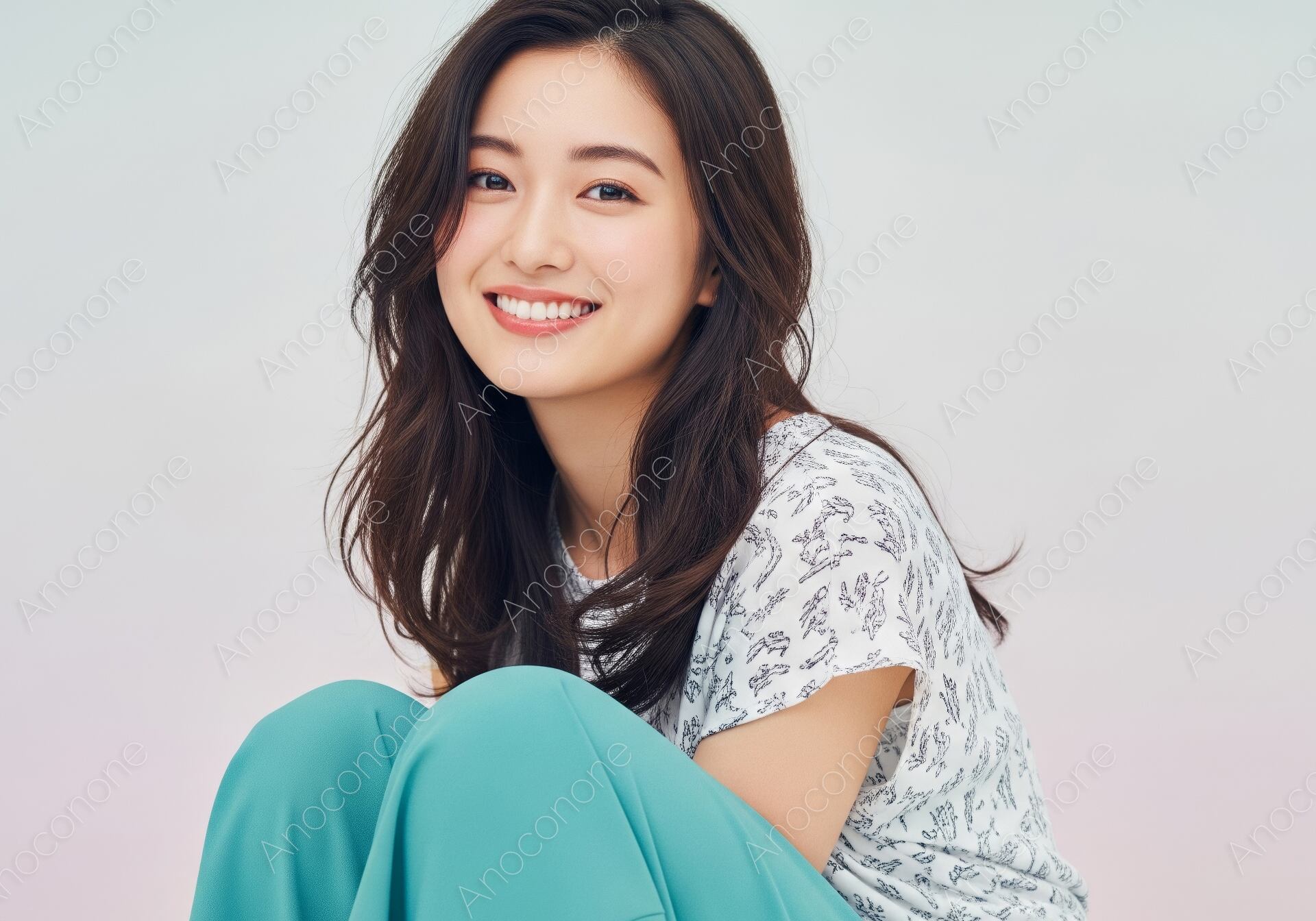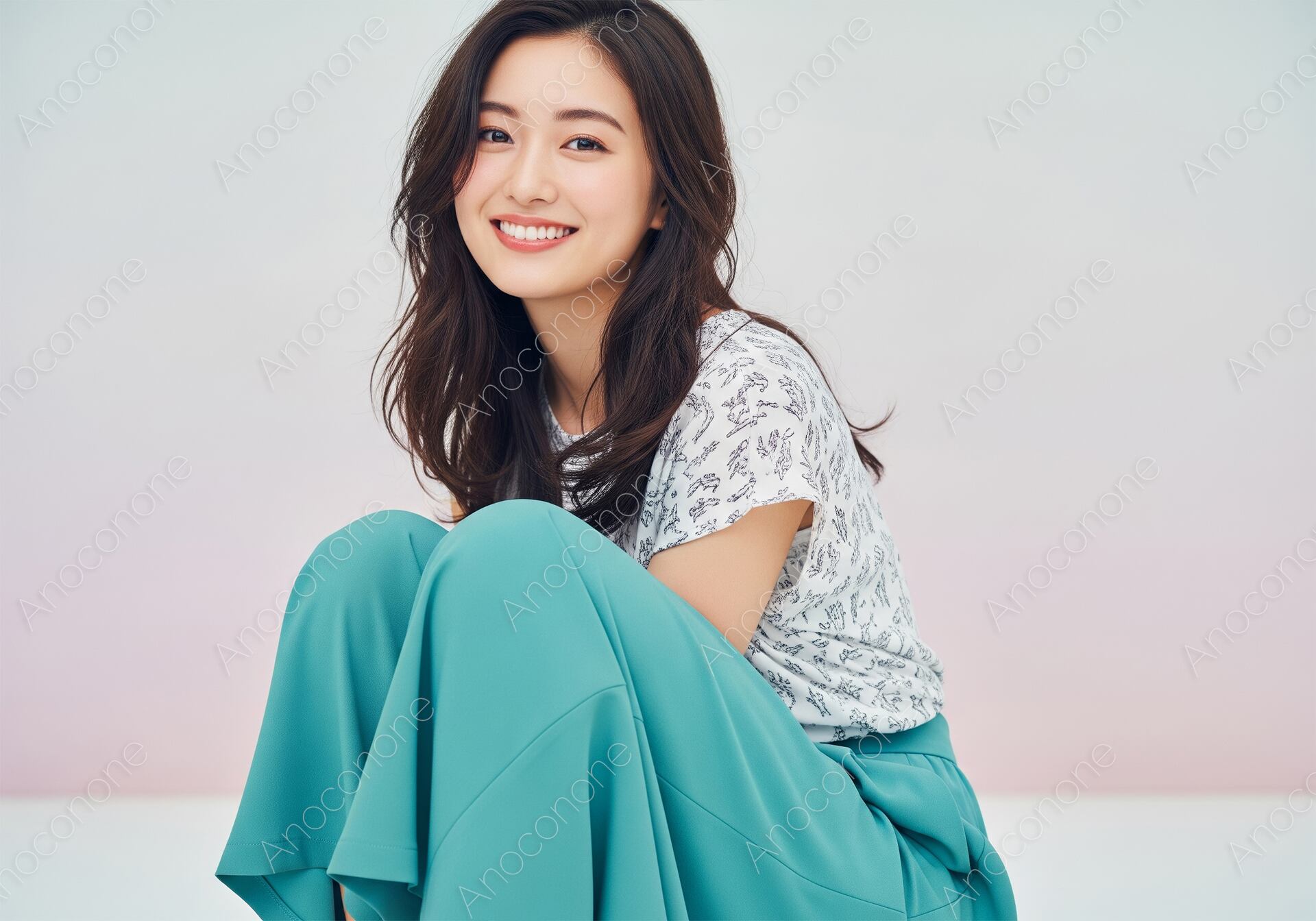 画像素材:白から淡いピンクへと変化する柔らかなグラデーション背景の前で、涼しげな総柄のトップスに鮮やかなエメラルドグリーンのワイドパンツを合わせた女性を捉えた一枚です。トップスの繊細なラインアート風のプリントが、コーディネートに軽やかさと知的なアクセントを添えています。目を引くグリーンのボトムスは、夏の清涼感と都会的な洗練さを同時に演出し、見る人にポジティブで爽やかな印象を与えます。豊かに巻かれたブラウン系のロングヘアが顔周りを華やかに彩り、屈託のない明るい笑顔が被写体の自然体な魅力を引き立てています。床に座り込んだリラックスしたポージングは、休日の穏やかなひとときや、大人の余裕を感じさせる構成です。全体に回った均一なライティングが、肌の透明感や衣装の色彩を鮮明に描写しており、非常に高品質なビジュアルに仕上がりました。夏のレディースファッション特集や、ライフスタイルを提案するメディア、親しみやすさと清潔感を重視する広告素材として最適な一枚です。