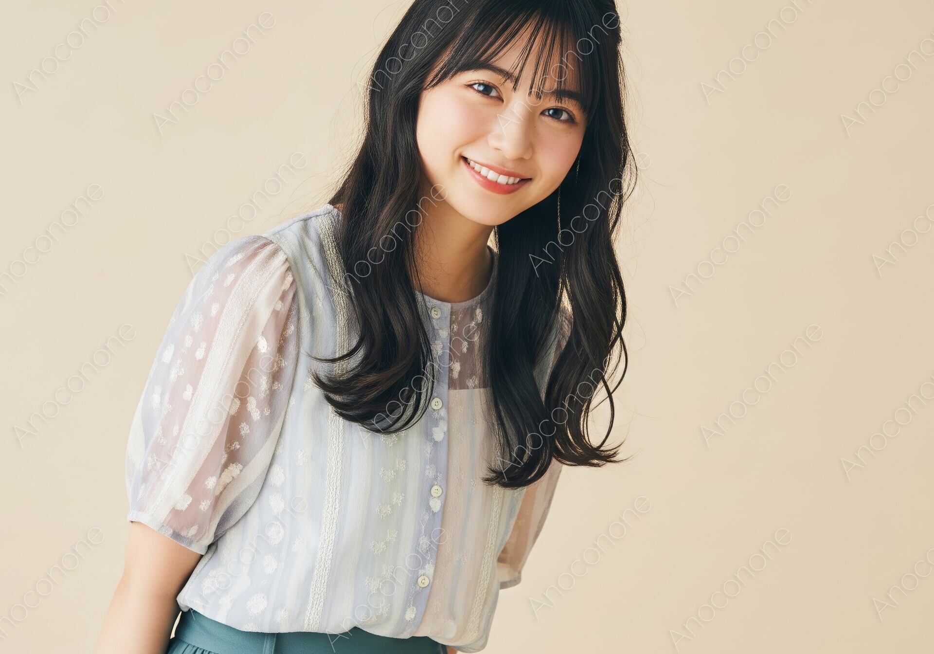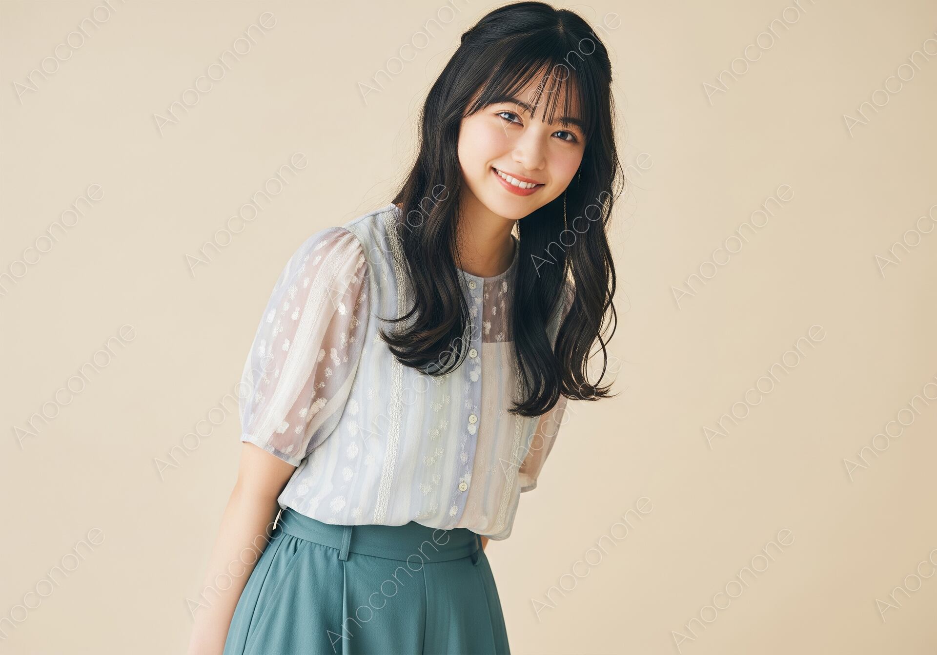 画像素材:落ち着いたベージュの背景に、淡いブルーを基調としたシアー素材のパフスリーブブラウスとグリーンのパンツを合わせた、清楚で可憐な装いの女性を捉えた一枚です。ブラウスにあしらわれた繊細なドット柄と透け感のある袖のデザインが、夏の涼やかさと女性らしい柔らかな雰囲気を演出しています。小首をかしげた愛らしいポージングと、輝くような明るい笑顔が、見る人に親しみやすさと多幸感を与えます。丁寧に整えられたハーフアップのロングウェーブヘアが、上品で洗練された印象をより一層引き立てています。全体を優しいパステルカラーで統一し、柔らかなライティングを施すことで、肌の透明感や衣装の質感を美しく表現した高品質な構成です。夏のデートファッションの提案や、清楚な女性像を強調したい美容関連の広告、ライフスタイルを彩るウェブサイトのアイキャッチとして最適な素材です。