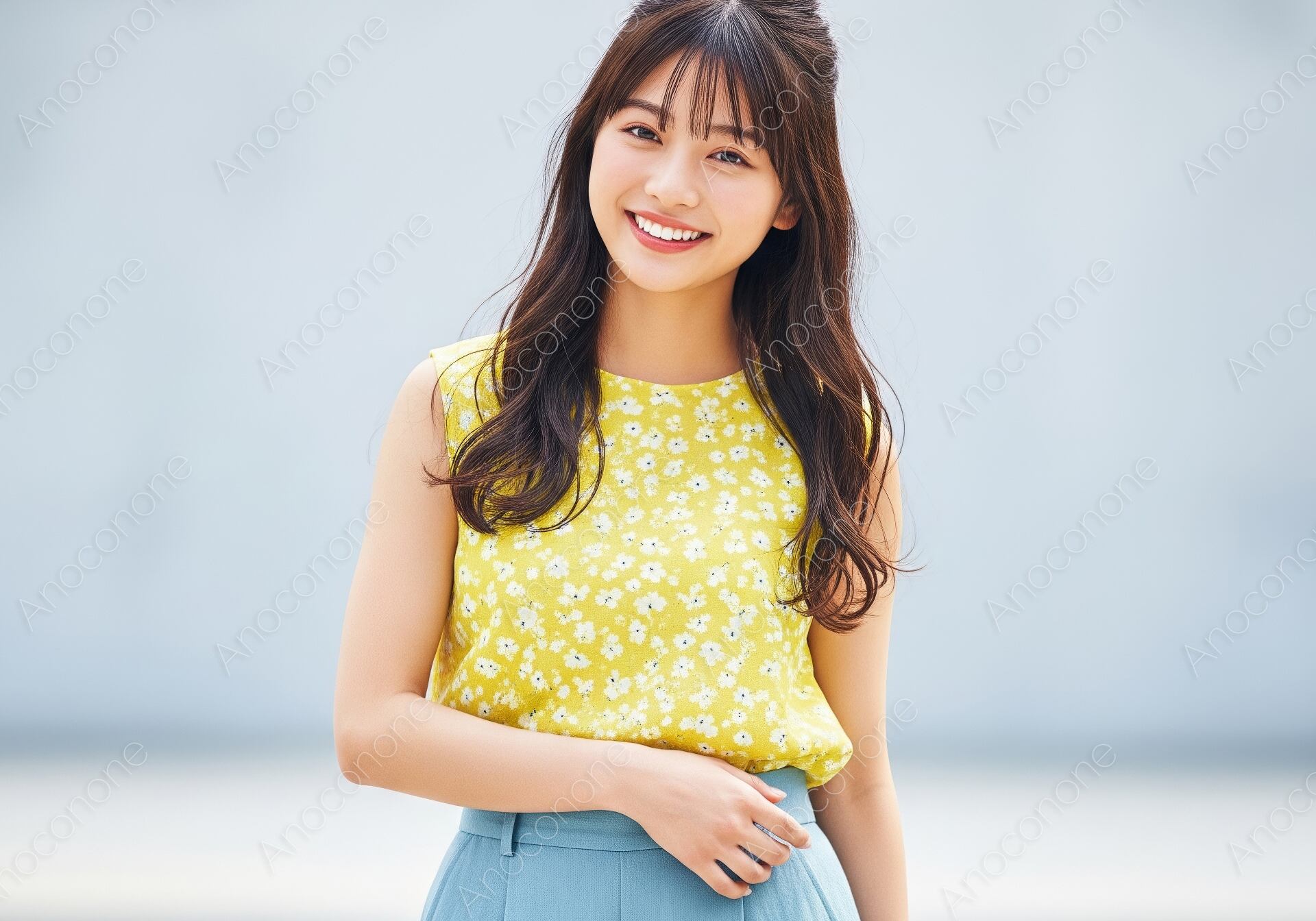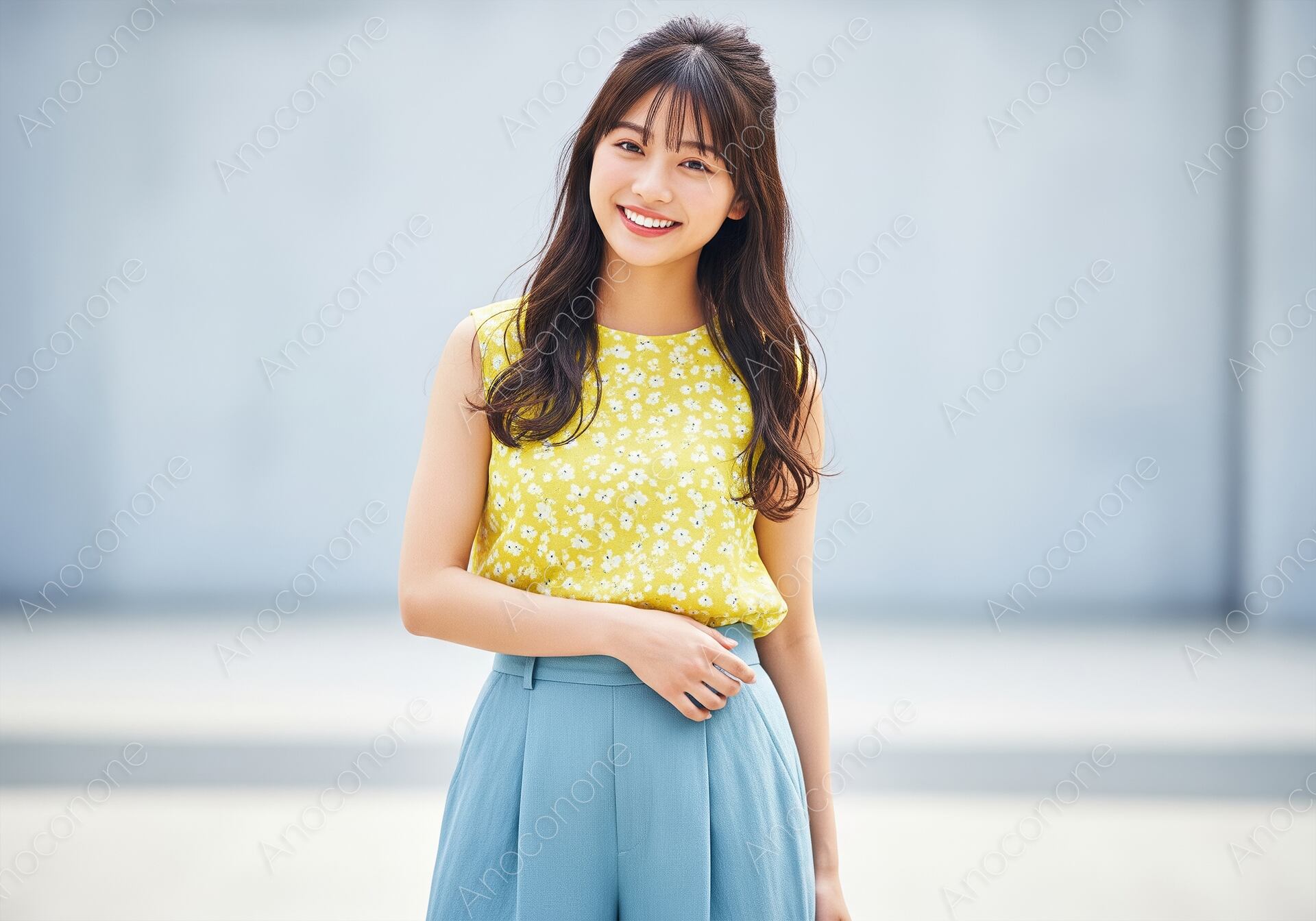 画像素材:明るい自然光が降り注ぐ屋外で、鮮やかなイエローの小花柄ノースリーブブラウスに、涼しげなブルーのワイドパンツを合わせた女性のポートレートです。ブラウスに散りばめられた白い花々が、夏の太陽の下で弾けるような明るさと可愛らしさを演出し、補色関係にあるブルーのボトムスがコーディネート全体を爽やかに引き締めています。顔周りをすっきりと見せるハーフアップのロングウェーブヘアと、屈託のない輝くような笑顔が、見る人にポジティブで清潔感あふれる印象を与えます。背景をニュアンスのあるグレーにぼかすことで、被写体の鮮やかな色彩と生き生きとした表情をより一層際立たせています。自然な光の回りが肌の透明感や衣装の質感を健康的に描写した、非常にクリーンで高品質な構成です。夏のデイリーファッションの提案や、お出かけをテーマにしたライフスタイルメディア、親しみやすさと華やかさを両立させたい広告素材として最適な一枚です。