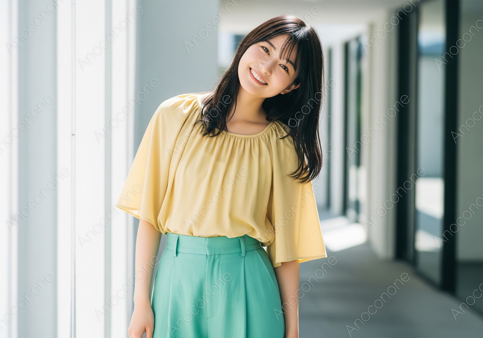 画像素材:明るい陽光が差し込むモダンな通路を背景に、柔らかなイエローのフレアスリーブブラウスと、鮮やかなミントグリーンのワイドパンツを合わせた女性を捉えた一枚です。ブラウスの首元に施された繊細なギャザーと、風を孕むような袖のシルエットが、夏らしい軽やかさと女性らしい優美さを演出しています。反対色に近いパステルカラー同士を組み合わせた高度な配色が、都会的で洗練された印象を与え、見る人の目を引きます。小首をかしげて屈託のない笑顔を見せる表情は、親しみやすさとポジティブなエネルギーに満ち溢れています。背景の直線的な建築美と、降り注ぐ強い光が画面にダイナミックなコントラストを生み出し、被写体の透明感をより一層際立たせています。夏のタウンユースや旅行をイメージしたファッション特集、爽やかなライフスタイルを提案する広告ビジュアル、SNSプロモーションのメイン画像として最適な、非常に訴求力の高い高品質な素材です。