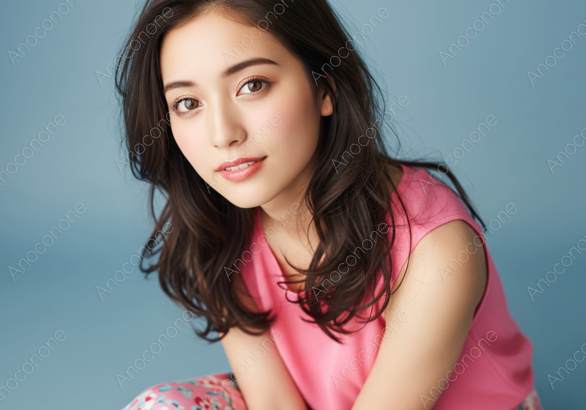 画像素材:落ち着いたブルーの背景に、鮮やかなピンクのノースリーブブラウスと、ピンクを基調とした可憐な小花柄のパンツを合わせた、大人可愛いリラックススタイルの女性です。トップスのシンプルなシルエットが、ボトムスの華やかなボタニカルプリントを引き立て、夏らしい躍動感と女性らしい柔らかさを両立させています。床に座り込んだ自然体なポージングと、こちらをじっと見つめるアンニュイで知的な眼差しが、見る人を惹きつける独特の空気感を醸し出しています。豊かに流れるブラウン系のロングウェーブヘアが顔周りにエレガントな影を落とし、洗練された都会的な美しさを演出しています。スタジオでの柔らかなライティングにより、肌の質感や衣装の繊細な色彩が丁寧に描写されており、非常にクリーンで高品質なビジュアルです。夏のホームウェアやリラックスファッションの提案、美容・コスメ関連の広告、あるいは情緒的なライフスタイルをテーマにしたメディアのメイン画像として最適な一枚です。