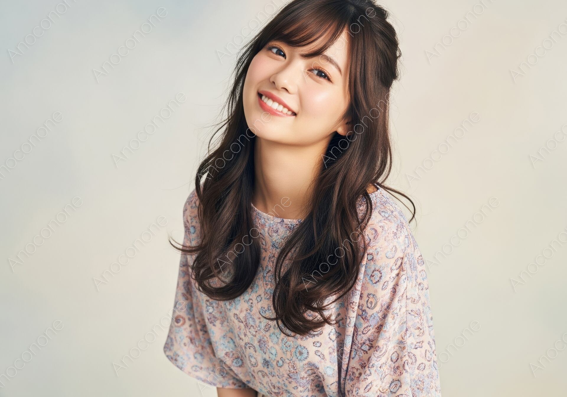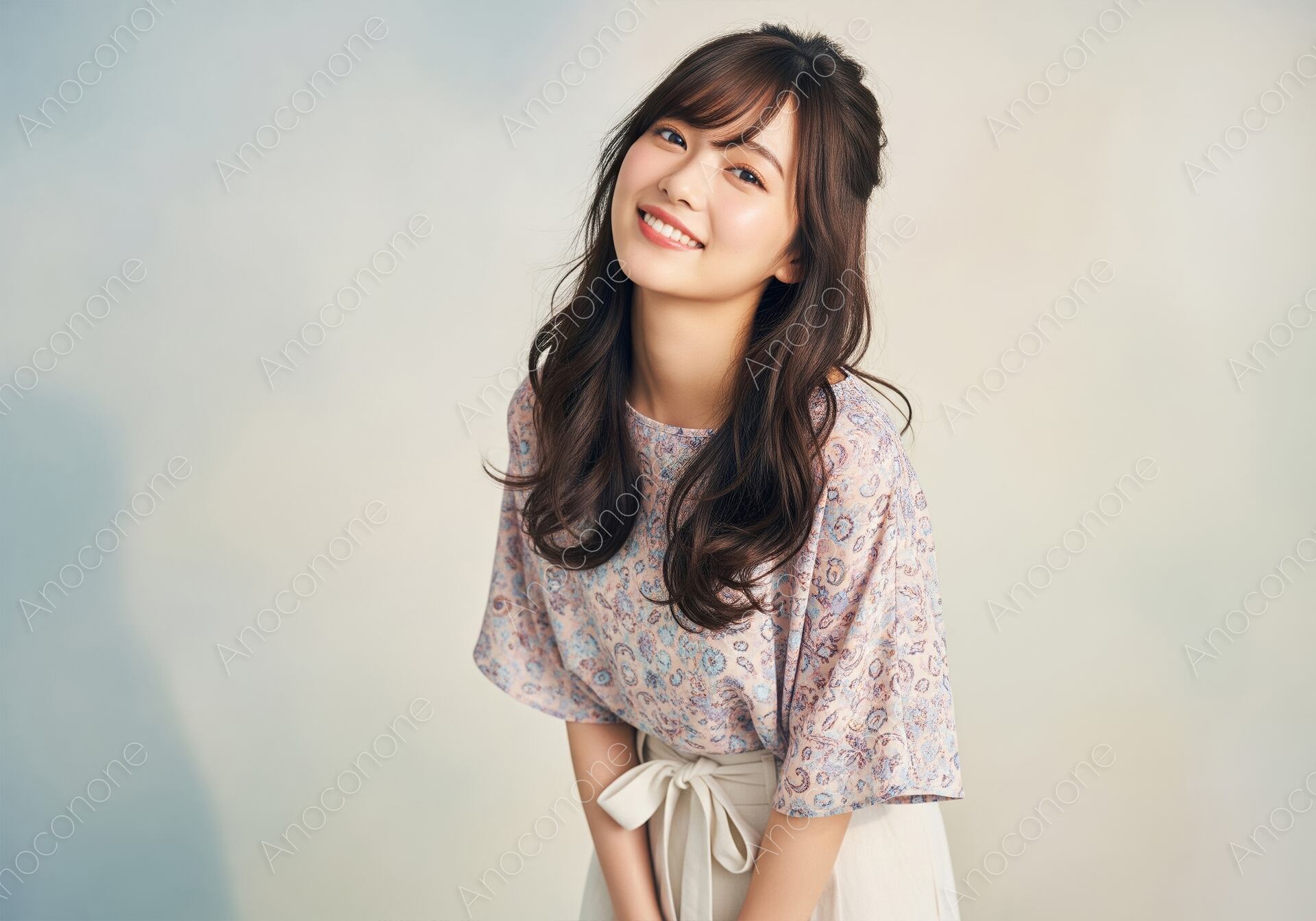 画像素材:柔らかなニュアンスカラーの背景を背に、淡いブルーとピンクのペイズリー柄が施されたブラウスと、ウエストのリボンが目を引く白のパンツを合わせた、エレガントな装いの女性を捉えた一枚です。ブラウスのゆったりとしたフレアスリーブが、夏の涼やかさと女性らしいしなやかなシルエットを演出しています。ハイウエストのパンツに共布のリボンを結ぶことで、重心を高く見せ、洗練された都会的なスタイルを完成させています。ハーフアップに整えられた豊かなロングウェーブヘアが、被写体の知性的で優しい表情を際立たせ、見る人に上品な多幸感を与えます。スタジオでの柔らかなライティングが、衣服の繊細な柄や肌の透明感を美しく描写した高品質なビジュアルです。大人のフェミニンスタイルを提案するファッションメディアや、清潔感と華やかさを重視する広告、ライフスタイルを彩るウェブサイトのメインビジュアルとして最適な素材です。