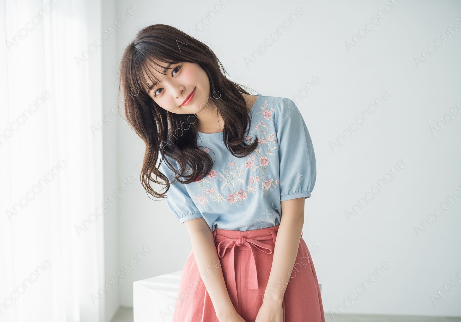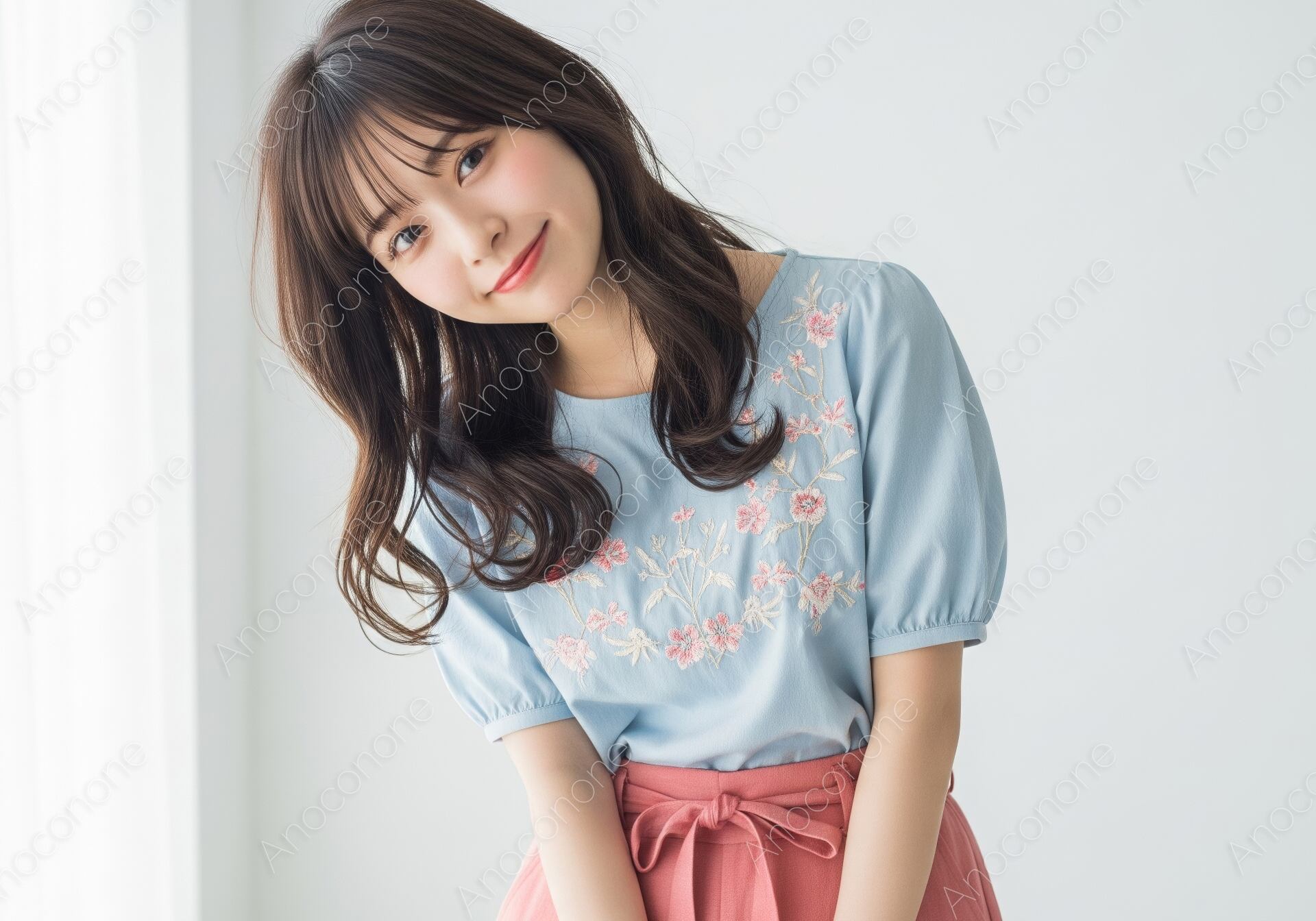 画像素材:柔らかな自然光が差し込む明るい室内を背景に、胸元にピンクの花刺繍をあしらったライトブルーのパフスリーブブラウスと、共布のリボンがアクセントのピンクのパンツを合わせた女性を捉えた一枚です。ブラウスのふんわりとした袖のデザインと、繊細な手仕事を感じさせる刺繍が、夏の装いに上品な甘さと可憐さを添えています。ボトムスの暖かみのあるピンクがトップスの寒色を引き立て、全体を優しいパステルカラーのトーンでまとめた、多幸感あふれるコーディネートです。ゆるやかに巻かれたロングヘアをサイドに流し、小首をかしげて穏やかに微笑むポージングが、被写体の持つ清楚で愛らしい魅力を最大限に引き出しています。白を基調としたクリーンな空間と、窓からの柔らかな透過光が、肌の透明感や衣装の質感を美しく描写した高品質なビジュアルです。夏のデートスタイルや、自分らしさを大切にする女性のためのファッション特集、ライフスタイルブランドの広告素材として最適な一枚です。