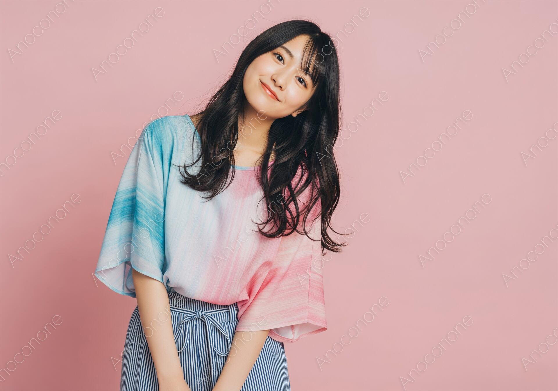 画像素材:柔らかなピンクの背景に、ブルーからピンクへと移り変わる繊細なグラデーションが目を引くフレアスリーブブラウスと、細かなストライプ柄のワイドパンツを合わせた女性を捉えた一枚です。ブラウスの流れるような色の変化と、風を孕むような袖のシルエットが、夏らしい清涼感とアーティスティックな華やかさを演出しています。ウエストに施された共布のリボンが、リラックスしたスタイルの中にも洗練された女性らしさを添え、メリハリのある美しい着こなしを実現しています。豊かに波打つ黒髪のロングヘアをサイドに流し、小首をかしげて穏やかに微笑む表情は、見る人に上品で落ち着いた多幸感を与えます。スタジオでの均一で柔らかなライティングが、衣装の絶妙な色彩表現や肌の透明感を美しく描写した高品質なビジュアルです。夏のトレンドカラーを取り入れたファッション特集や、優雅なライフスタイルを提案するメディア、存在感のあるアイキャッチを求める広告プロモーションに最適な素材です。