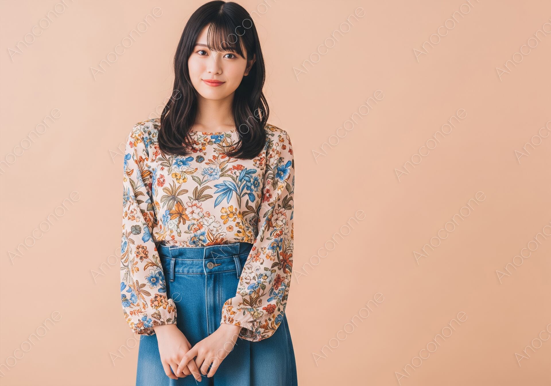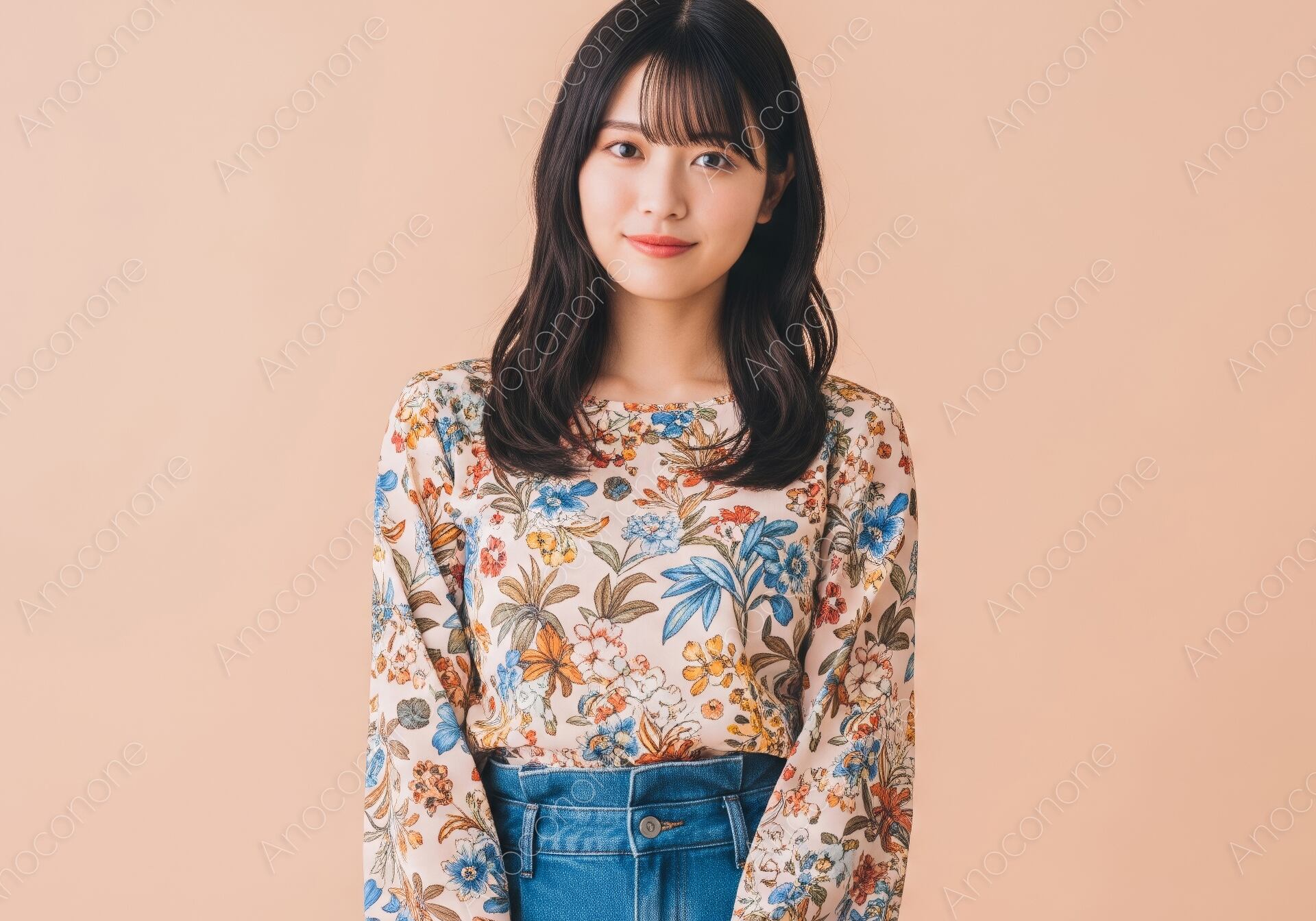 画像素材:温かみのあるベージュの背景に、彩り豊かなボタニカル柄のボリューム袖ブラウスと、ストレートシルエットのデニムを合わせた大人のカジュアルスタイルを捉えた一枚です。ブラウス全面に描かれた繊細な草花のプリントが、夏の装いにエレガントな華やぎと自然体な美しさを添えています。ふんわりとしたボリューム袖のラインが女性らしい柔らかなシルエットを作り出し、デニムと合わせることで甘さを抑えた洗練された着こなしを実現しています。シースルーバングを取り入れた黒髪のロングヘアが、被写体の知性的で落ち着いた表情を引き立て、真っ直ぐにこちらを見つめる眼差しが、見る人に誠実で上品な印象を与えます。スタジオでの柔らかなライティングが、衣装の細かなディテールや肌の質感を丁寧に描写した高品質なビジュアルです。夏の日常を彩るフェミニンカジュアルな提案や、自分らしいスタイルを大切にする女性に向けたファッション特集、ライフスタイルをテーマにした広告素材として最適な一枚です。