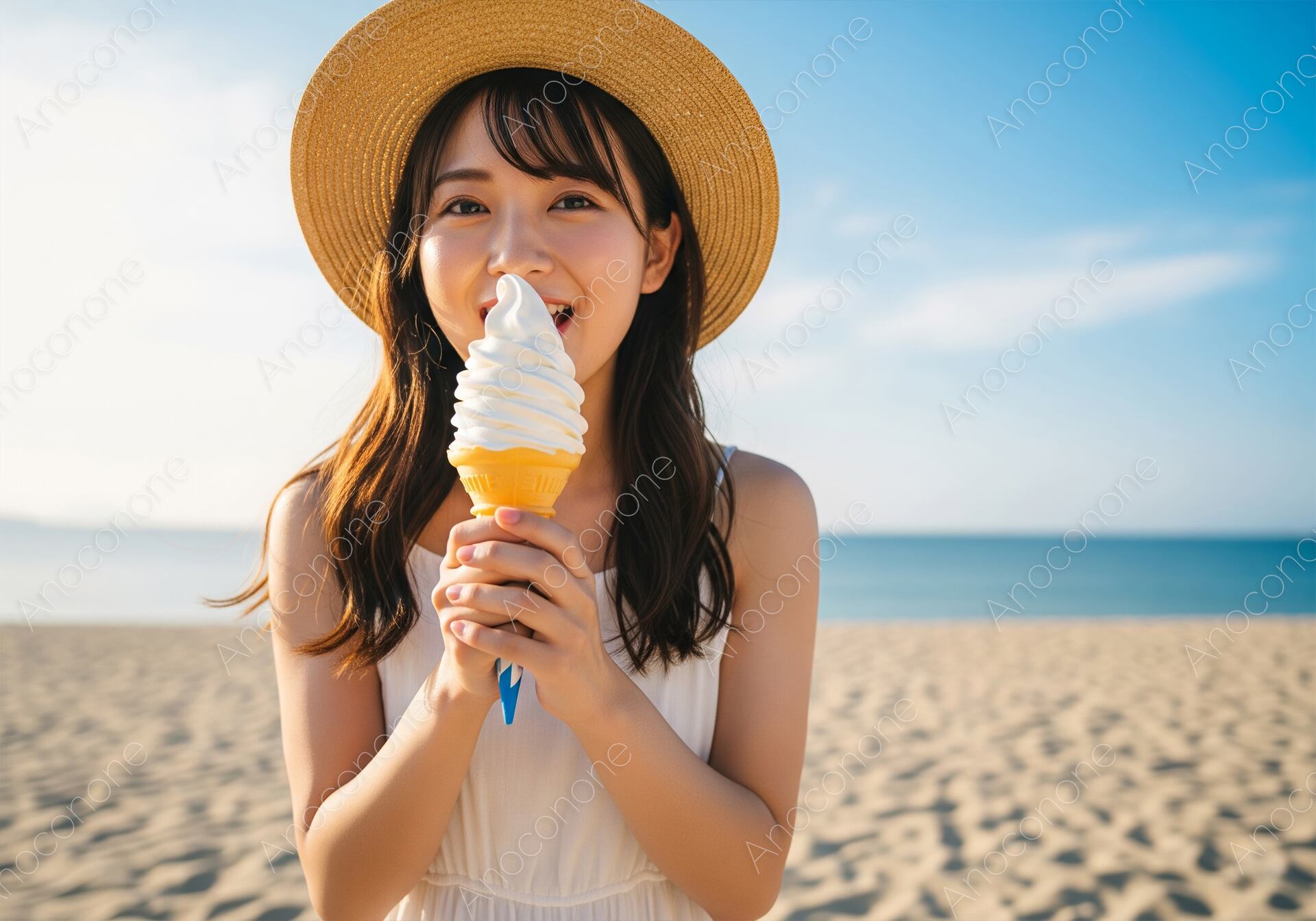 画像素材:抜けるような青空と穏やかな水平線が広がるビーチで、大きなストローハットを被った女性がソフトクリームを愉しむ、夏らしさ全開の一枚です。清潔感のある白いワンピースが、太陽の光を反射して輝く砂浜と美しく調和し、清楚で爽やかなバカンススタイルを演出しています。ソフトクリームを今まさに口に運ぼうとする、無邪気で幸せそうな表情は、見る人に夏の高揚感と涼やかな多幸感を与えます。背景の広大な海と砂浜をボケ味豊かに描写することで、被写体の瑞々しい存在感と、夏の午後のゆったりとした時間の流れを際立たせています。自然光が肌の透明感や衣装の質感を鮮明に映し出した、非常にクリーンで高品質なビジュアルです。旅行・観光のプロモーション、夏限定スイーツの広告、あるいは季節感あふれるライフスタイルメディアのメイン画像として、高い訴求力を発揮する素材です。