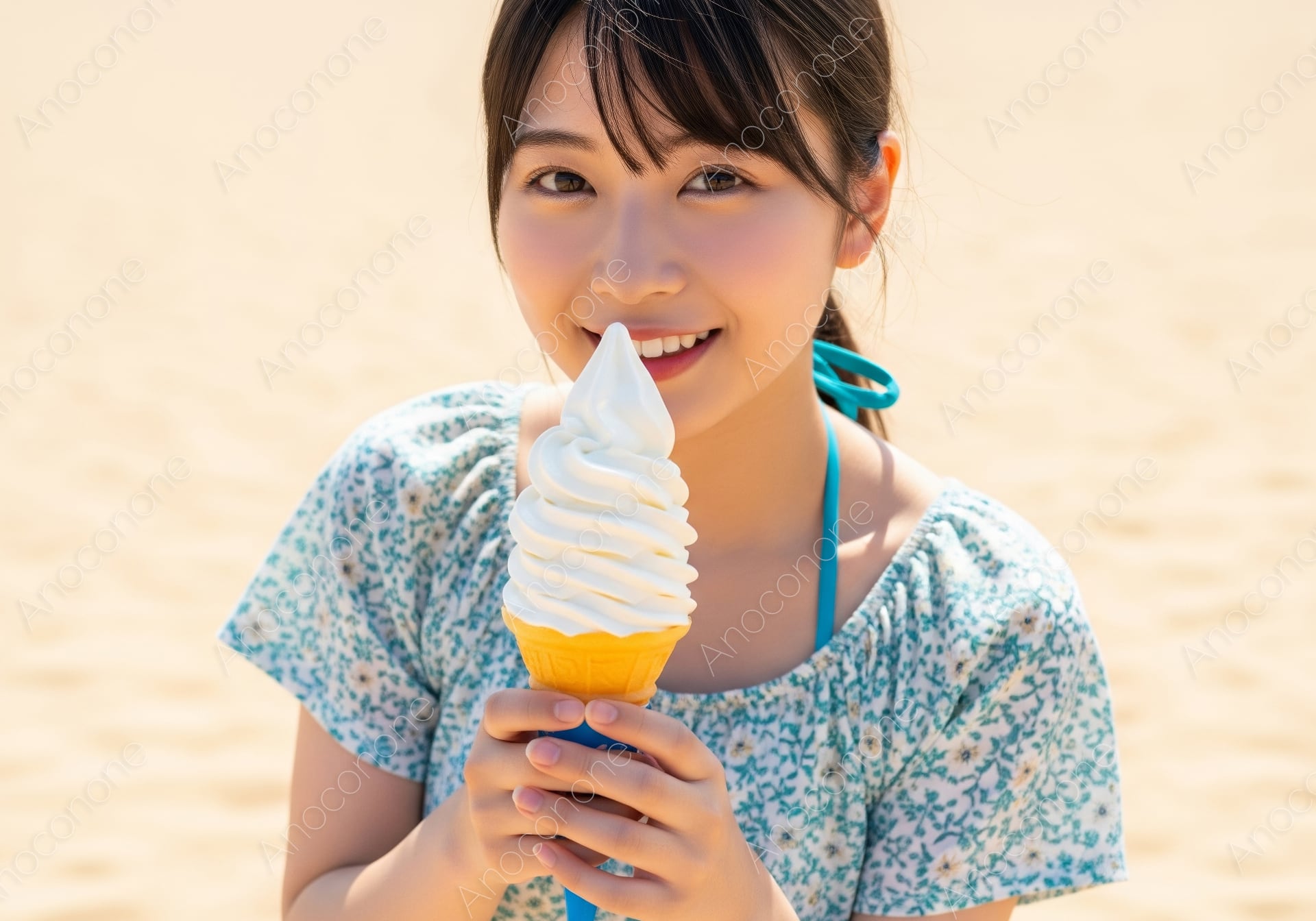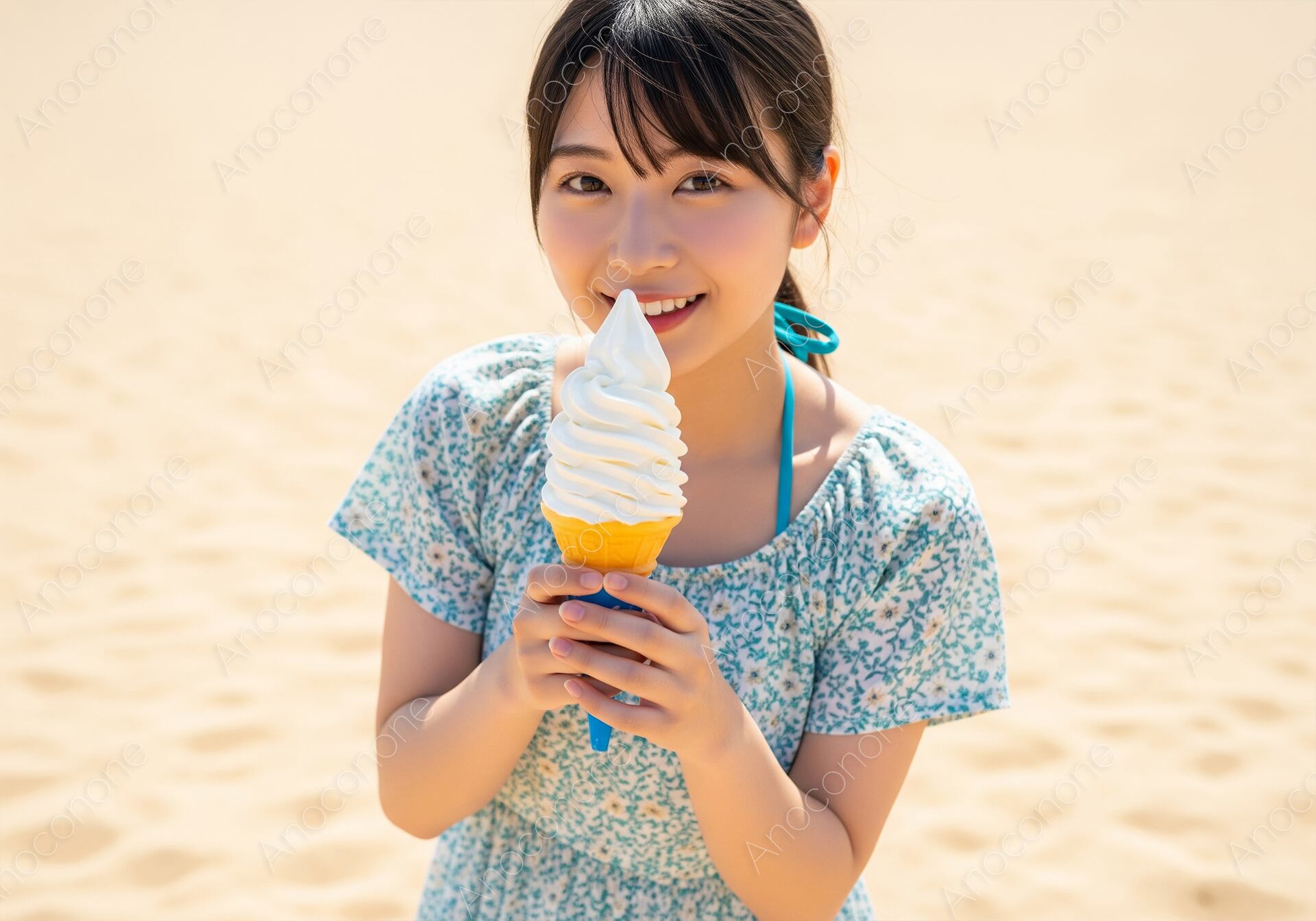 画像素材:眩いばかりの陽光が降り注ぐ広大な砂浜を背景に、真っ白なソフトクリームを手に幸せそうな笑顔を浮かべる女性を捉えた一枚です。水色の小花柄があしらわれたパフスリーブのワンピースは、ホルターネックのデザインがアクセントとなり、夏のビーチにふさわしい可憐で涼やかな印象を与えています。背景の砂浜を明るくぼかすことで、ソフトクリームの瑞々しい質感と、被写体の透明感あふれる表情がより一層際立っています。太陽の下で冷たいスイーツを愉しむ姿は、見る人に夏の高揚感と爽やかな多幸感をダイレクトに伝えます。全体を包み込む柔らかな自然光が、肌のきめ細かさや衣装のディテールを美しく描写した高品質なビジュアルです。夏のリゾートファッションの提案、海辺のスイーツショップの広告、あるいはバカンスをテーマにしたライフスタイルメディアのメイン画像として最適な素材です。