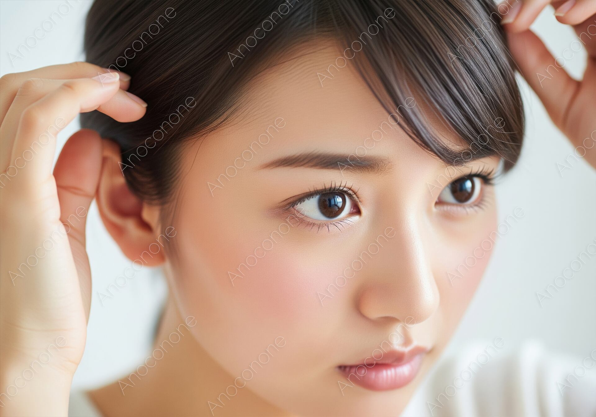 画像素材:明るくクリーンな背景の中で、鏡に向かって自分の髪の根元や生え際を念入りにチェックしている女性のクローズアップです。両手を髪に添え、細部まで確認するような真剣な眼差しが、日常的な美容意識の高さや、髪の悩みに対するリアルな関心を表現しています。透明感のある肌と整えられた眉、そして自然なツヤを湛えた髪の質感が、被写体の清潔感を際立たせています。顔のパーツに寄った構図が、視聴者の視線を自然と「髪の状態」へと誘導し、共感を呼ぶビジュアルとなっています。柔らかな光が顔立ちを優しく照らし出し、肌や髪のディテールを鮮明に描写した高品質な一枚です。スカルプケア製品や育毛・ヘアケア関連の広告、美容メディアのハウツー記事、あるいはサロンでのカウンセリングシーンをイメージさせる素材として最適です。