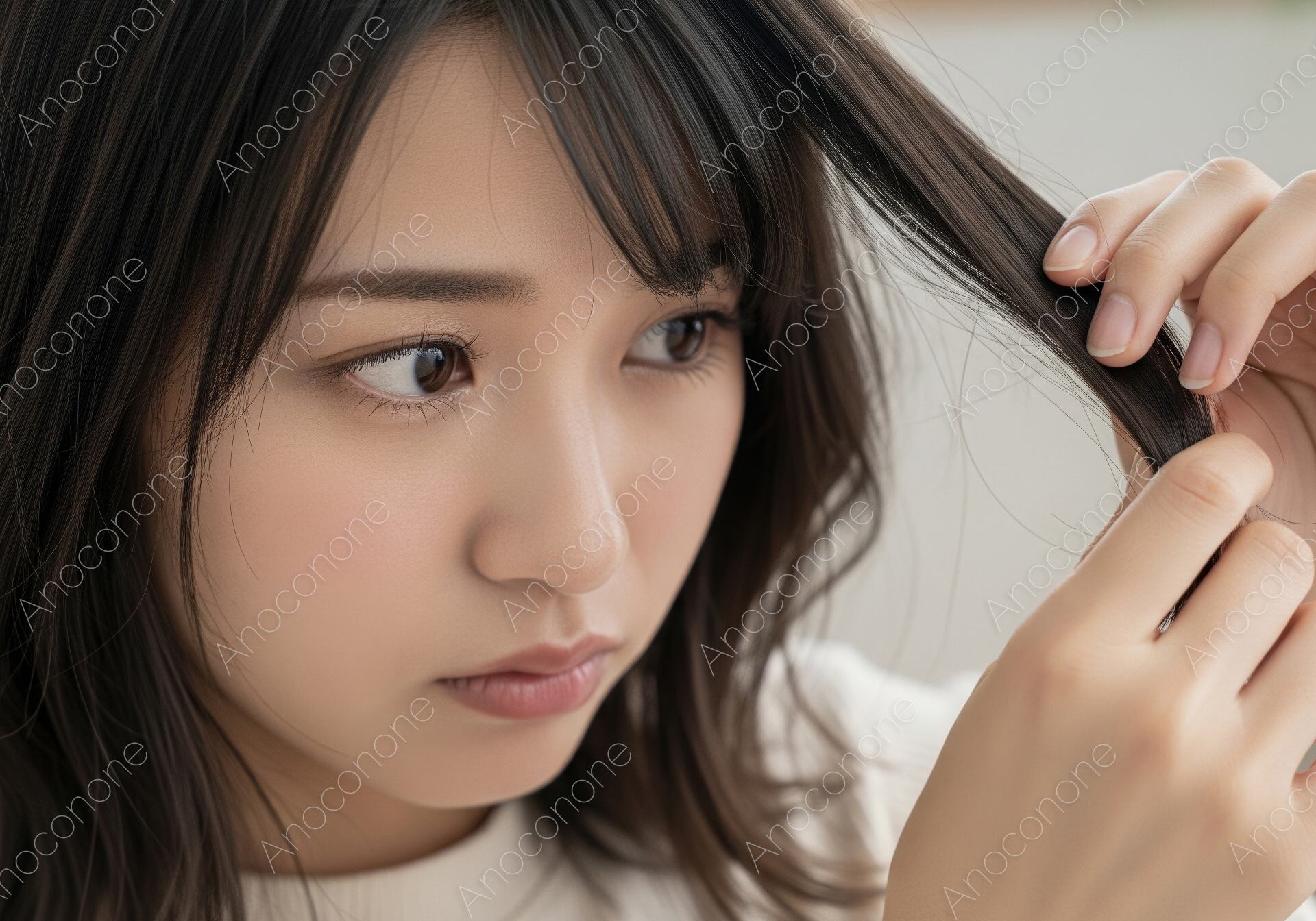 画像素材:室内の穏やかな光の中で、自分の髪を一房手に取り、毛先の状態を念入りにチェックしている女性のクローズアップです。指先で髪を細かく分け、ダメージやパサつきを確かめるような少し不安げで真剣な表情が、美髪への高い関心と日常的なヘアケアの重要性をリアルに物語っています。ナチュラルなベージュのトップスと、柔らかく波打つ黒髪の質感が、清潔感のある落ち着いた雰囲気を演出しています。被写体の視線が手元の毛先に集中しているため、見る側の意識も自然と「髪の健康状態」へと向く、訴求力の高い構図です。柔らかなライティングが、髪の一本一本のディテールや肌の透明感を丁寧に描写した高品質な一枚です。トリートメントやヘアオイルなどのヘアケア製品のプロモーション、サロンでの毛髪診断コンテンツ、ダメージケアをテーマにした美容ブログのアイキャッチなどに最適です。