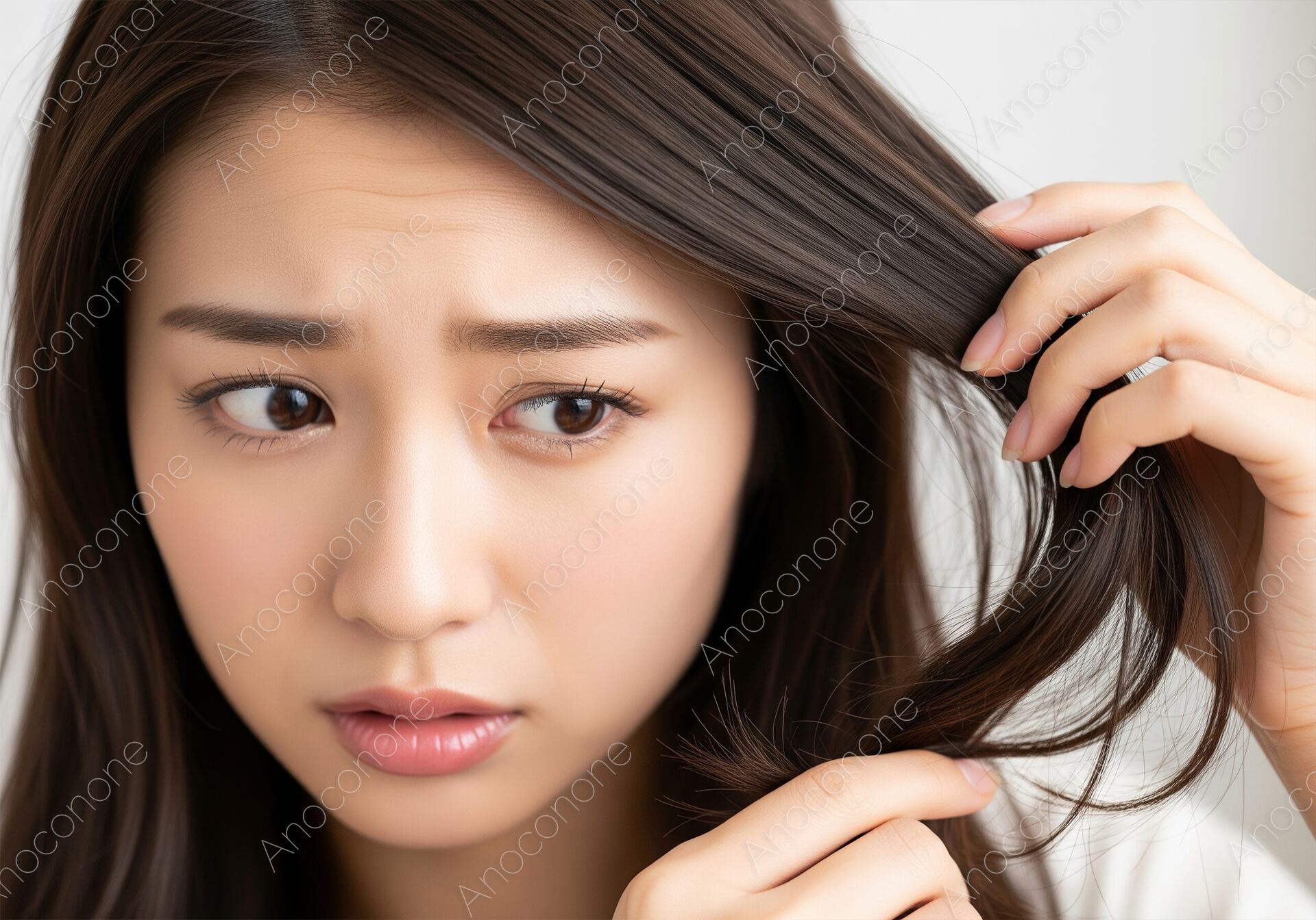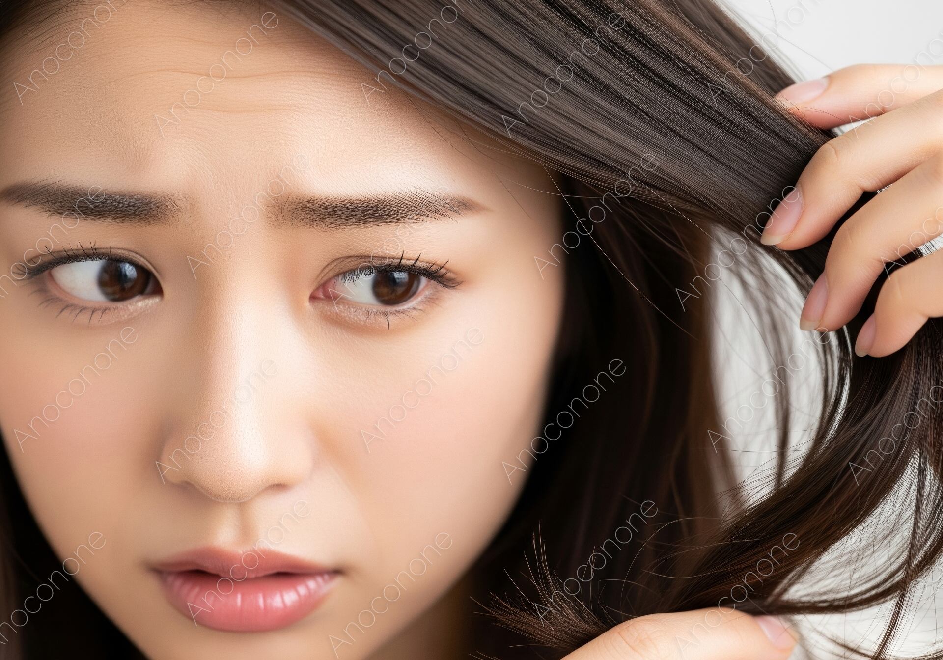 画像素材:至近距離から、自分の髪を一房手に取り、その状態を非常に真剣な、あるいは少し深刻な表情で見つめる女性を捉えたクローズアップです。指先で毛先を広げ、枝毛やパサつき、切れ毛などのダメージを細かく確認している様子が、美髪に対する強いこだわりと、日々のヘアケアへの意識の高さをリアルに伝えています。整えられた眉や透明感のある肌、そして手入れの行き届いた髪の質感が、被写体の清潔感あふれる美しさを際立たせています。視聴者の視線が自然と「髪の健康状態」に集中する構図となっており、髪に悩みを持つ層への強い共感と訴求力を生み出しています。柔らかなライティングが、髪の自然な光沢や指先のディテールを鮮明に描写した高品質なビジュアルです。高機能シャンプーやトリートメント、ヘアオイルなどの広告、美容室でのダメージ診断用素材、また髪のトラブル解決をテーマにしたウェブメディアのアイキャッチなどに最適な一枚です。
