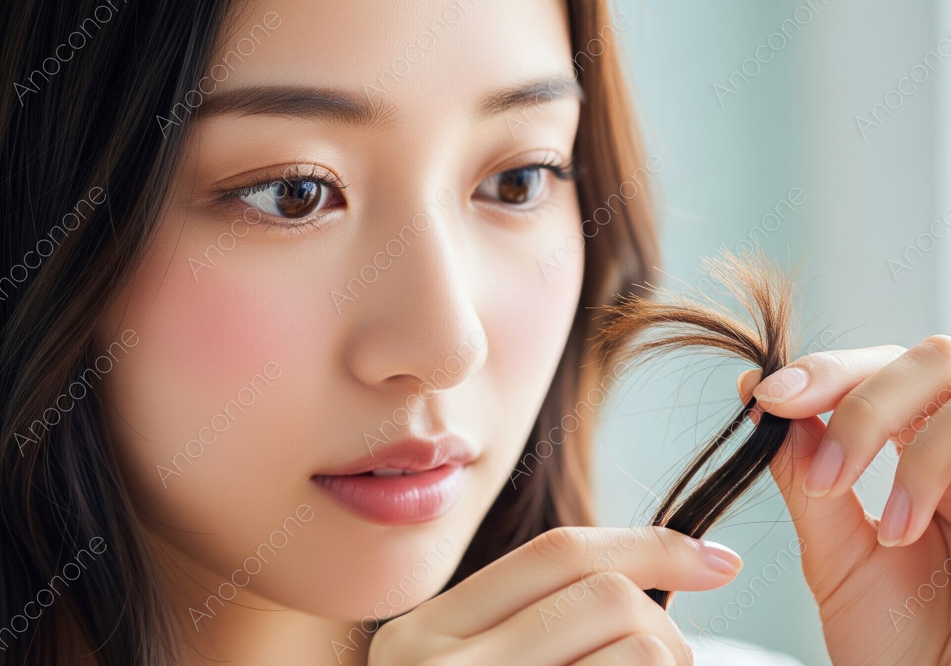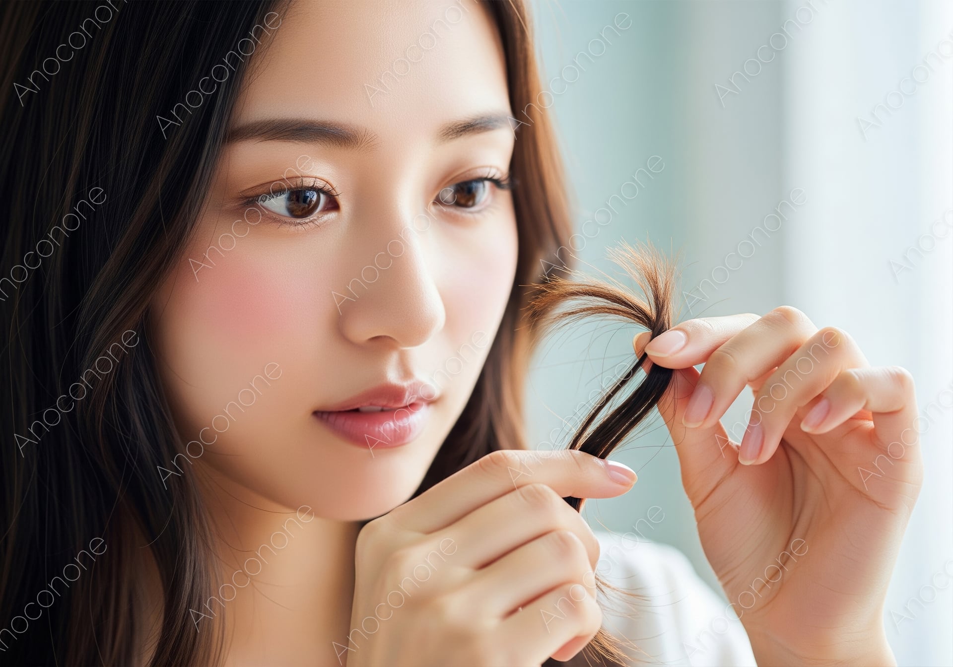 画像素材:明るく清潔感のある室内で、自分の髪を一房手に取り、毛先のダメージを至近距離で確認している女性のクローズアップです。指先で細かく分かれた毛先をじっと見つめる真剣な眼差しから、枝毛やパサつきといった具体的な髪の悩みに対するリアルな心理が伝わってきます。透明感のある肌と、丁寧に整えられた眉、そして手入れの行き届いた髪の質感が、被写体の持つ本来の美しさを際立たせ、視聴者に「ケアの重要性」を強く印象づけます。顔のパーツに寄った構図が、見る側の意識を自然と髪のディテールへと誘導し、共感を生むビジュアルとなっています。柔らかな光が髪のツヤとダメージを同時に鮮明に描写した、非常に高品質な一枚です。高機能なトリートメントやヘアオイル、枝毛ケア製品のプロモーション、あるいは美容室でのカウンセリングや髪質診断に関連する広告・メディア記事のメイン画像として最適です。