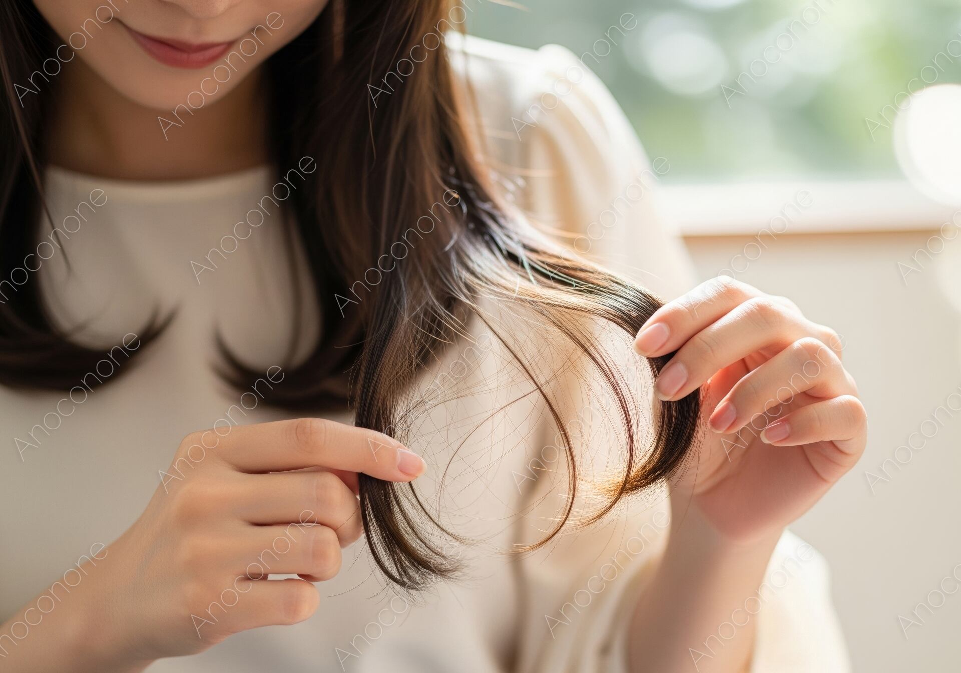 画像素材:明るい日差しが差し込む室内で、リラックスした様子で座りながら、自身の髪を一房手に取って状態を確認している女性の姿を捉えた一枚です。指先で毛先のまとまりやパサつきを確かめるような細やかな動作が、日々の丁寧なセルフケアの瞬間をリアルに描き出しています。背景に広がる柔らかな玉ボケと、窓外の緑を感じさせる明るいライティングが、清潔感と穏やかな空気感を演出しています。顔をあえて画面から外した構図により、視聴者の視線は自然と「手元の髪の質感」へと誘導され、ヘアケアへの意識をより強く喚起させる仕上がりとなっています。デニムに白いブラウスという等身大の装いも相まって、日常のルーティンとしての美容をテーマにしたビジュアルに最適です。シャンプーやトリートメント、ヘアオイルなどの商品紹介、髪質改善を提案する美容メディア、あるいは心地よい暮らしを提案するライフスタイル誌の挿絵として、非常に高いクオリティを誇る素材です。