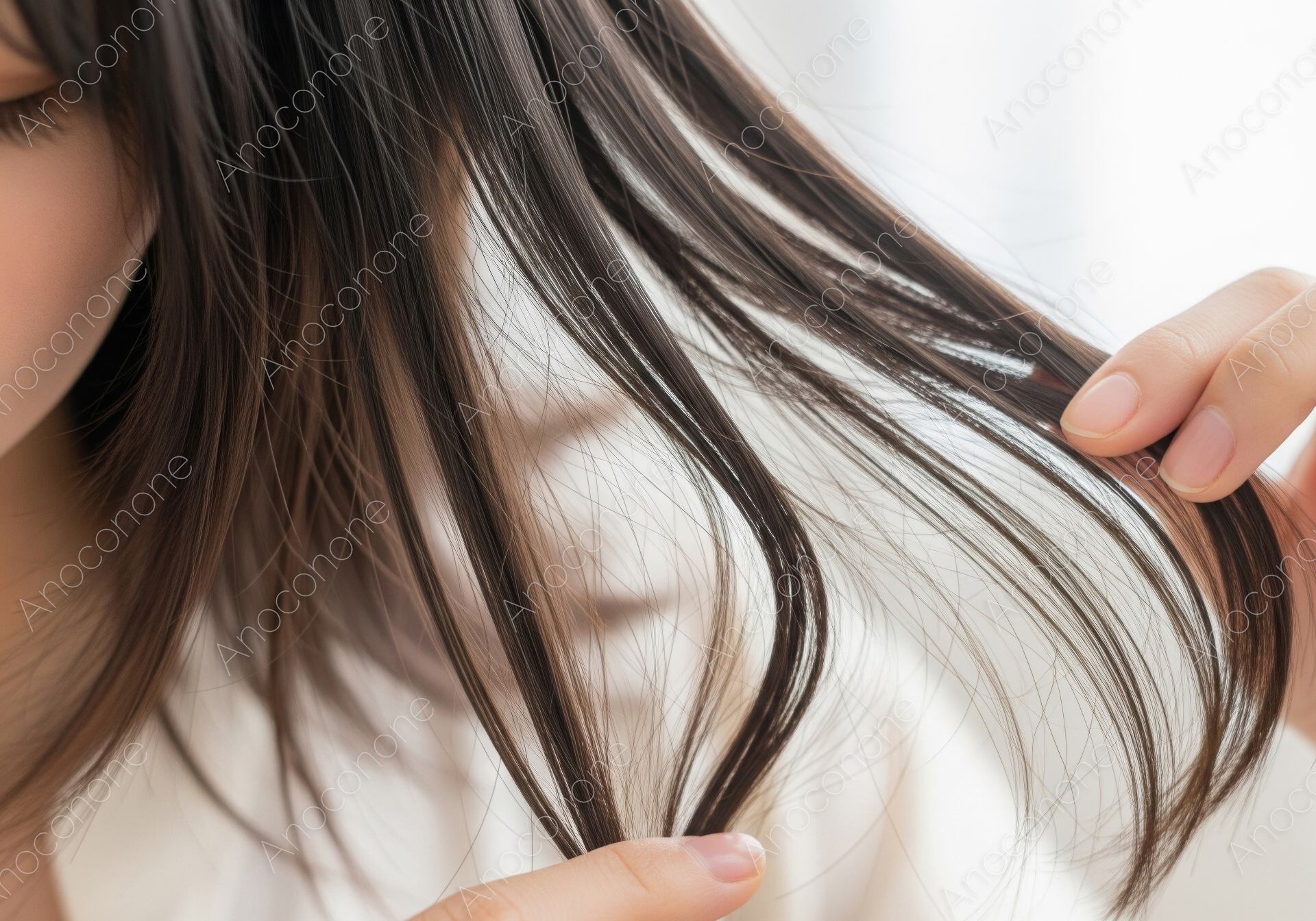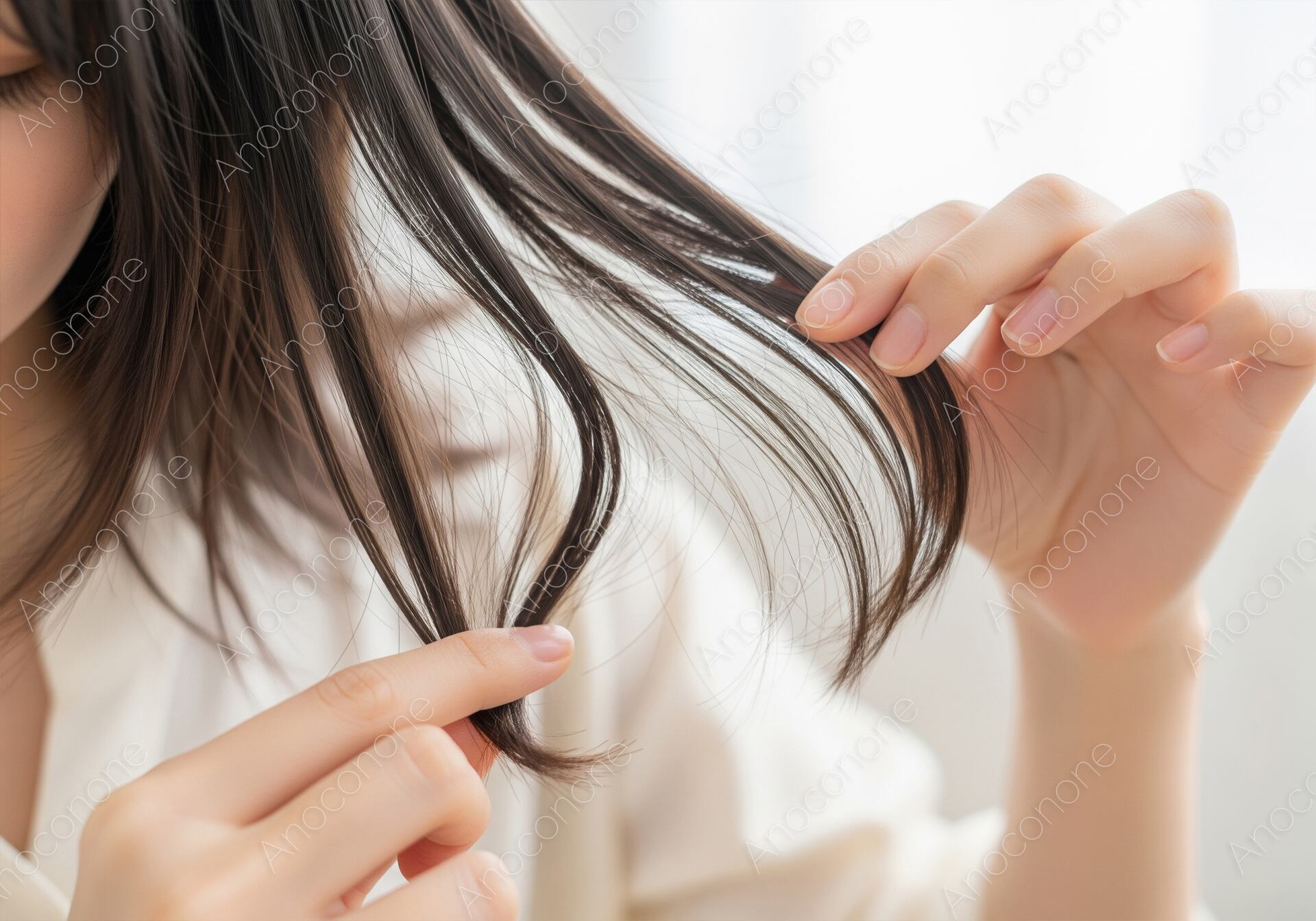 画像素材:自身の髪を指先で数本の束に分け、その質感や毛先のまとまり具合を丁寧に確かめている様子を捉えたクローズアップです。髪の一本一本がバラバラと広がる様子や、指の間をすり抜ける毛束のディテールが、乾燥やパサつきといった髪のコンディションをリアルに伝えています。顔を半分以上フレームアウトさせ、手元と髪の動きにフォーカスした構図は、視聴者に「髪の手触り」を強く意識させ、ヘアケアの必要性を直感的に訴求します。白を基調とした柔らかなライティングが、髪の自然な色味と指先の清潔感を美しく描写しており、高品質なビジュアルに仕上がっています。ヘアオイルやミルク、トリートメントの使用前後を比較するイメージカットや、髪質診断に関するブログの挿絵、またサロンでの日常的なカウンセリングシーンの素材として非常に汎用性の高い一枚です。