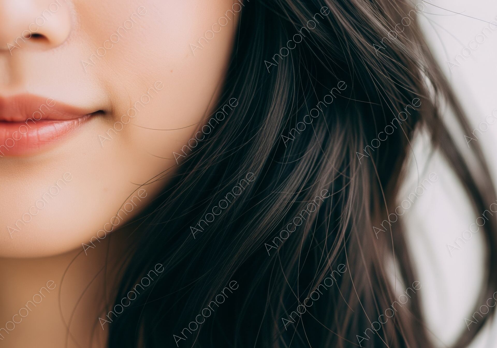 画像素材:緩やかに波打つダークトーンの髪と、瑞々しく潤った唇をドラマチックに切り取ったビューティーポートレートです。髪の一本一本が柔らかな光を反射し、しっとりとした質感を伝える描写は、日常的なヘアケアやトリートメントの成果を象徴しています。あえて顔の左側半分と口元にフォーカスし、背景をシンプルに抑えることで、視聴者の視線を「髪の輝き」と「肌の透明感」に強く惹きつけます。少しだけ微笑んでいるような口元のニュアンスが、自分自身のコンディションに対する自信や喜びを感じさせ、美容へのモチベーションを高めるビジュアルとなっています。ヘアケア製品のメインビジュアル、高級感のあるサロンの広告、リップグロスやスキンケア製品のプロモーション、また美容コラムのアイキャッチなどに最適な、洗練された高品質な一枚です。