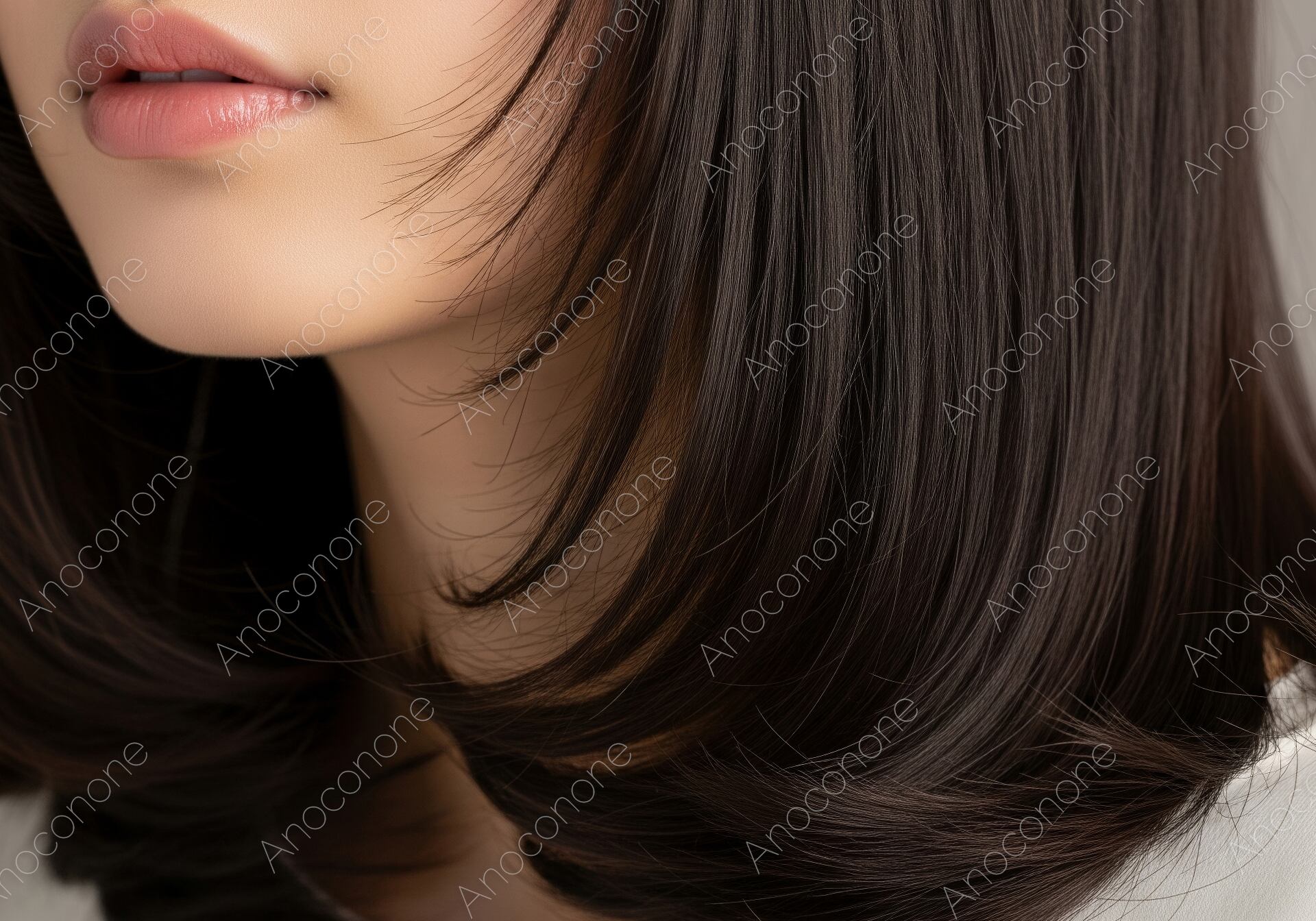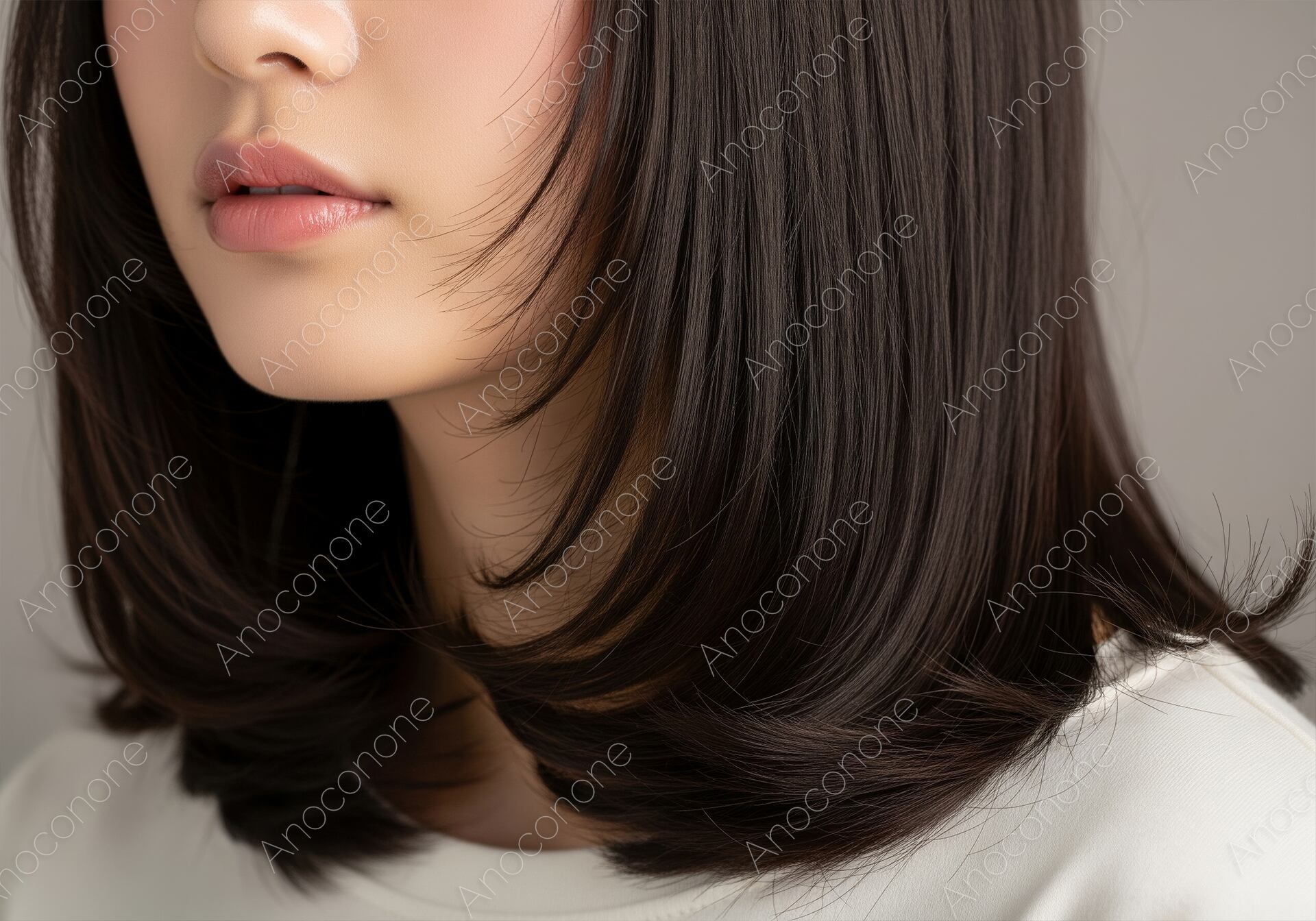 画像素材:計算されたレイヤーカットによって、顔周りから肩にかけて滑らかな曲線を描く髪のディテールを捉えたビューティーフォトです。一本一本が丁寧に整えられ、しっとりと潤いを湛えた髪の質感が、柔らかな光を反射して上品な光沢を放っています。あえて目元を写さず、首元から口元、そして主役である「髪のコンディション」にフォーカスした構図は、視聴者の視線を自然と清潔感あふれる美しさへと惹きつけます。白いトップスがダークトーンの髪色を鮮やかに引き立て、清楚で凛とした大人の女性の魅力を演出しています。サロンでのカットや髪質改善メニューのイメージ、ヘアミルクや美容液などのヘアケア製品のプロモーション、また「上質な日常」をテーマにした美容メディアのメインビジュアルなどに最適な高品質素材です。