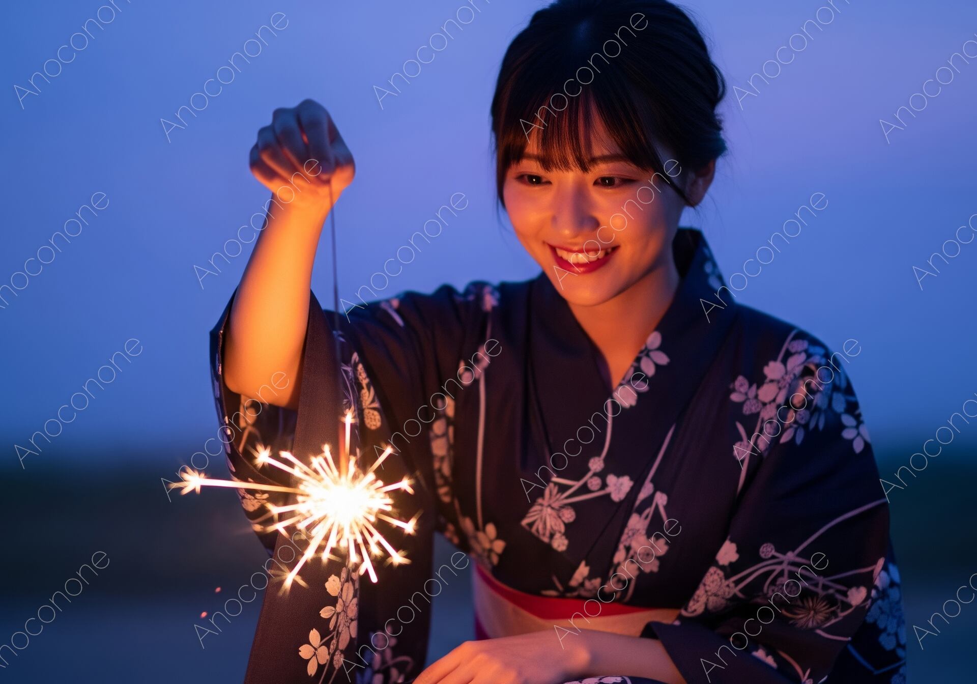 画像素材:空が深い青に染まるマジックアワー、線香花火の柔らかな光に照らされた浴衣姿の女性を捉えた情緒溢れる一枚です。紺地に繊細な白い花模様があしらわれた浴衣が、夕闇の中でしっとりと上品な存在感を放っています。花火から放たれる温かなオレンジ色の火花が、女性の穏やかな笑顔と瑞々しい肌を優しく浮かび上がらせ、幻想的かつドラマチックな雰囲気を演出しています。背景の淡いグラデーションと被写体への柔らかなフォーカスが、夏の夜の静けさと儚さをより一層引き立てる高品質なビジュアルです。観光プロモーションや旅行広告、和装のカタログ、また「日本の夏」や「ノスタルジー」をテーマにしたメディアのメインビジュアルとして、見る人の心に深く訴えかける素材です。