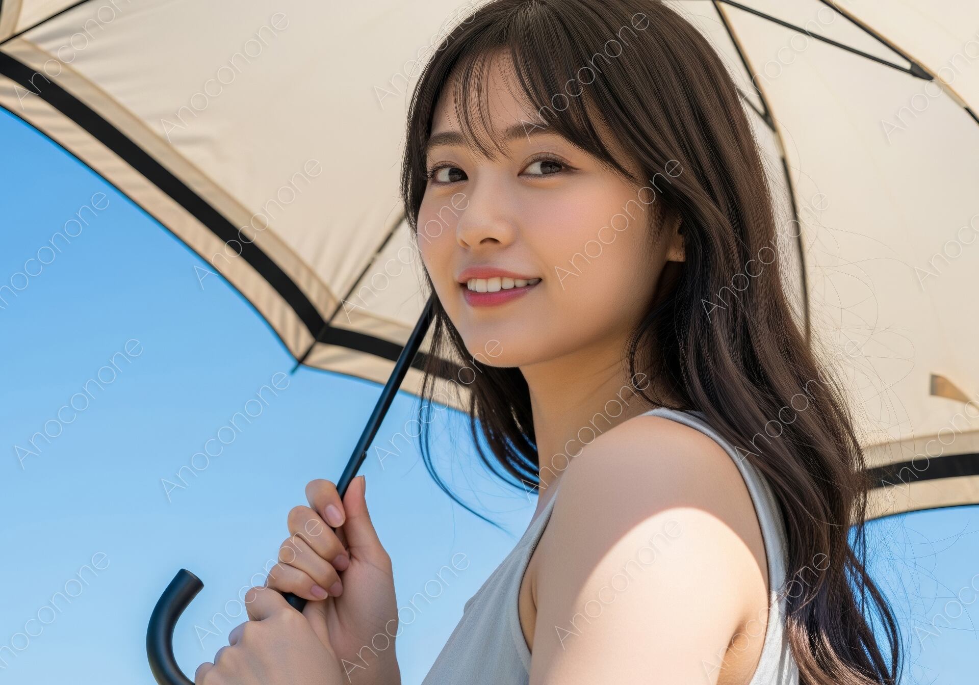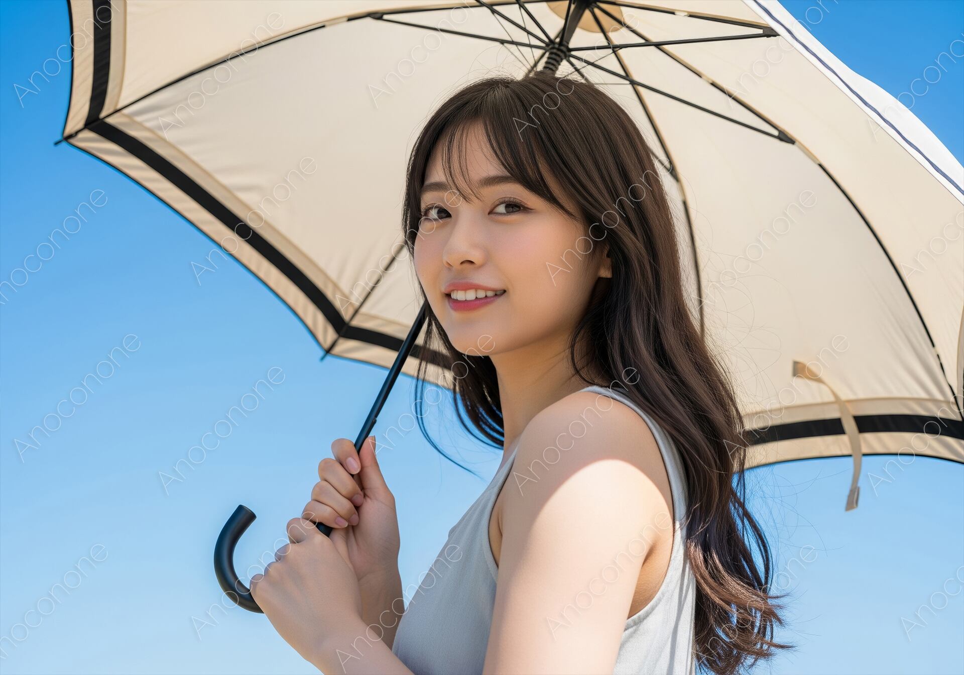 画像素材:雲一つない鮮やかな青空を背景に、ベージュの日傘を差して歩く女性の姿を捉えた一枚です。太陽の光を日傘で遮りながら、カメラに向かって穏やかに微笑む表情が印象的です。涼しげなグレーのノースリーブを着用しており、夏の爽やかな空気感が伝わってきます。日傘の影が女性の肩に落ちる様子が、暑い日の日差しをリアルに表現しており、日焼け対策や夏の過ごし方をイメージさせる構成となっています。背景の青と日傘の淡い色が絶妙な対比を生み出し、清潔感のある明るい雰囲気を作り出しています。風に軽く揺れる髪が、夏の屋外での自然なひとときをより魅力的に演出しています。スキンケアのプロモーションや、夏のお出かけをテーマにしたウェブサイトのメインビジュアルとして適しています。美容や健康に関連する広告素材としてもおすすめです。