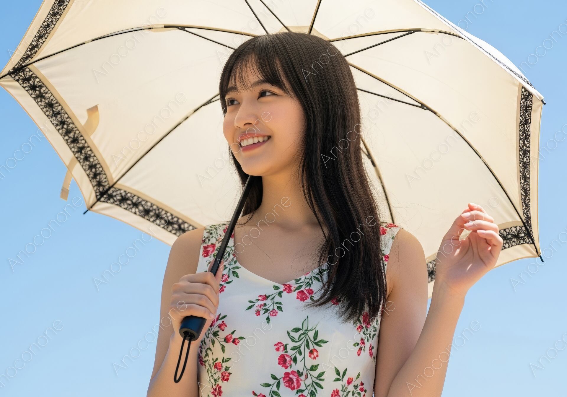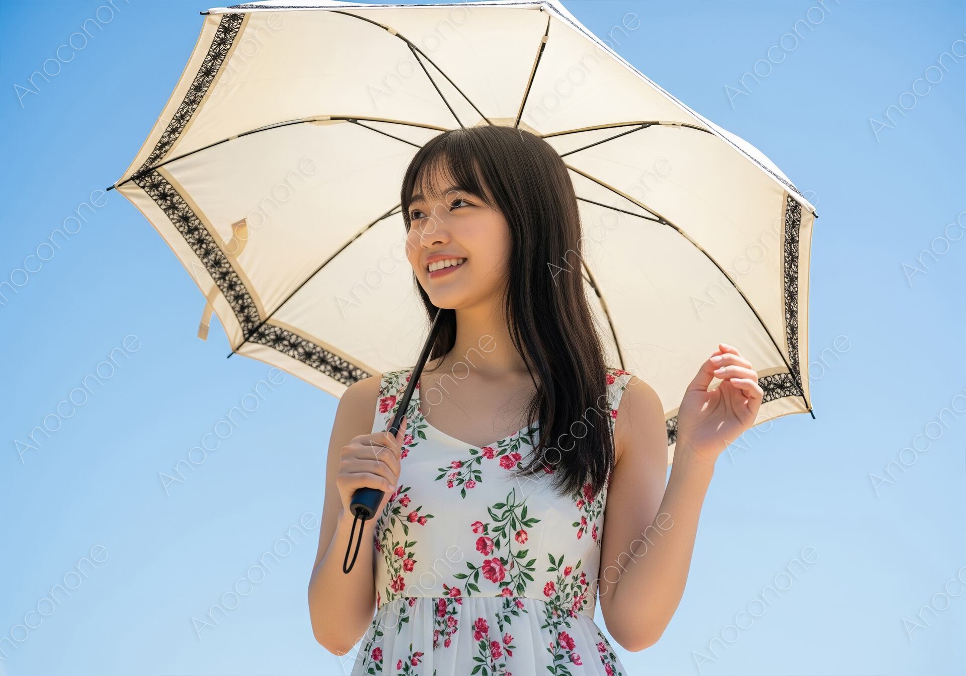 画像素材:抜けるような青空が広がる屋外で、繊細なレースの縁取りが施された日傘を差している女性の姿です。白地に赤い花柄が散りばめられたノースリーブのワンピースを着用しており、夏の陽光に映える爽やかなコーディネートが印象的です。日傘を手に持ちながら、視線を外して明るく微笑む表情からは、暑い日のお出かけを心から楽しんでいる様子が伝わってきます。太陽の強い光が日傘越しに柔らかく拡散され、女性の肌を健康的に美しく見せています。背景の澄んだ青色と白いワンピースのコントラストが清潔感を演出し、清涼感あふれる一枚に仕上がっています。夏のファッションや日焼け止め広告、お出かけをテーマにしたコラムなど、多岐にわたる媒体で使いやすい構成です。季節感を重視したビジュアル制作に最適な素材となっています。