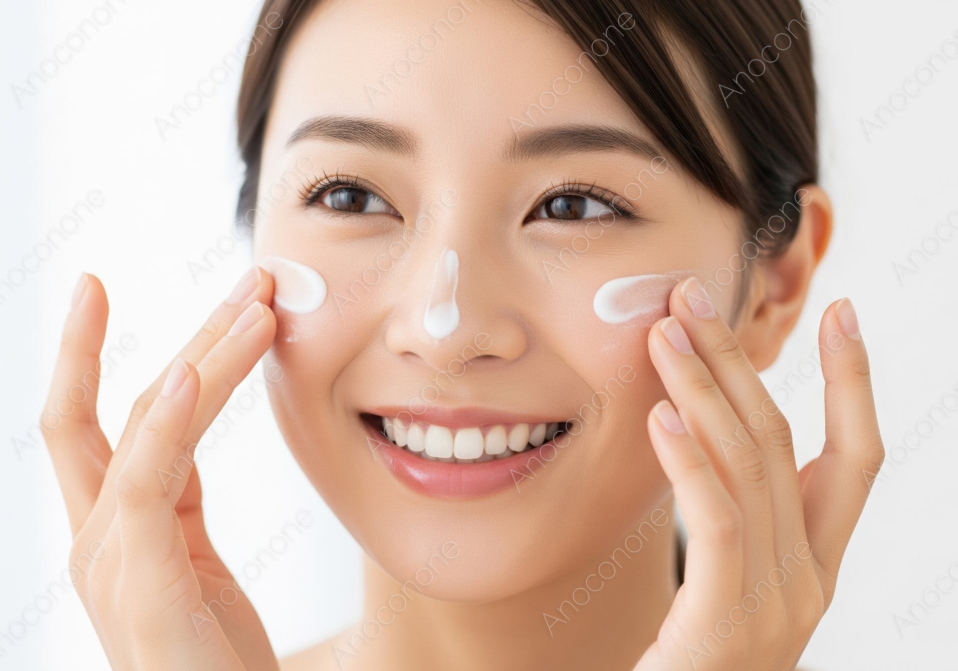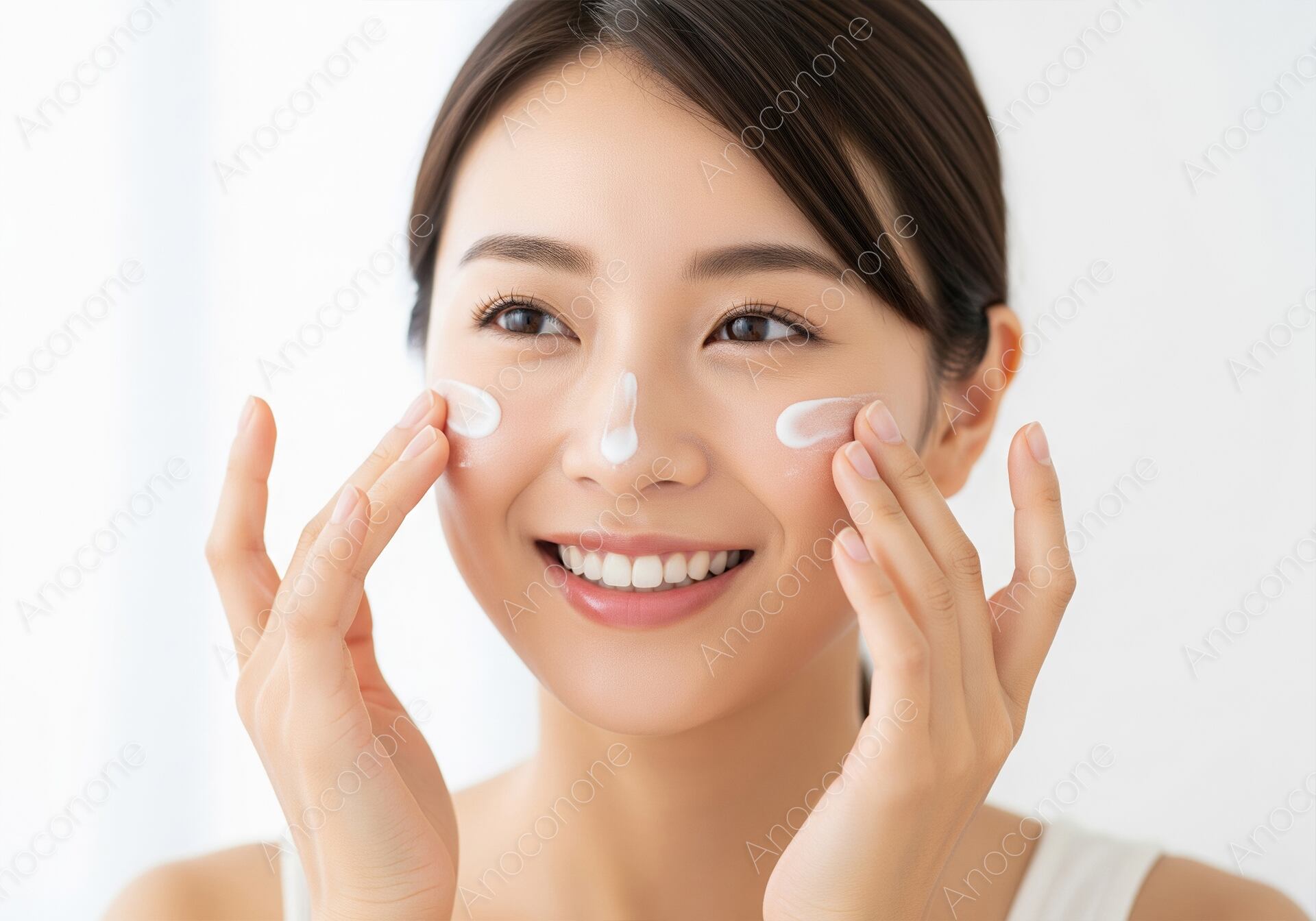 画像素材:清潔感のある明るい空間で、頬や鼻筋に白い美容クリームをのせて楽しくスキンケアを行っている女性のアップショットです。指先で優しくクリームを伸ばそうとする瞬間の、生き生きとした笑顔と輝くような白い歯が非常に印象的です。肌の質感は滑らかに整えられており、健康的で透明感のある美肌を強調する構成となっています。毎日の肌のお手入れをポジティブに楽しむ様子が伝わり、見る人に清潔で爽やかな印象を与えます。余計な背景を排したシンプルな構図は、化粧品や美容サービスの魅力をストレートに伝えるのに適しています。目元や口元の表情も自然で、親しみやすさと信頼感を兼ね備えたビジュアルです。化粧水の広告や美容ブログ、エステサロンのプロモーションなど、美を追求するあらゆるコンテンツで効果的に活用いただけます。毎日の美容習慣を提案するWebサイトのメイン画像としておすすめの一枚です。