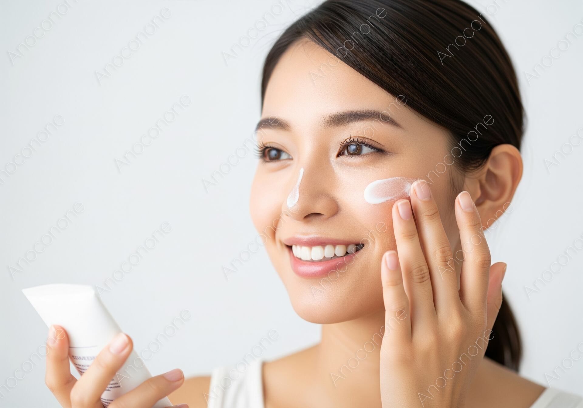 画像素材:白いチューブを手に持ち、頬や鼻筋に美容クリームをのせて明るく微笑む女性の表情を捉えた一枚です。クリームを指先で優しく馴染ませようとする動作が、毎日の丁寧なセルフケアの時間を象徴しています。健康的で透明感のある美肌が強調されており、潤いに満ちた健やかな肌の質感が画面越しに伝わってくる構成です。清潔感のある白い背景と明るい照明が、美容に対するポジティブなイメージをさらに引き立て、信頼感のあるビジュアルに仕上がっています。女性の自然な笑顔は、肌のお手入れがもたらす心のゆとりや満足感を表現しており、見る人に爽やかな印象を与えます。化粧品ブランドの広告素材や、美容情報サイトのコラム、スキンケア方法を解説するSNS投稿のメイン画像として幅広く活用いただけます。新しい美容習慣を提案するプロモーションに最適な高品質素材です。