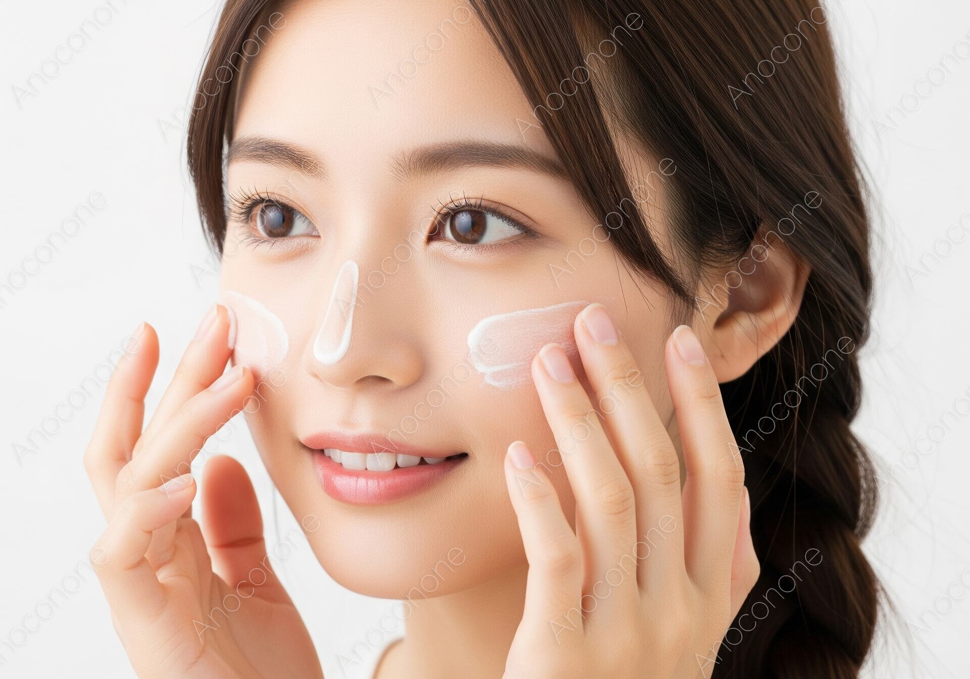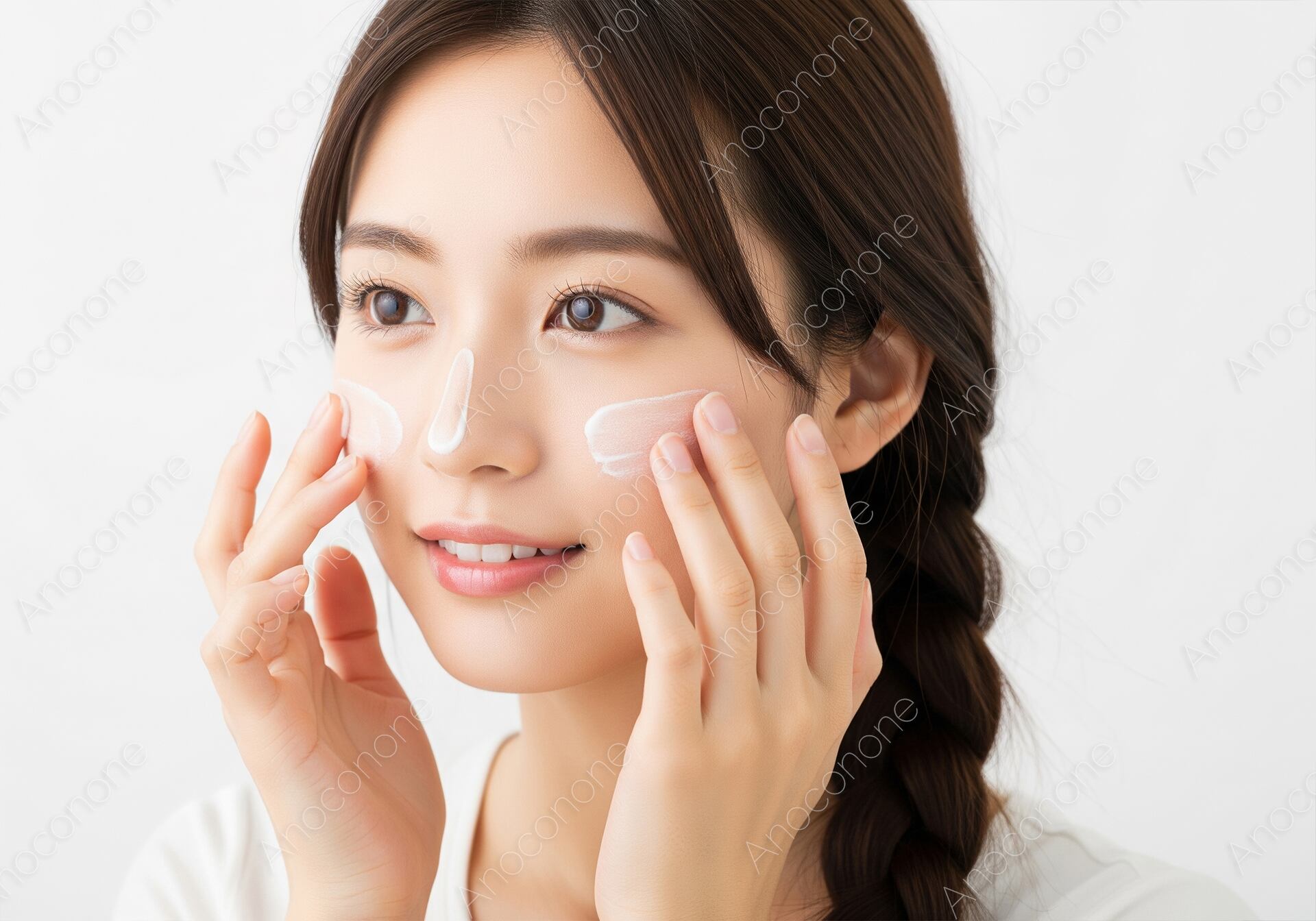 画像素材:清潔感のある白い背景の前で、三つ編みに結った髪が可愛らしい女性がスキンケアに励んでいる場面です。頬や鼻筋に白い美容クリームを丁寧に乗せ、指先で優しく肌に馴染ませようとする自然な動作を捉えています。女性の穏やかな微笑みからは、自分自身を大切にするセルフケアの時間の充実感が伝わってきます。健康的でキメの整った素肌が強調されており、潤いと透明感に満ちた肌の質感を視覚的に訴えかける構成です。明るく均一なライティングが施されているため、化粧品のテクスチャーや肌のコンディションが分かりやすく、信頼感のあるビジュアルに仕上がっています。美容コラムのアイキャッチ画像や、保湿クリームのプロモーション、スキンケア方法を紹介するカタログなど、美容に関する幅広い媒体で活用いただけます。日々の丁寧な暮らしや自分磨きを大切にする層に向けた広告素材として最適です。
