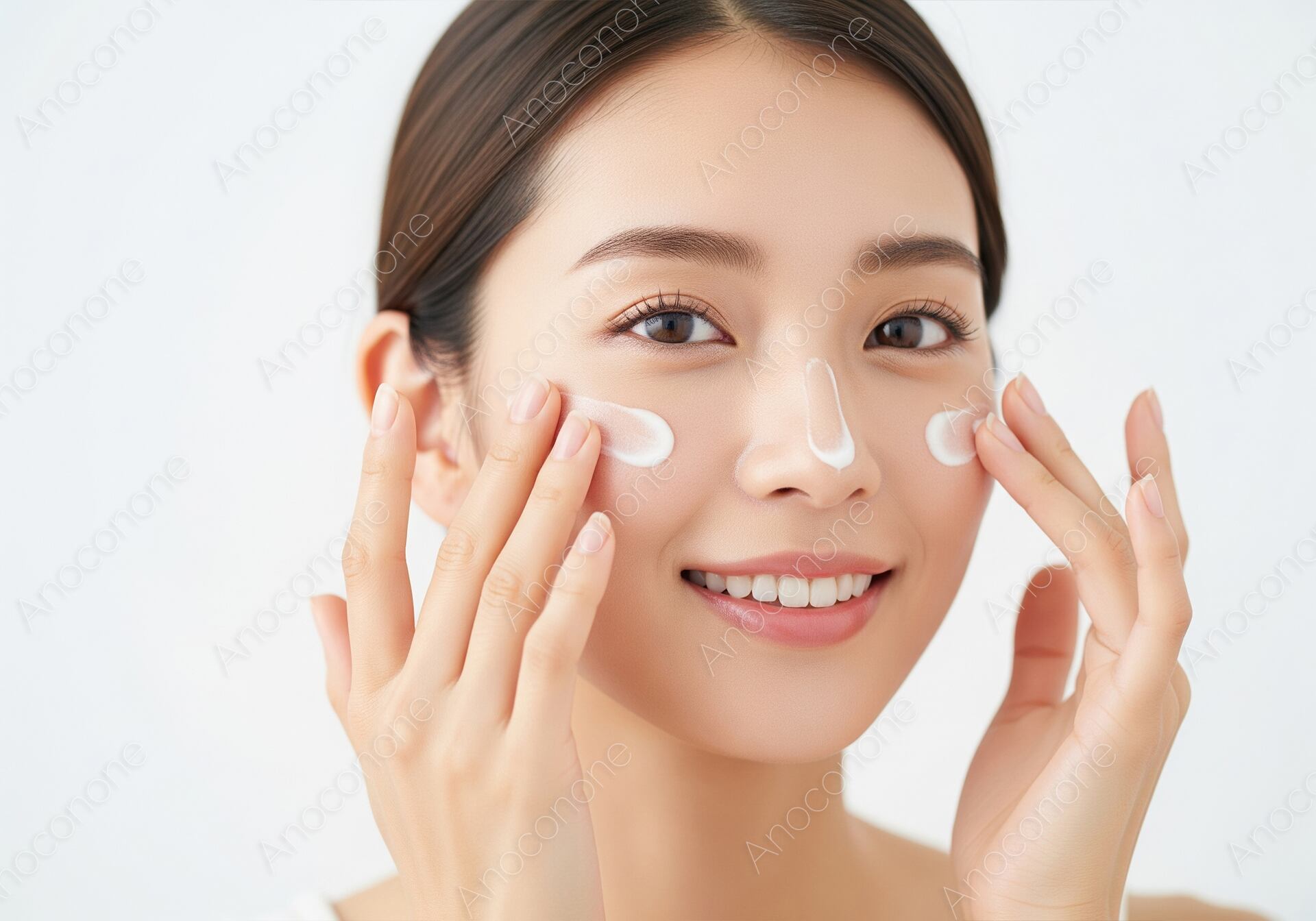 画像素材:明るい清潔感のある背景で、頬や鼻筋に乗せた白い美容クリームを指先で優しく伸ばしている女性のポートレートです。自分自身の肌を丁寧にケアする時間を楽しんでいるような、自然で明るい笑顔がとても印象的な一枚です。きめ細やかで透明感のある美肌が強調されており、潤いに満ちた健康的な肌質が視覚的に伝わってくる構成になっています。目元や口元の表情からは、日々のスキンケアを通じた心地よさや充実感が溢れています。余計な装飾を省いたシンプルな構図により、美容クリームの質感や肌の美しさがより際立って見えます。化粧品ブランドのメインビジュアルや、美容法を解説するWebサイト、スキンケア商品のパッケージ広告など、清潔感と信頼性が求められる媒体に最適です。日々のセルフケアを大切にする幅広い世代に向けた、訴求力の高い高品質な素材です。
