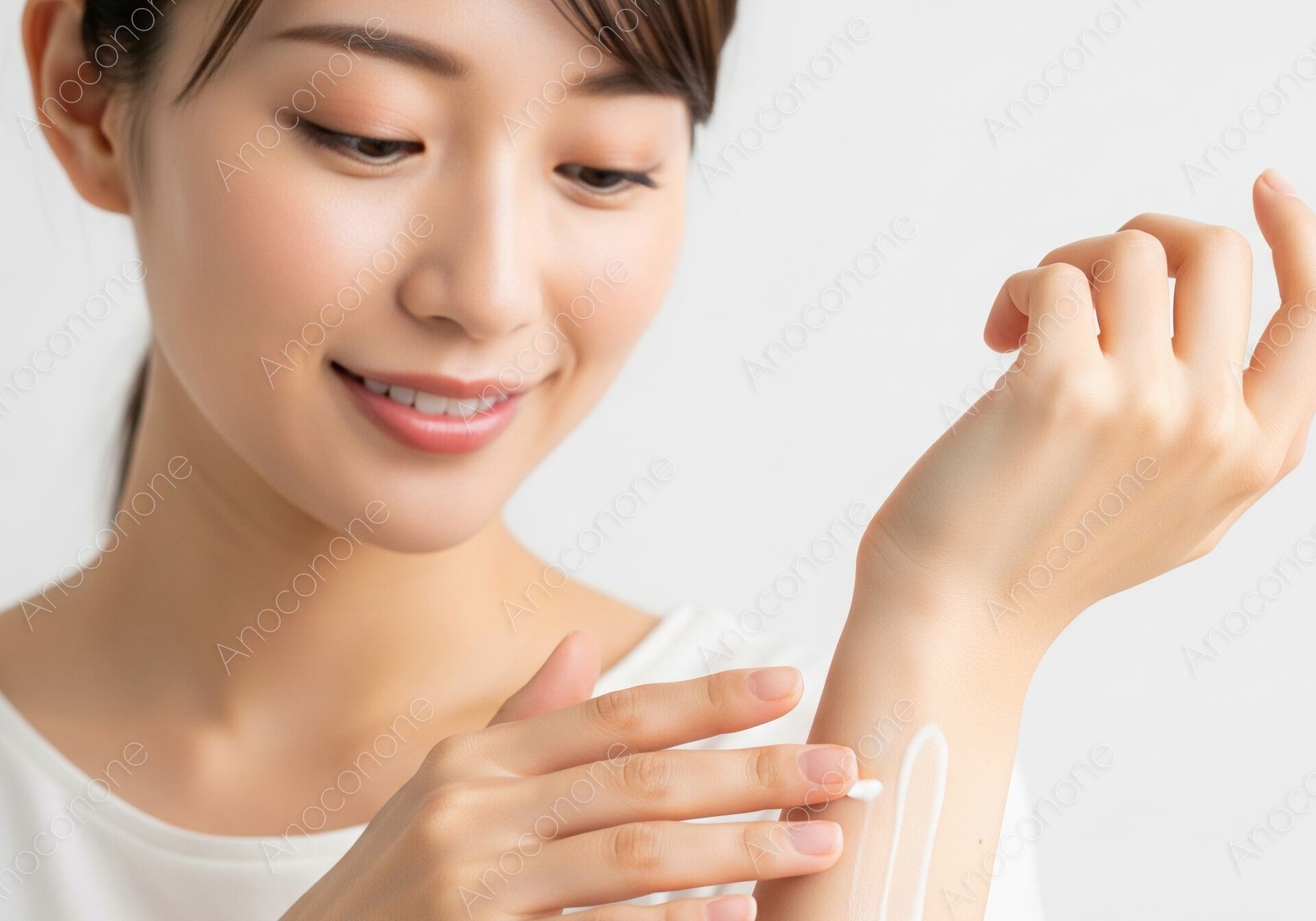 画像素材:清潔感のある白い服を着用した女性が、自身の腕に白いクリームを乗せて丁寧に塗り広げている場面を捉えた一枚です。クリームの柔らかな質感を指先で確かめるような仕草と、その使い心地に満足しているような穏やかな微笑みが、見る人に安心感を与えます。健康的で滑らかな肌の質感が強調されており、保湿ケアによる瑞々しさが視覚的に伝わる構成になっています。明るく均一なライティングが施されているため、商品のテクスチャーや肌のコンディションが非常に分かりやすく、美容関連のプロモーションに最適です。余計な背景を排したシンプルな構図は、ボディケア用品の広告や、正しいケア方法を解説するWebサイト、カタログの素材として幅広く活用いただけます。日常のセルフケアを大切にする丁寧な暮らしをイメージさせるビジュアルです。美容や健康に関心の高い層へ向けた広告素材としておすすめします。