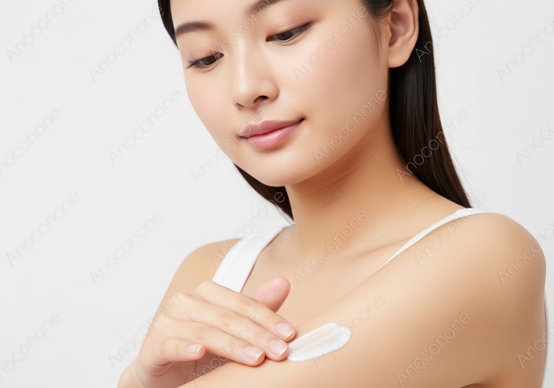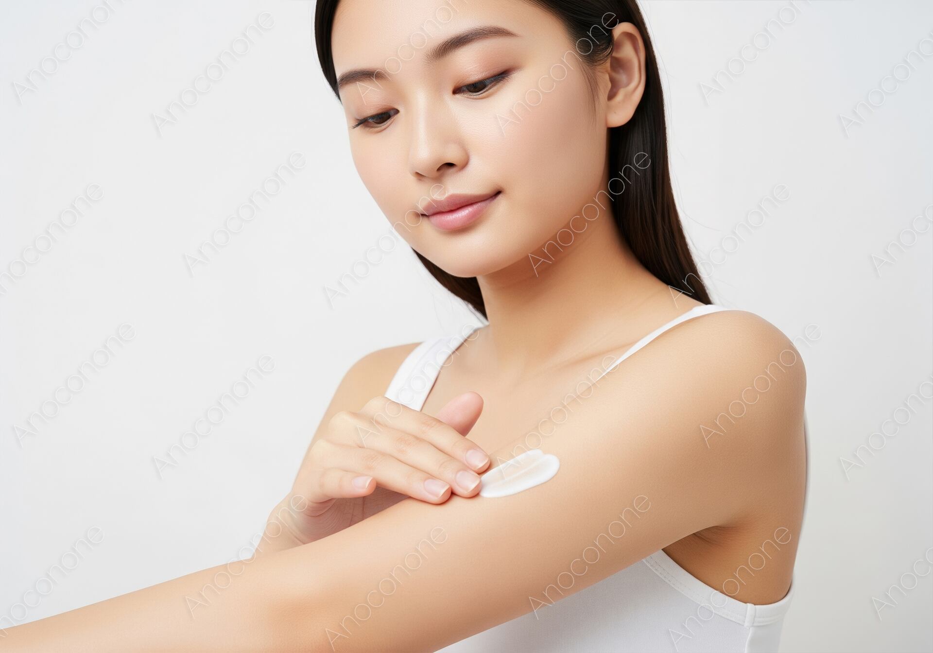 画像素材:清潔感のある白いタンクトップを着用した女性が、自身の腕に白い保湿クリームを乗せて丁寧に塗り広げている場面です。視線を自分の腕に落とし、クリームを肌に馴染ませることに集中している表情からは、日々のセルフケアを大切にしている様子が伺えます。健康的でキメの整った滑らかな肌が強調されており、潤いに満ちた健やかな美肌を視覚的に訴えかける構成です。明るく均一なライティングが施されているため、商品のテクスチャーや肌のコンディションが非常に分かりやすく、信頼感のあるビジュアルに仕上がっています。余計な背景を排したシンプルな構図により、被写体の美しさとケアの動作に自然と視線が集まります。ボディローションやハンドクリームの広告素材、美容情報サイトのコラム、エステサロンの販促用ビジュアルなど、美容に関する幅広い媒体で効果的に活用いただけます。丁寧な暮らしや自分磨きを提案するコンテンツ制作に最適な一枚です。