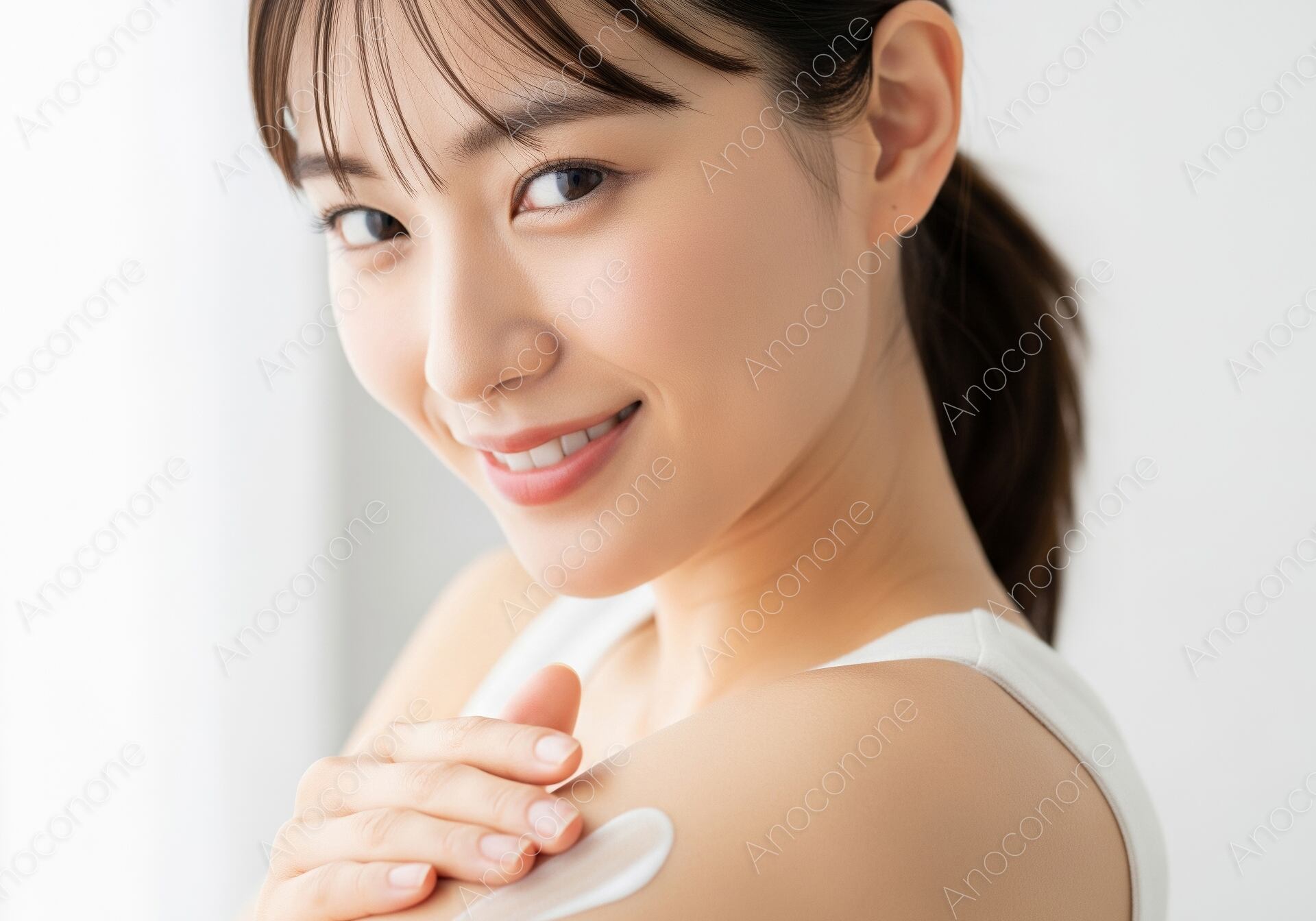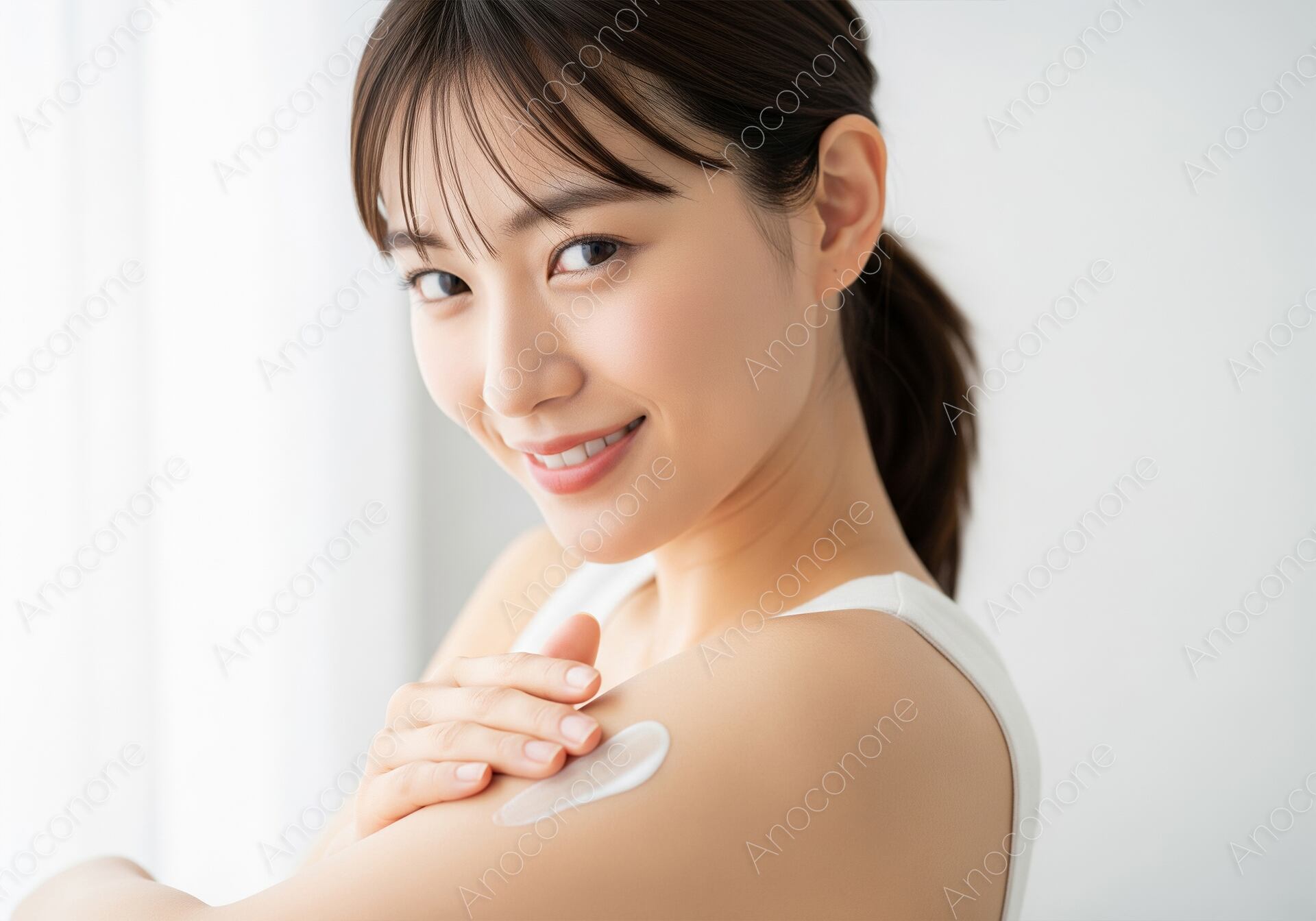 画像素材:清潔感のある白いタンクトップを身にまとい、自身の肩に白いクリームを優しく塗り込んでいる女性の姿を捉えた一枚です。カメラの方へ向けられた穏やかな微笑みと、潤いに満ちた健康的な肌の質感が、日々の丁寧なセルフケアの時間を象徴しています。窓際からの柔らかな光が被写体を包み込み、透明感あふれる素肌の美しさをより一層引き立てる構成となっています。指先でクリームを馴染ませる自然な仕草は、見る人に清潔感と安らぎを与え、美容に対するポジティブなイメージを抱かせます。背景はシンプルにまとめられており、女性の明るい表情と手元のケアの様子が主役として際立っています。ボディローションや保湿アイテムの広告、スキンケア方法を提案するコラム、ライフスタイル雑誌の挿絵など、幅広い用途で活用いただける高品質な素材です。美容に関心の高い層に向けたプロモーションに最適な一枚です。