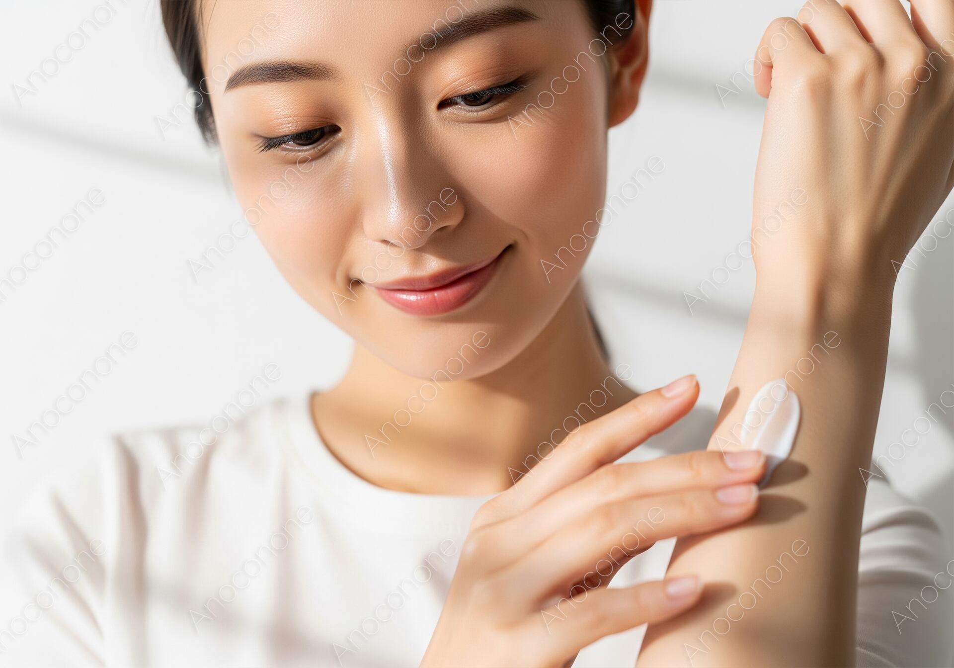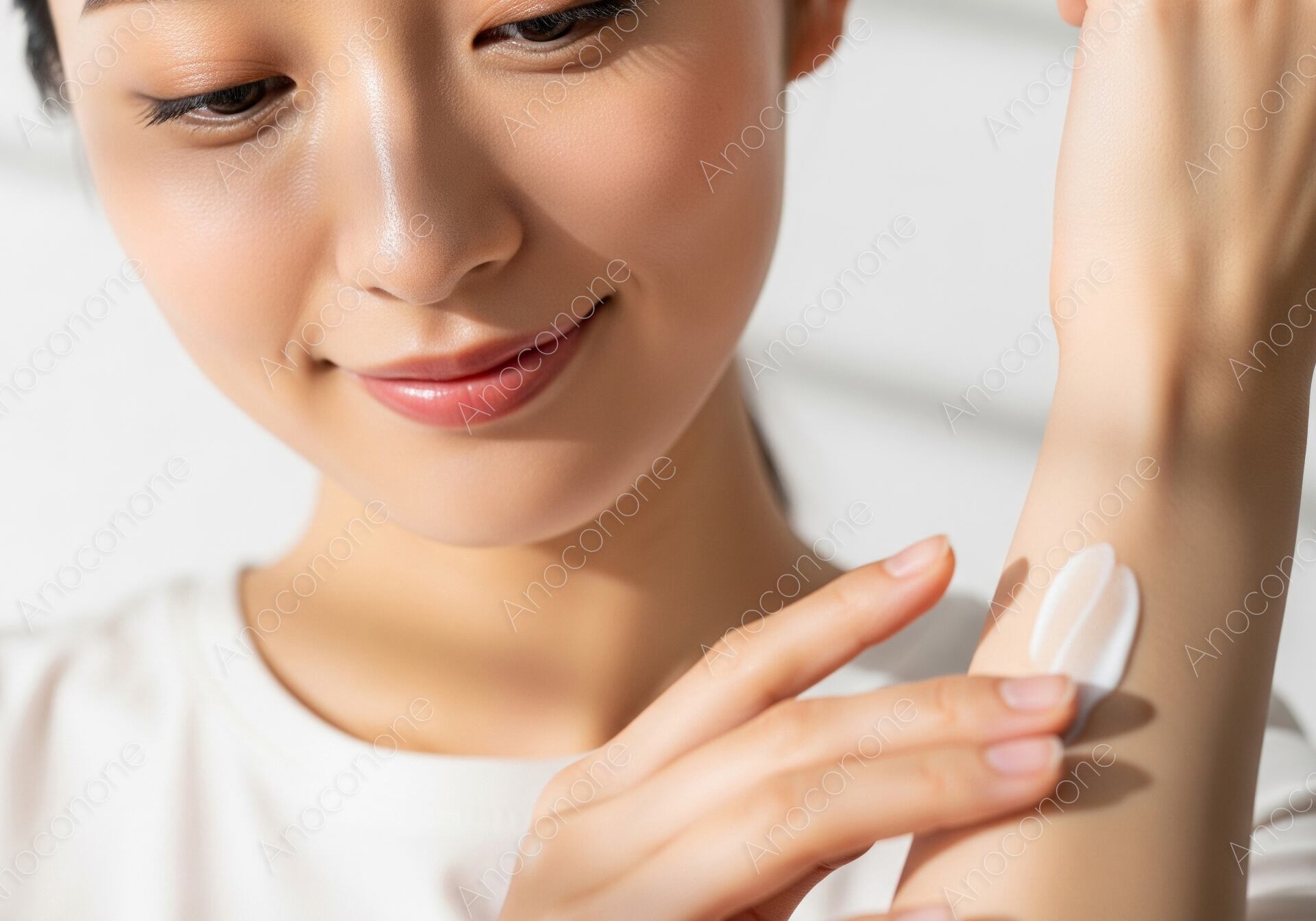 画像素材:清潔感のある白い服を身にまとった女性が、自身の手首に白いクリームをのせて、その質感を丁寧に確かめている場面を捉えた一枚です。視線を優しく手元に落とし、クリームを指先で馴染ませようとする動作からは、日々のセルフケアを大切にしている穏やかな心のゆとりが伝わってきます。健康的で滑らかな肌の質感が強調されており、保湿ケアによって潤いが増していく様子を視覚的に訴えかける構成です。明るい光が差し込む中で撮影されたビジュアルは、清潔感とナチュラルな美しさを兼ね備えており、見る人に安心感を与えます。余計な背景を排したシンプルな構図により、クリームの柔らかなテクスチャーと肌の瑞々しさが際立っています。ボディローションやハンドクリームのプロモーション、正しい保湿方法を解説するWebコンテンツ、美容雑誌の素材として幅広く活用いただけます。質の高いセルフケアを提案する広告制作に最適な一枚です。