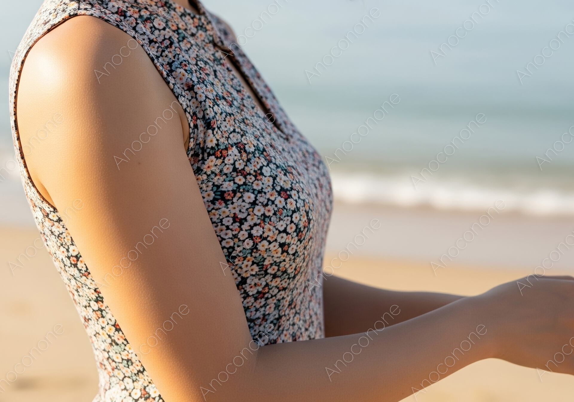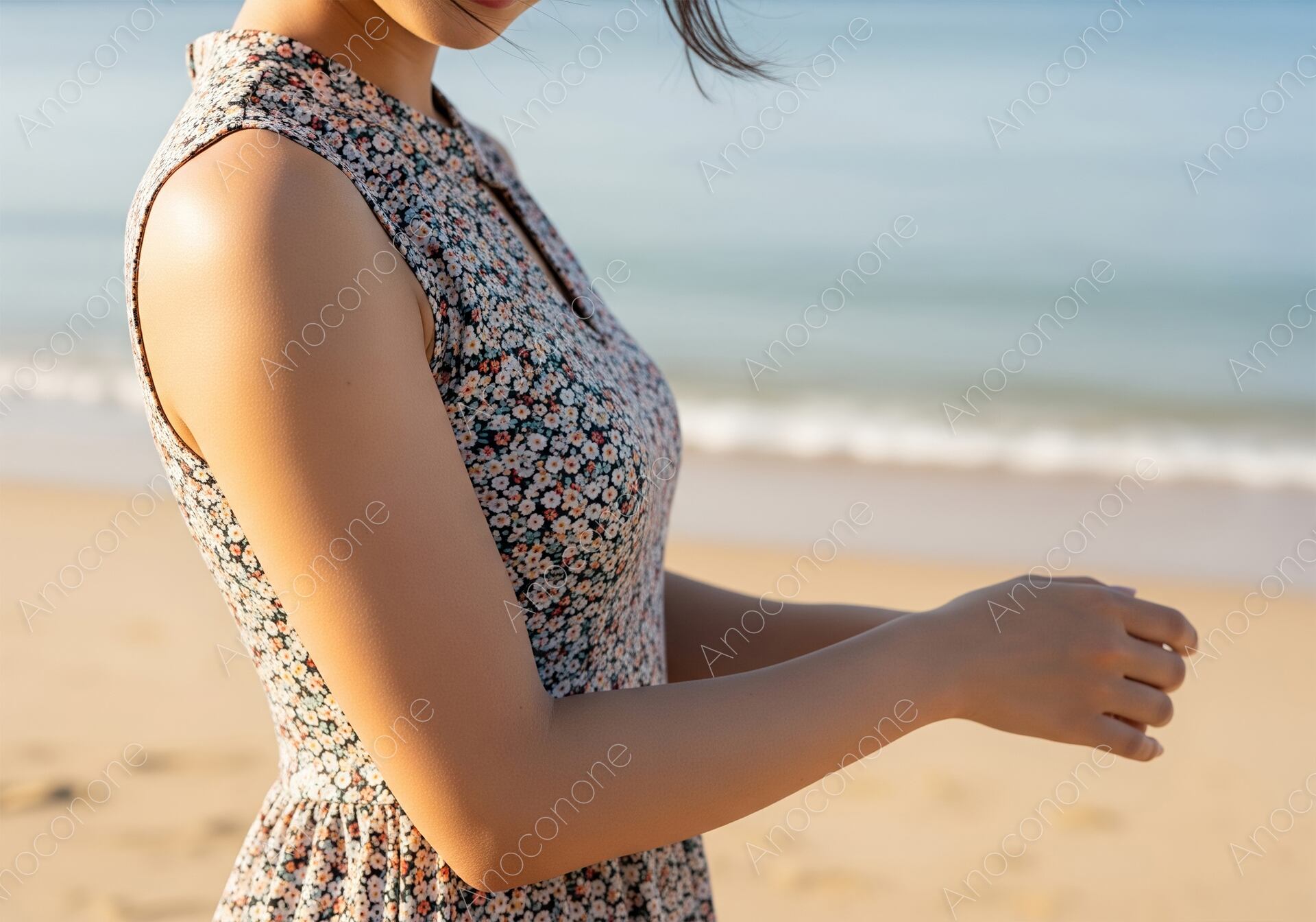 画像素材:明るい太陽の光が降り注ぐ夏の砂浜で、上品な小花柄のノースリーブワンピースを身にまとう女性のサイドビューを捉えた一枚です。背景には穏やかに波打つ青い海と広大な砂浜が広がっており、開放感あふれるビーチリゾートの雰囲気が存分に漂っています。日差しを浴びて健康的に輝く肌の質感が美しく、自然体でバカンスを満喫する大人の休日をイメージさせる構成となっています。落ち着いたトーンの花柄ワンピースが、夏の海辺の景色に知的な彩りを添え、爽やかで上品な印象を与えます。ふとした瞬間を切り取ったような横向きのポーズは、波音を聞きながらゆったりとしたひとときを楽しんでいる空気感を演出しています。全体的に明るくナチュラルな色調でまとめられており、見る人に清涼感と安らぎを感じさせます。夏のファッション雑誌のコラムや、旅行サイトのイメージ画像、日焼けケア用品のプロモーションなど、多岐にわたる用途で活用いただけます。季節の魅力を伝えるビジュアルとしておすすめの素材です。