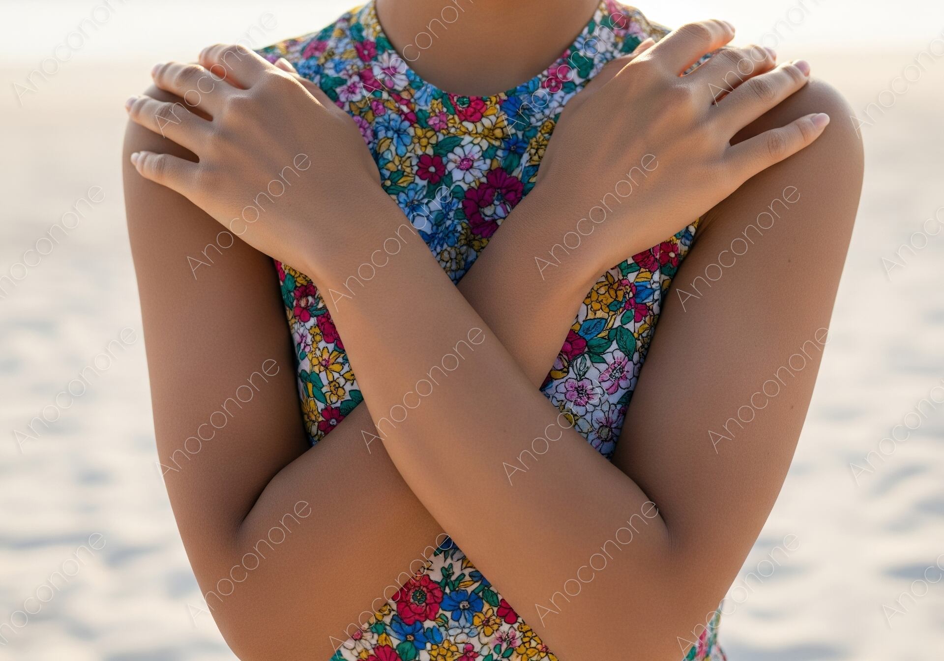 画像素材:柔らかな光が差し込む夕暮れ時の砂浜で、色鮮やかな花柄のノースリーブワンピースを身にまとった女性が、両手をクロスさせて肩を抱くように佇んでいる様子を捉えた一枚です。背景には穏やかに波打つ海と広大な砂浜が広がっており、一日を締めくくる静かなビーチリゾートの情緒が漂っています。日差しをたっぷりと浴びて健康的に輝く肌の質感が美しく、自然体でバカンスを楽しむ大人の休日をイメージさせる構成となっています。ワンピースの華やかな模様が、落ち着いたトーンの砂浜に鮮やかな彩りを添え、爽やかで活動的な印象を与えます。自分自身をいたわるようなポーズは、波音を聞きながらゆったりとしたひとときを楽しんでいる空気感を演出しています。全体的に温かみのあるナチュラルな色調でまとめられており、見る人に季節感と安らぎを感じさせます。夏のファッション雑誌のコラムや、旅行サイトのイメージ画像、日焼け後のアフターケア用品のプロモーションなど、多岐にわたる用途で活用いただけます。季節の魅力を情緒豊かに伝えるビジュアルとしておすすめの素材です。